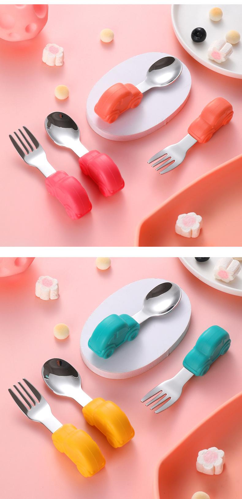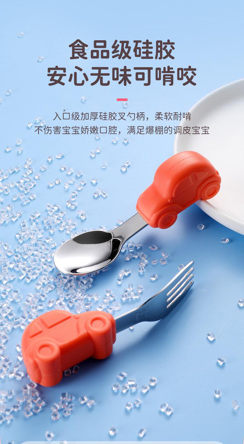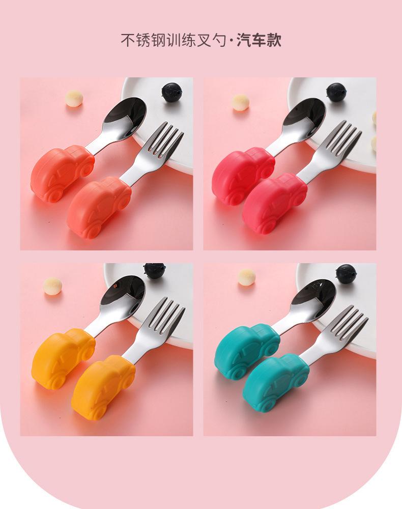 Bebê comendo colher punho curto aço inoxidável carro silicone garfo colher de treinamento do bebê louça de mesa de alimentação suplementar das crianças pacote de colher de alimento suplementar