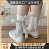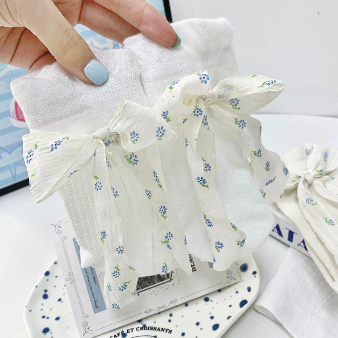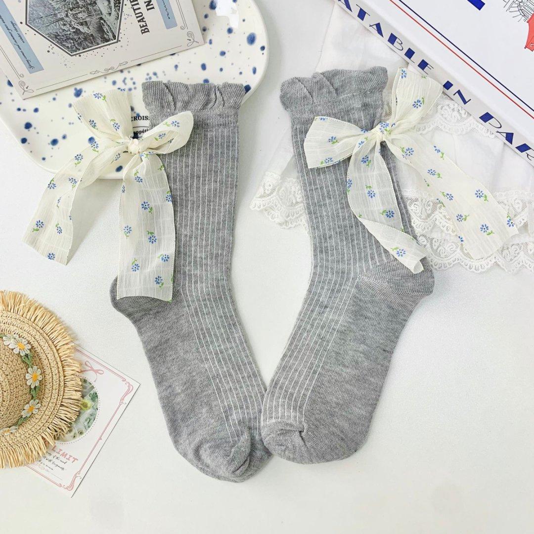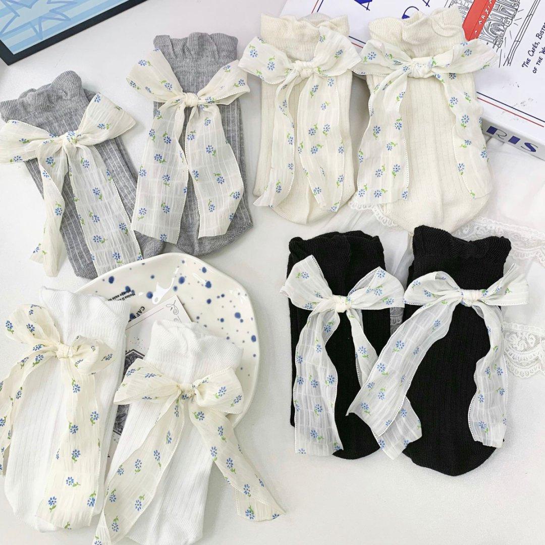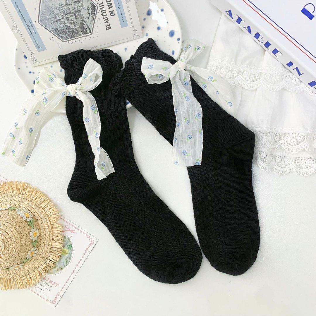 Meias Femininas de Meia Panturrilha com Laço Floral Primavera Verão Malha Fina Respirável Atmosfera Estilo Coreano Menina Renda Meias Franzidas
