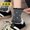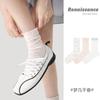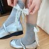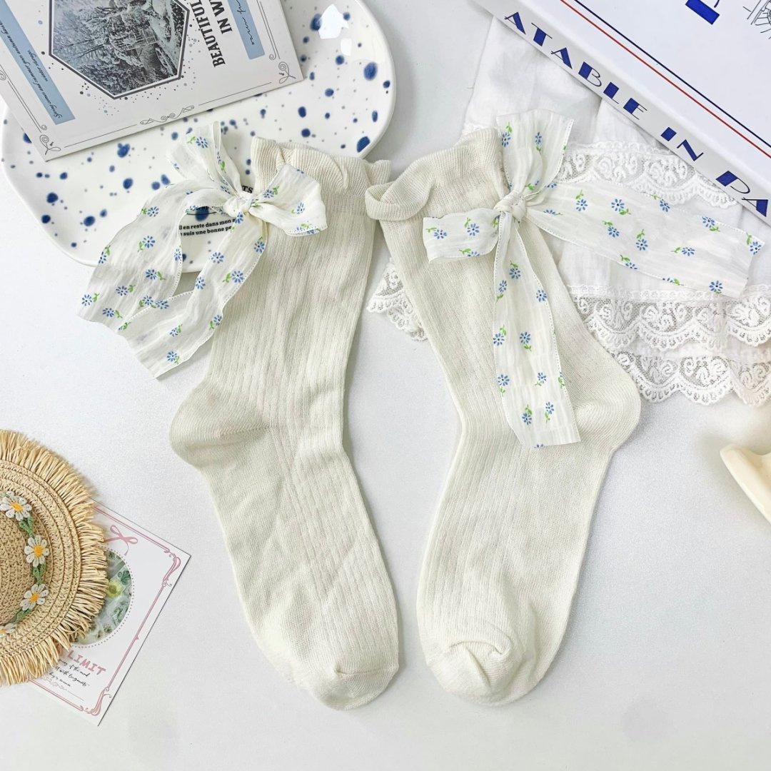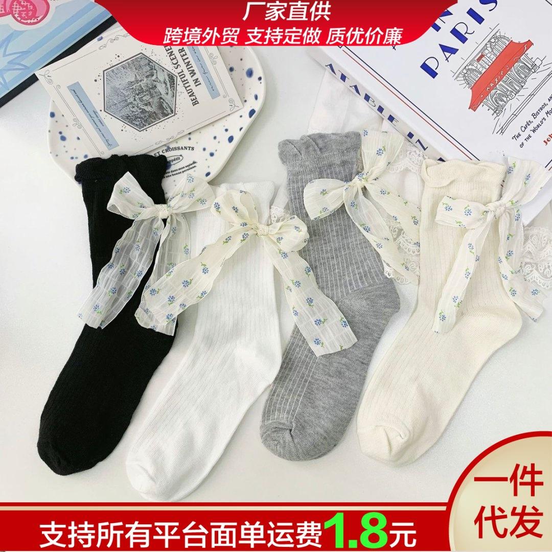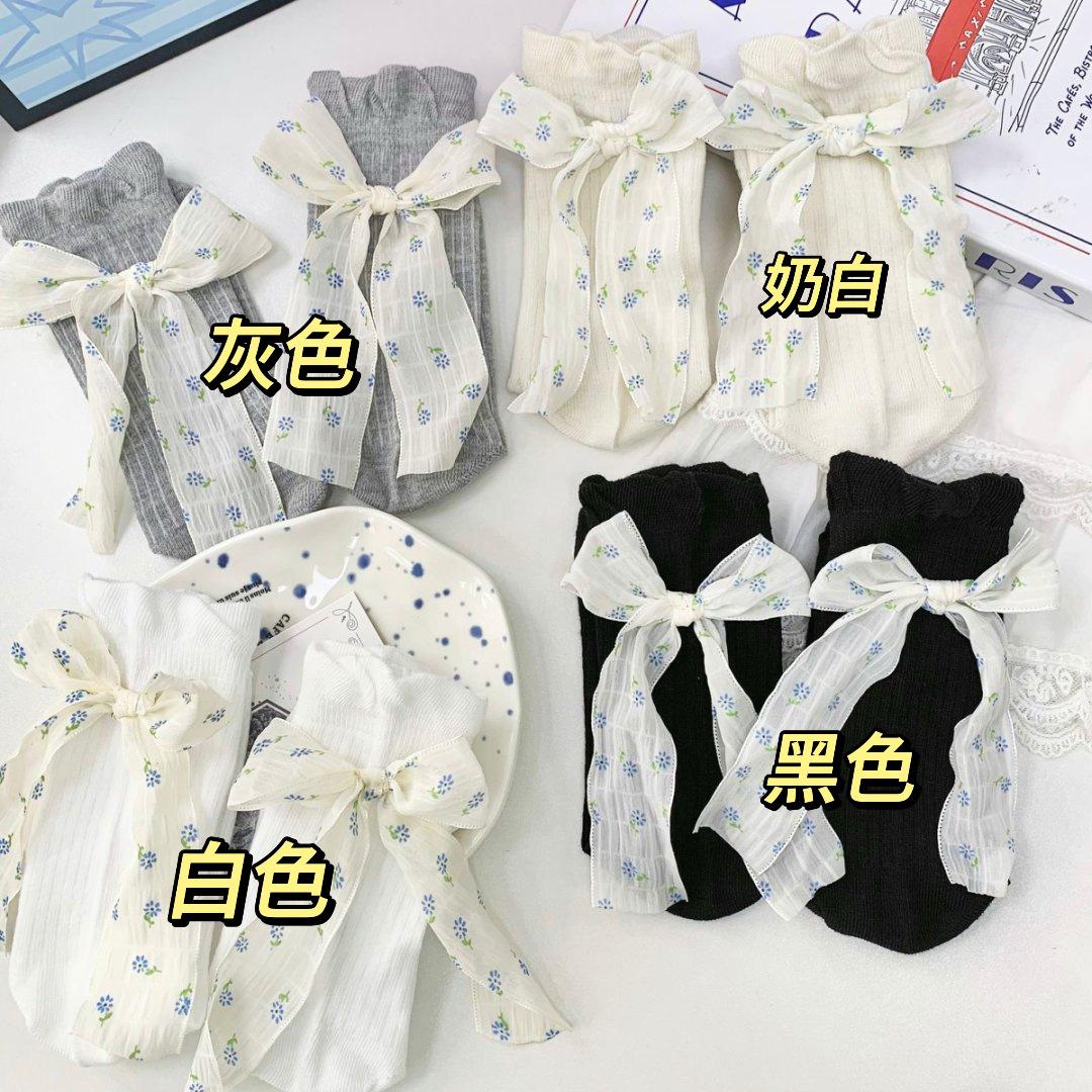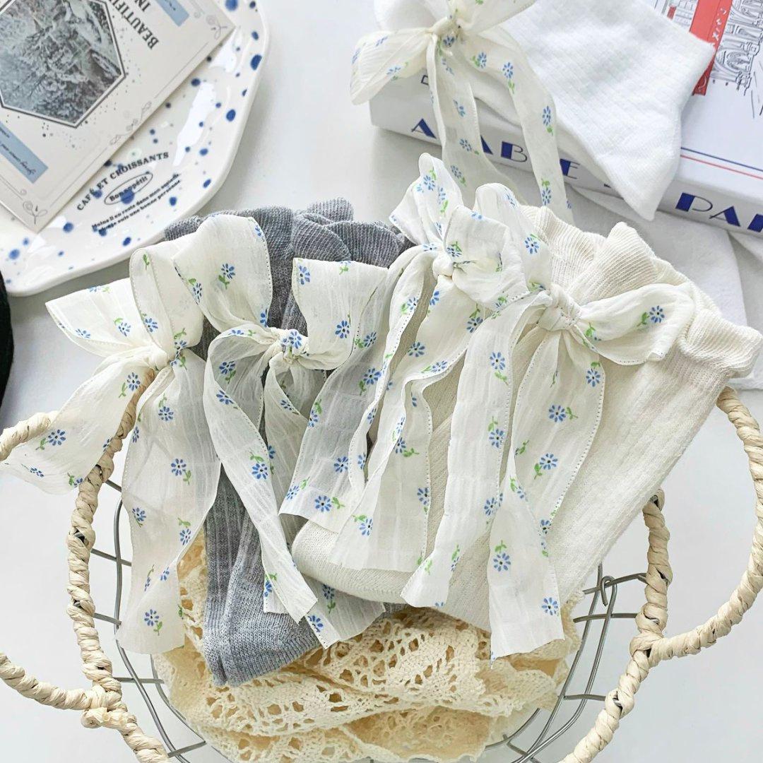 Meias Femininas de Meia Panturrilha com Laço Floral Primavera Verão Malha Fina Respirável Atmosfera Estilo Coreano Menina Renda Meias Franzidas