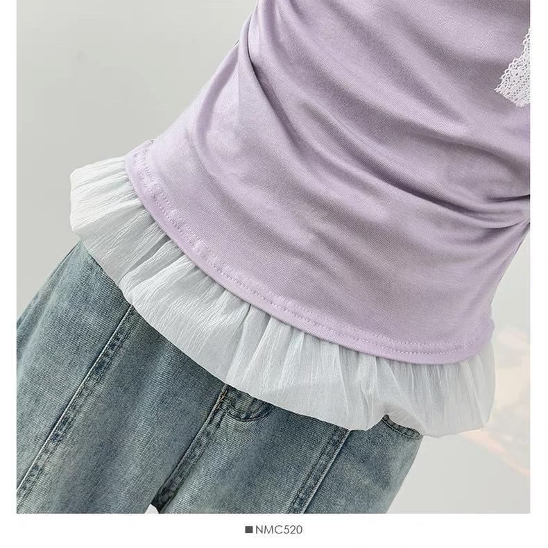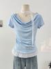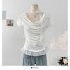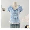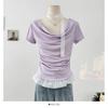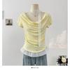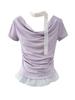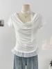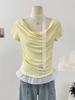 Design-Sense Costura Babados Gola Balanço Manga Curta Verão Doce Babado Slim-Fit Emagrecimento Pequeno Top Feminino da Moda