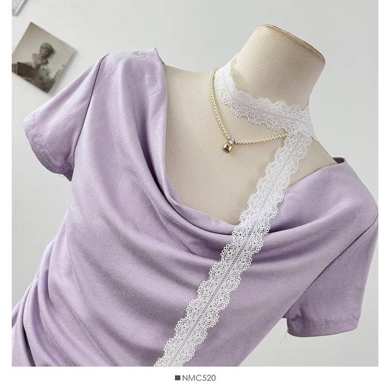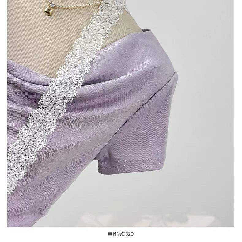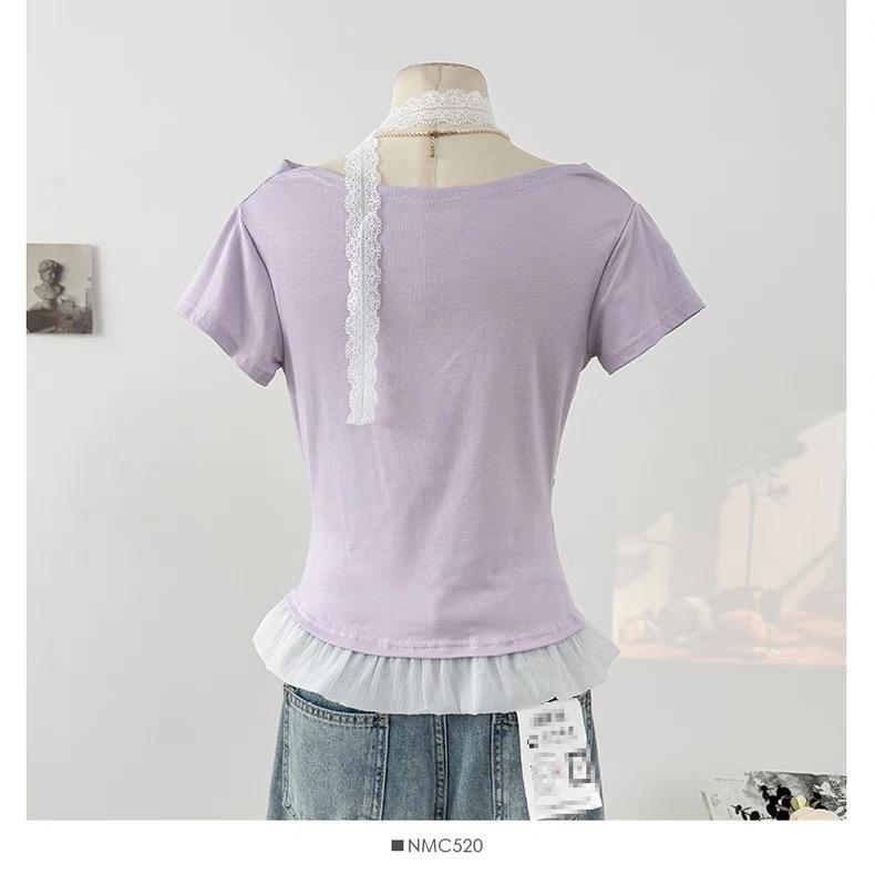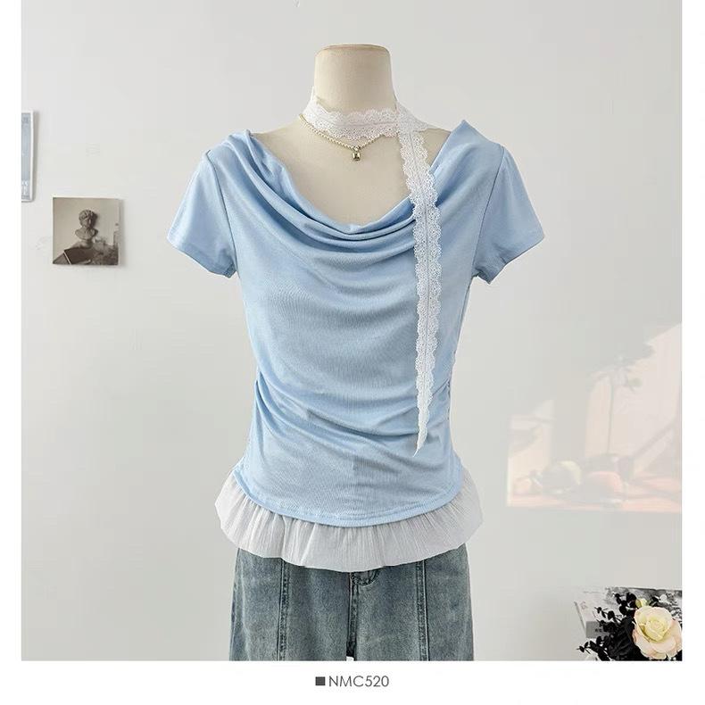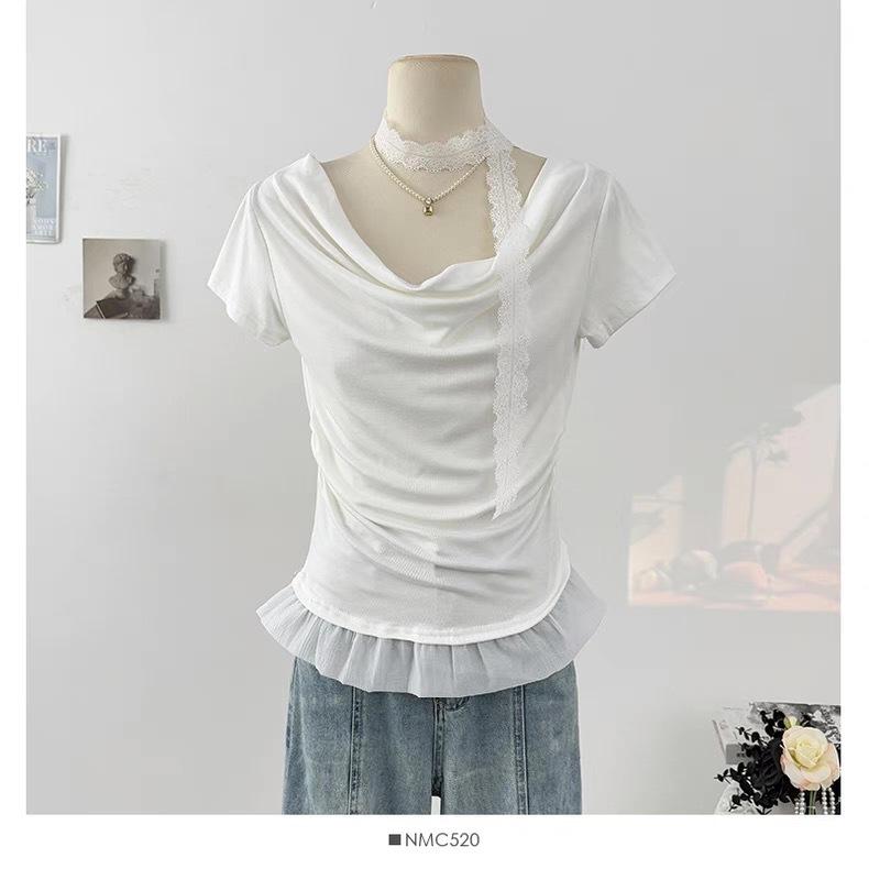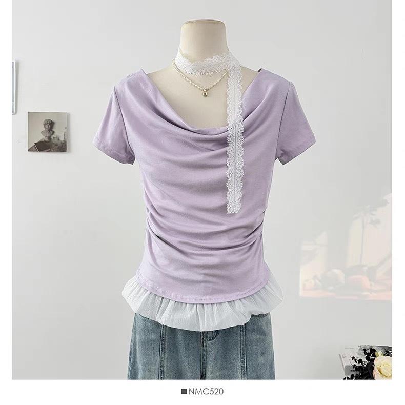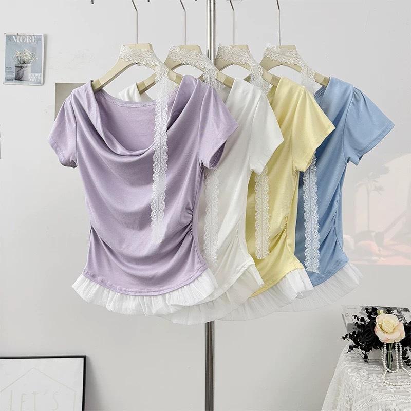 Compre Design-Sense Costura Babados Gola Balanço Manga Curta Verão Doce Babado Slim-Fit Emagrecimento Pequeno Top Feminino da Moda no atacado no Joom.pro