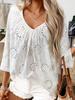 Amazon 2025 Novo Top Feminino Transfronteiriço Europeu e Americano com Ilhós Decote V Manga Borboleta Vazado Renda Bordada Camisa