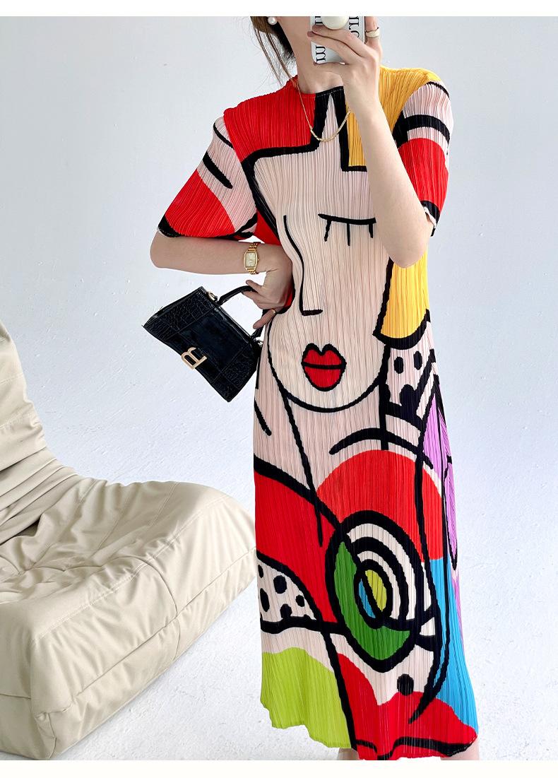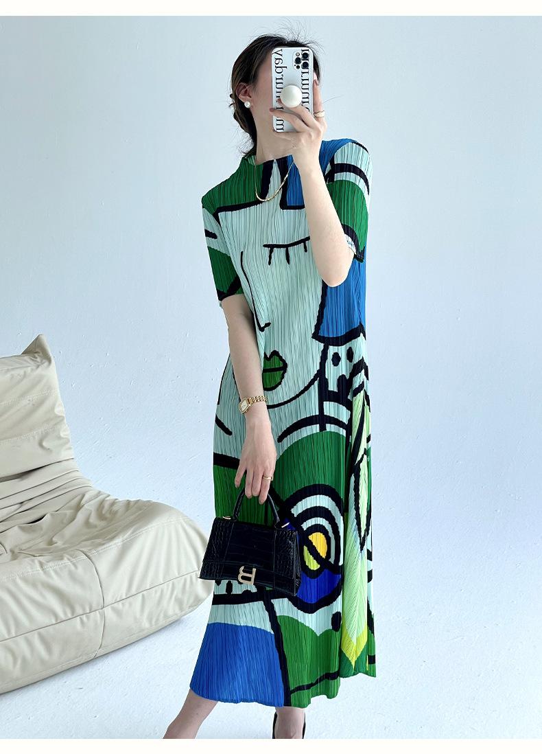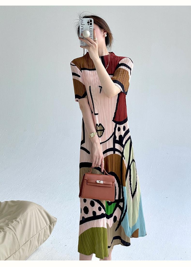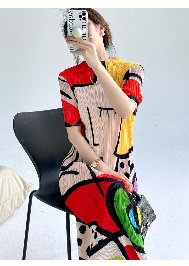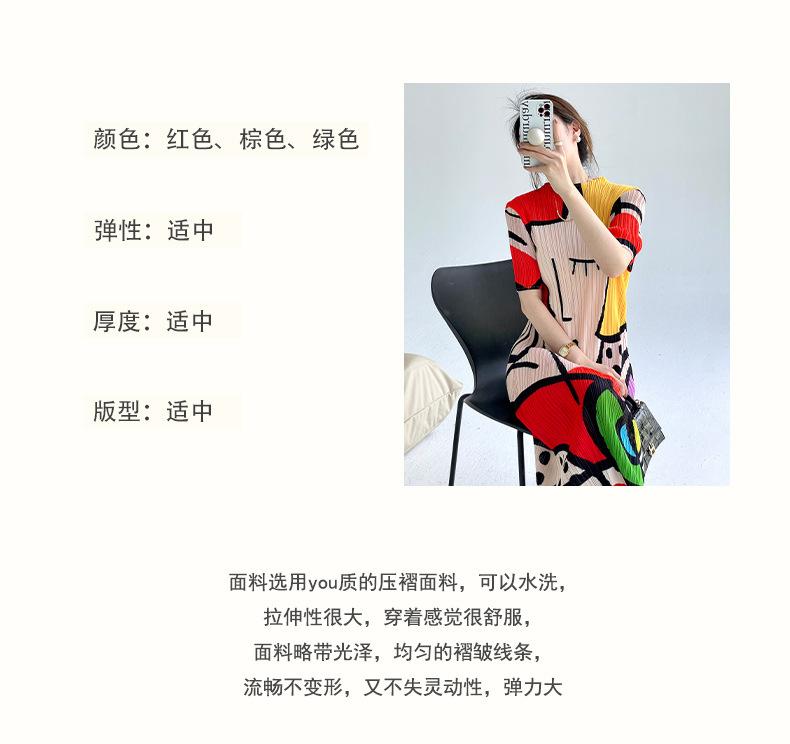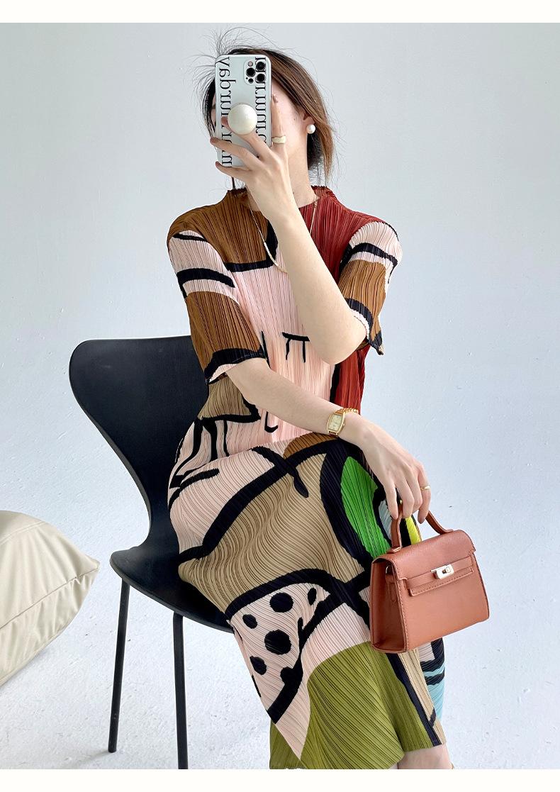 Miyake 2025 Nova Moda Verão Design Estampado Vestido Plissado de Manga Curta Elegante Elegante Slim Saia Midi
