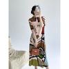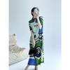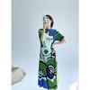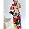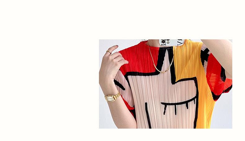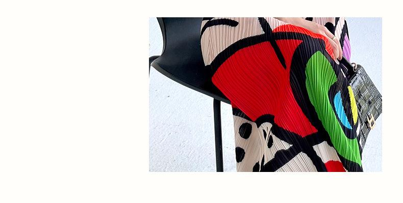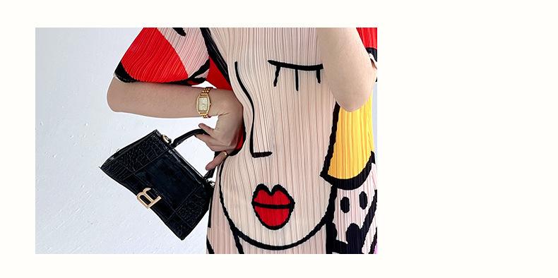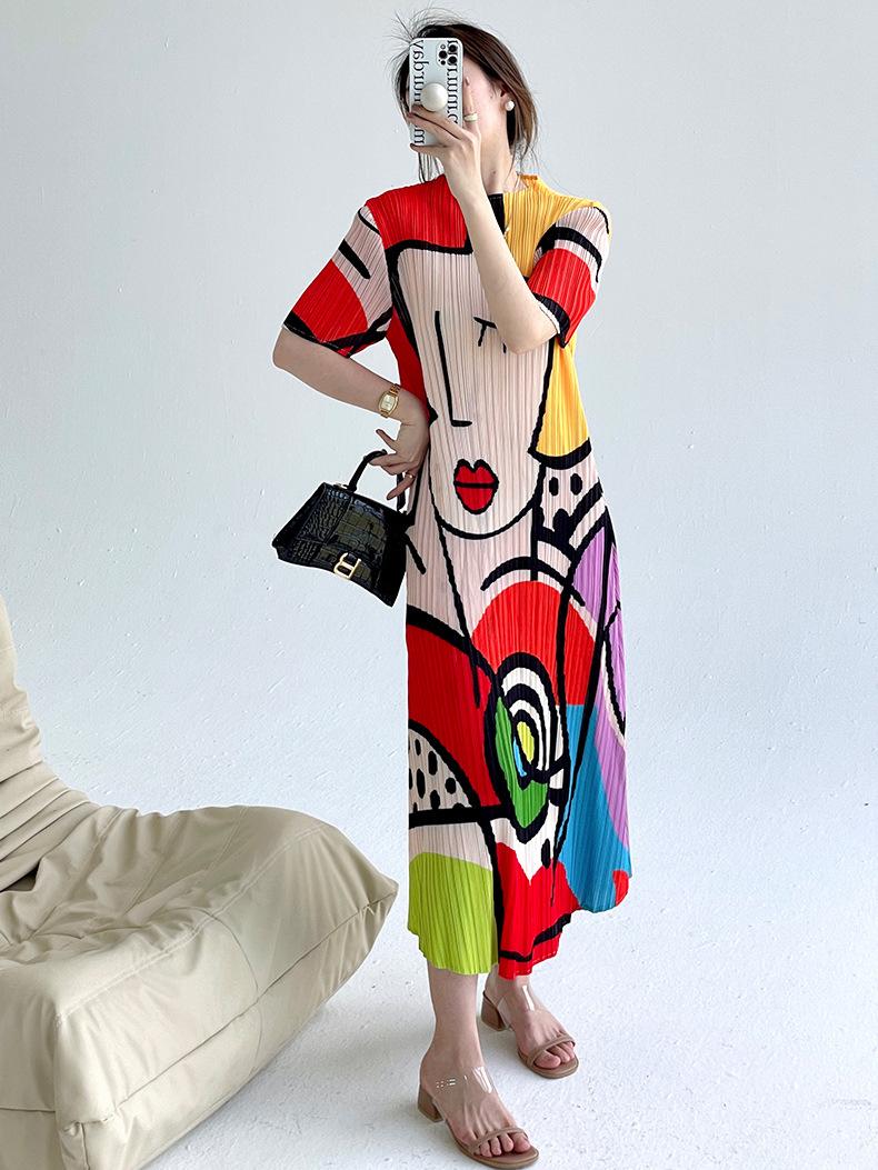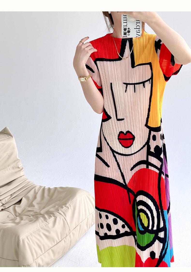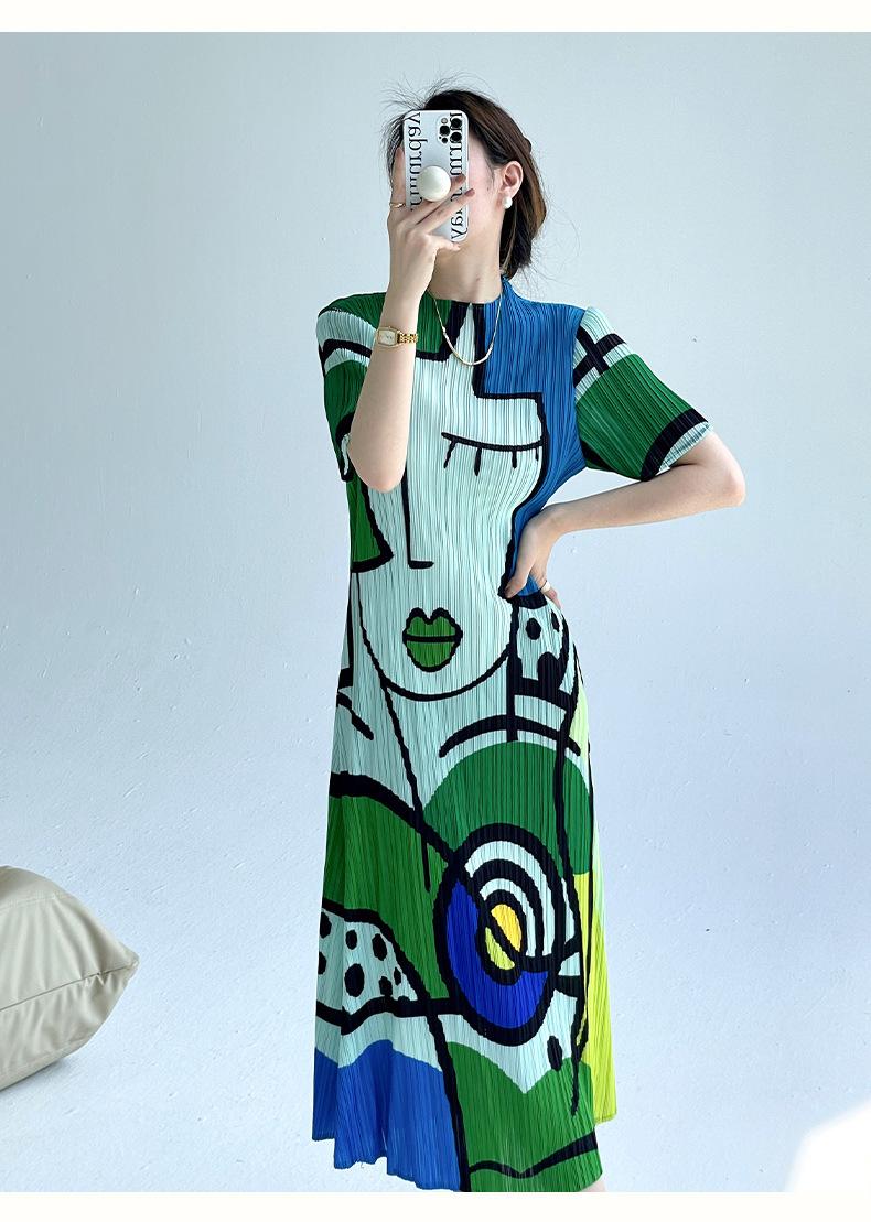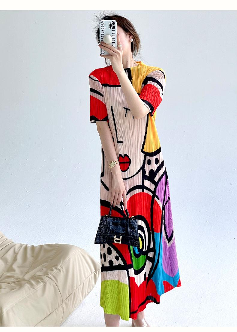 Miyake 2025 Nova Moda Verão Design Estampado Vestido Plissado de Manga Curta Elegante Elegante Slim Saia Midi