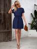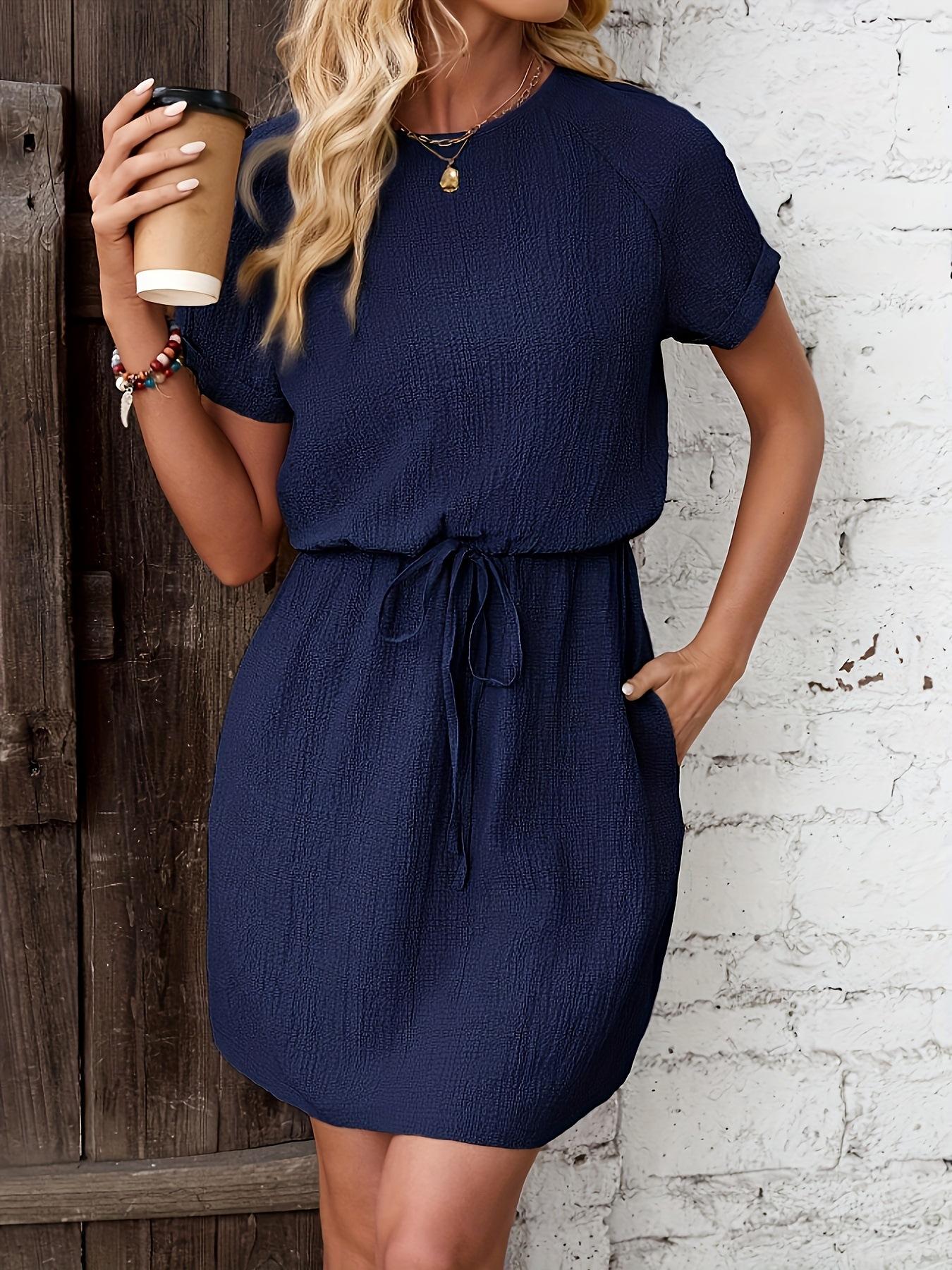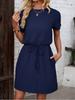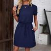 2025 Europeu e Americano Transfronteiriço Verão Outono Temperamento Vestuário Feminino Cor Sólida Bolso Gola Redonda Manga Curta Vestido