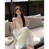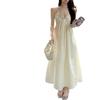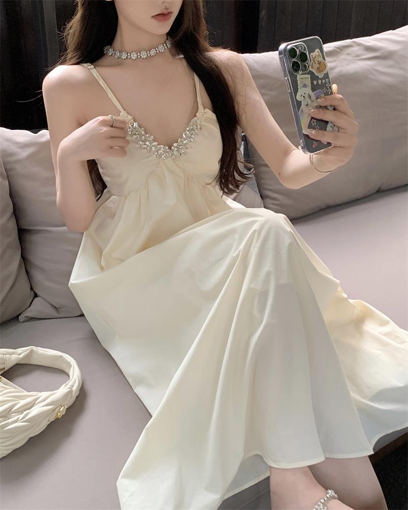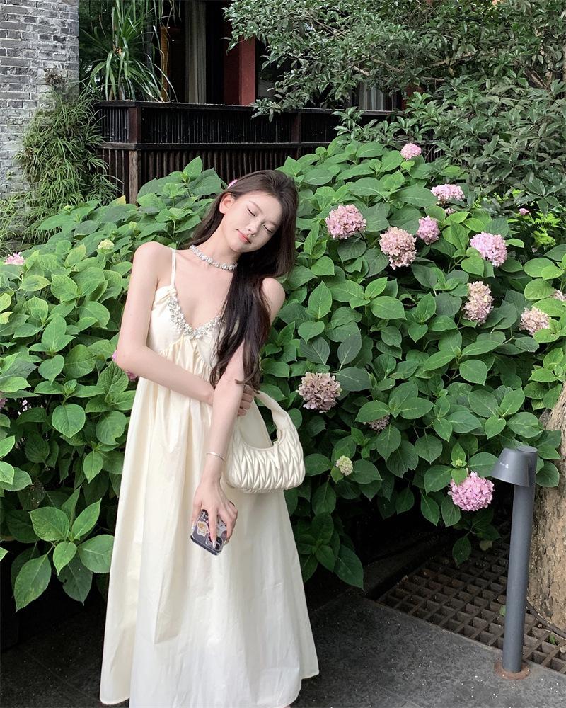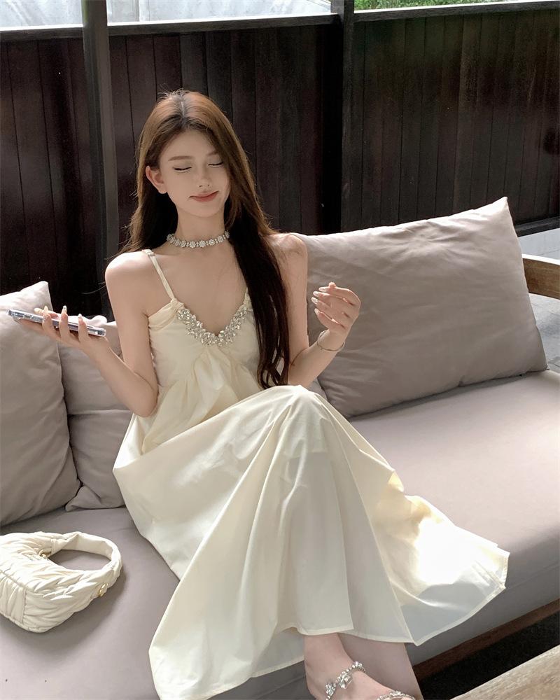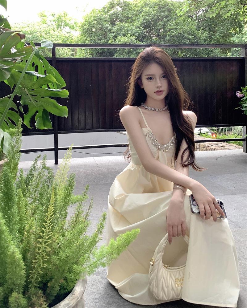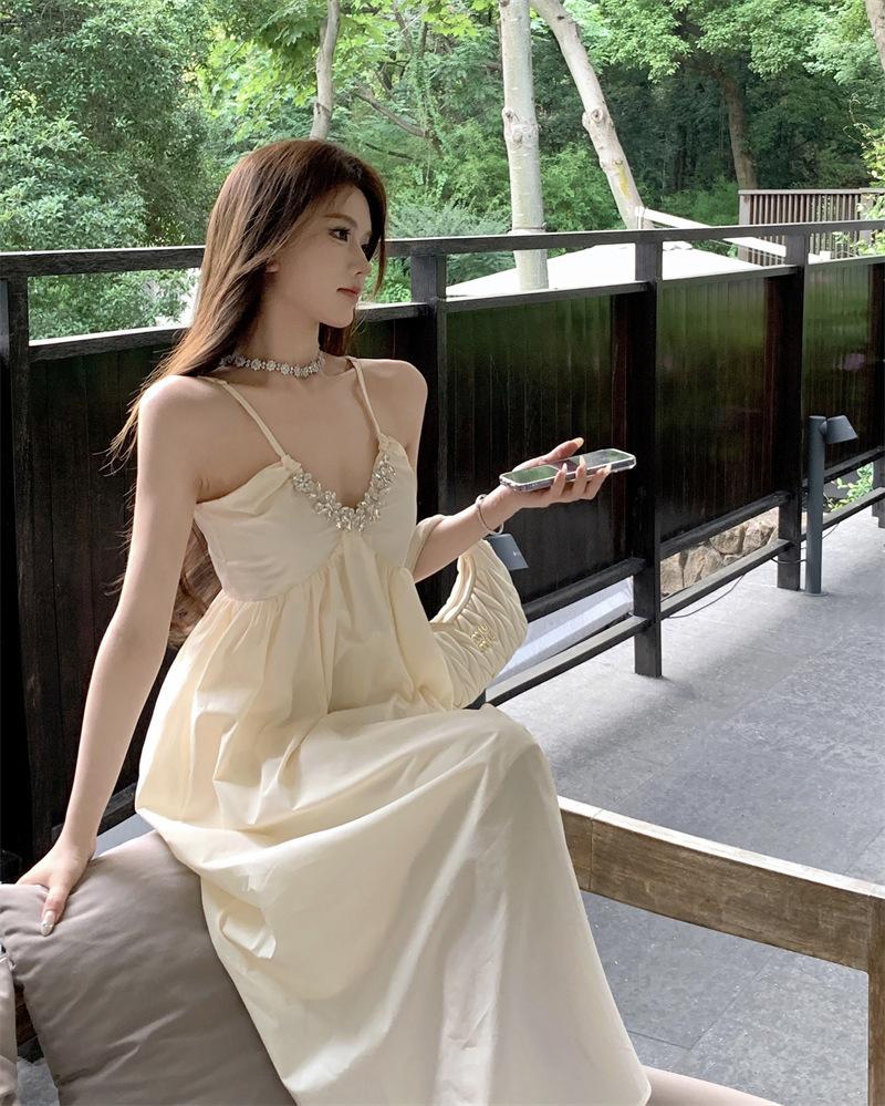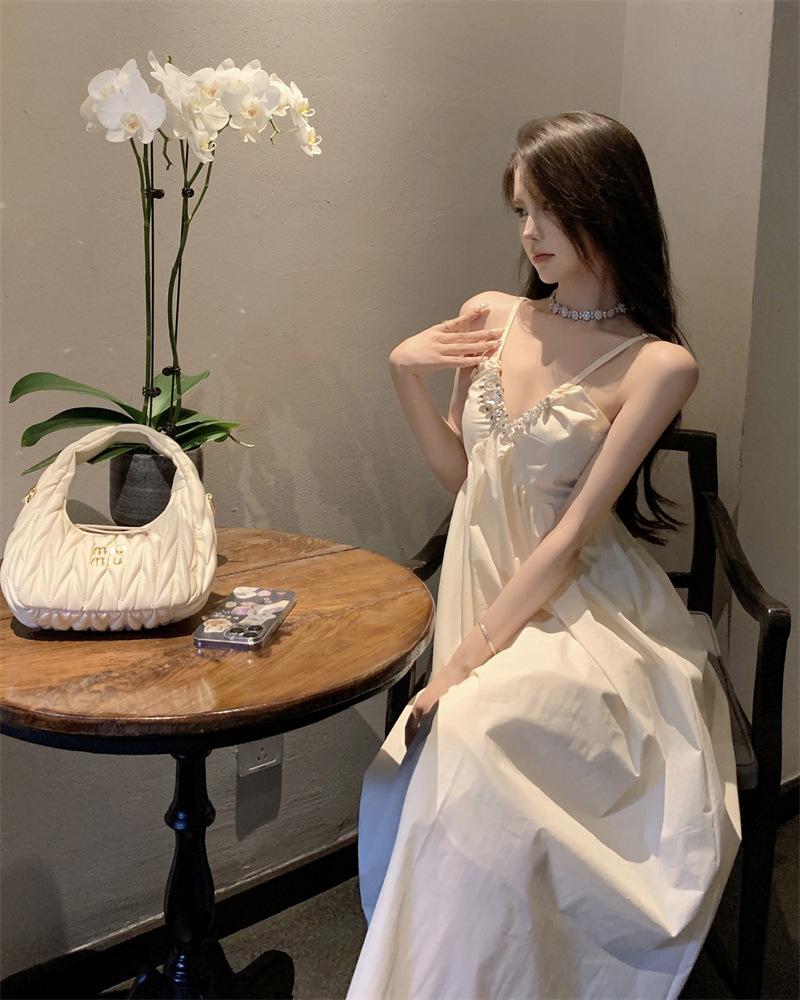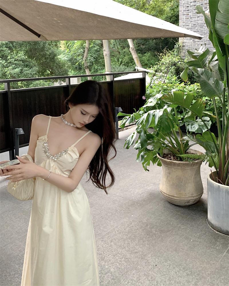 Vestido Sling de Férias à Beira-Mar de Estilo High-end Feminino Design de Verão Diamante Flash Decote em V Lindo Vestido Longo de Praia