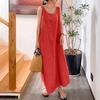 Europeu e Americano Verão Novo Versão Longa Alça Algodão e Linho Estilo Simples Solto Bolso Gola Redonda Elegante Vestido Sem Mangas para Mulheres
