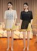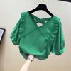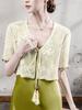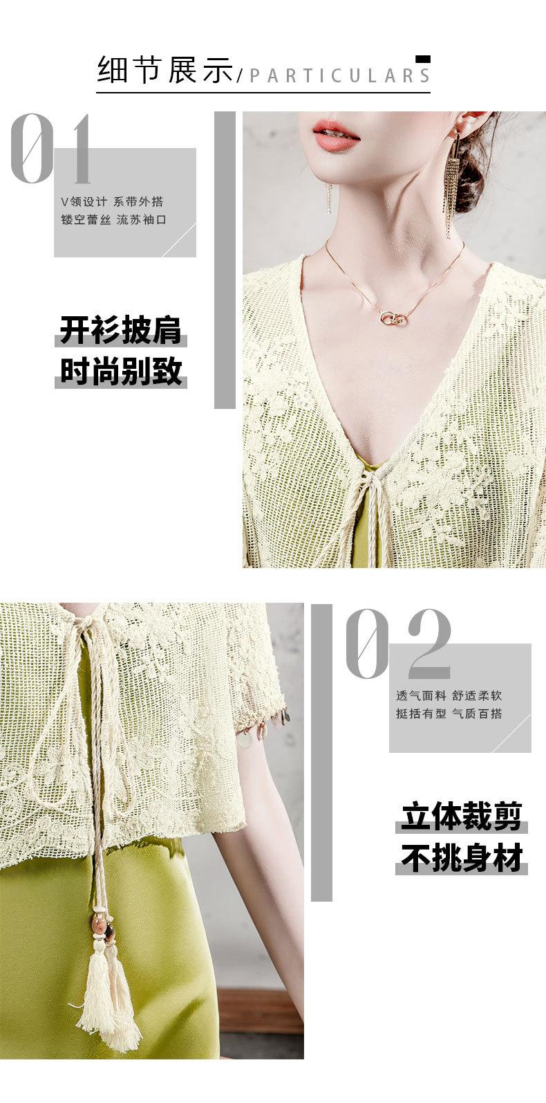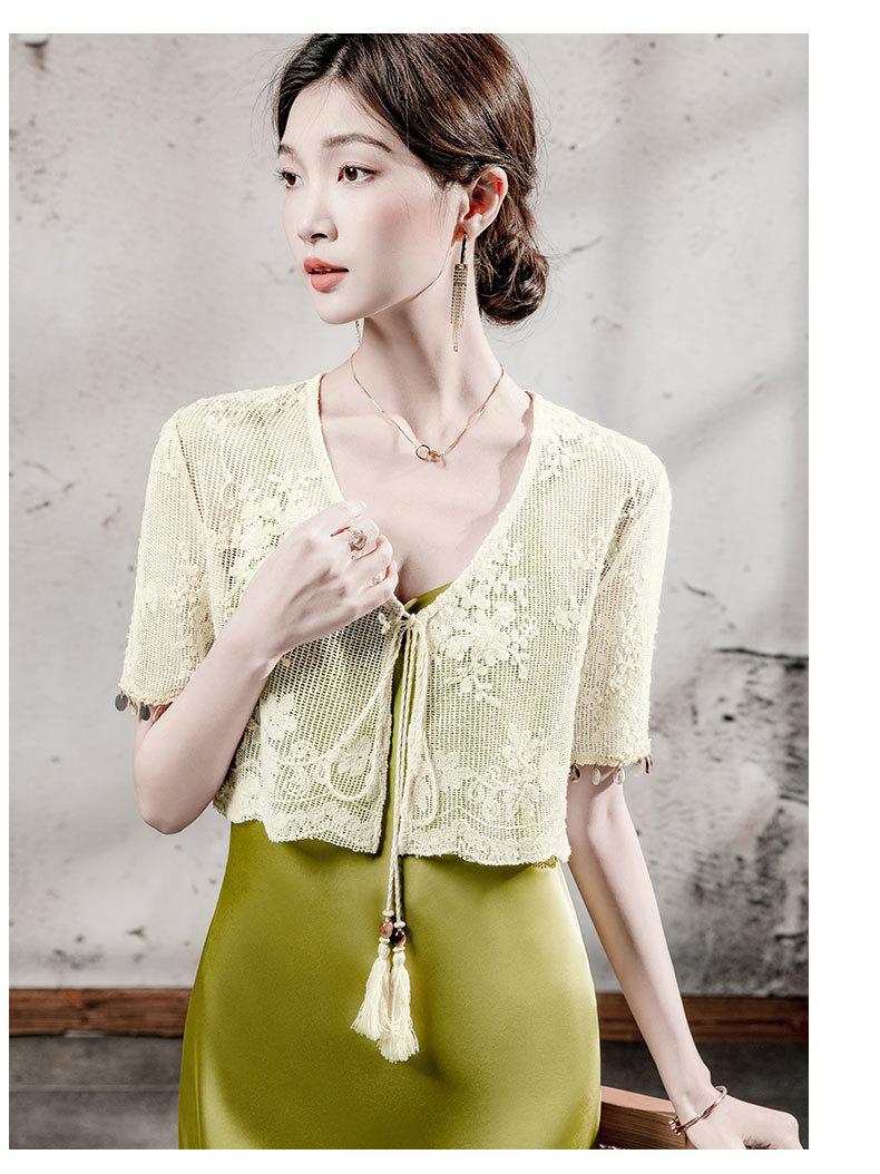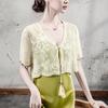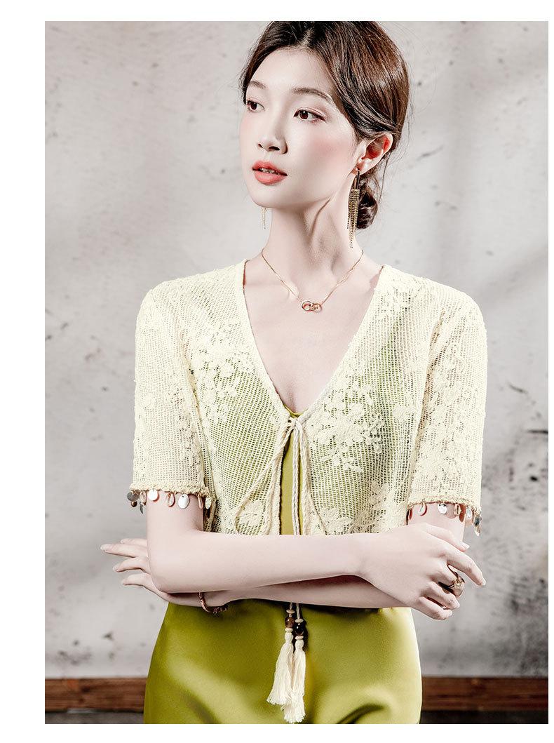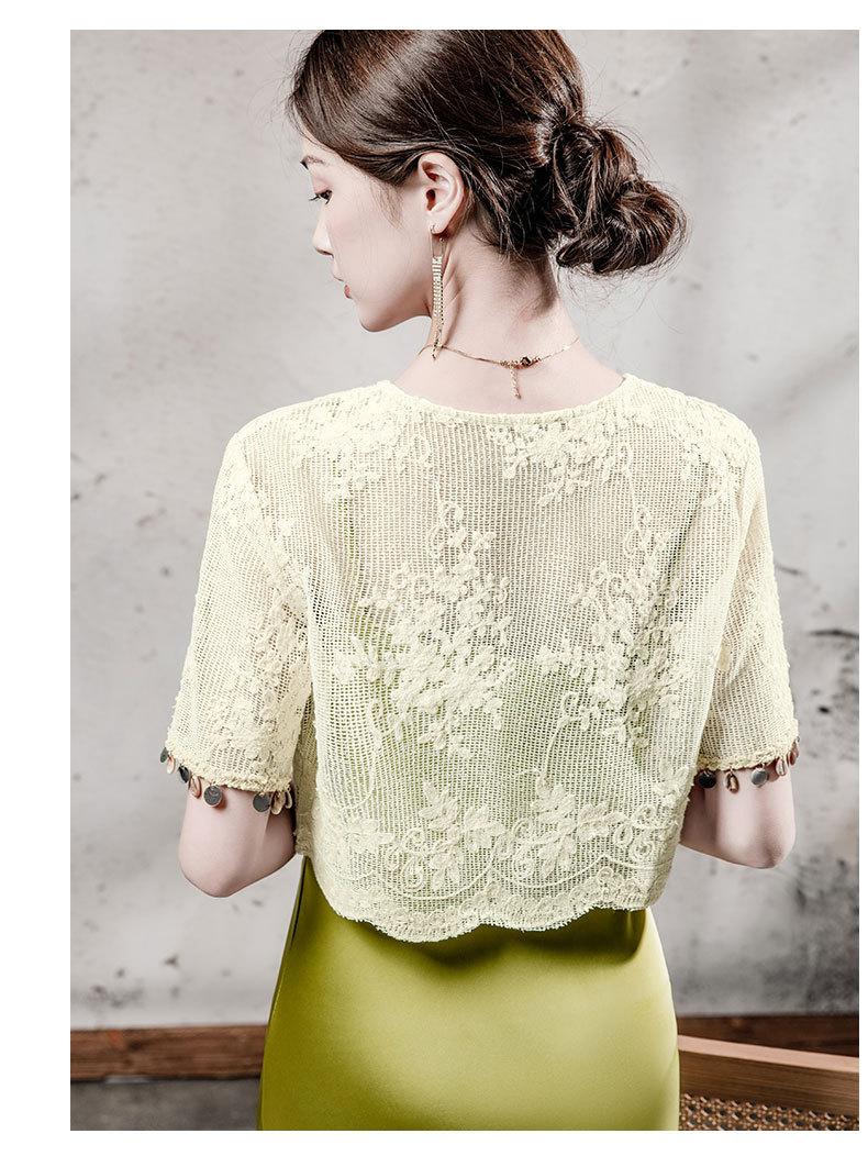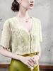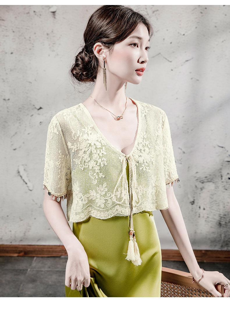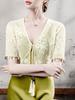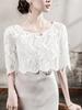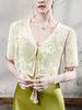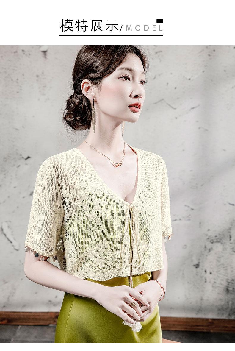 Blusa de Renda de Manga Curta com Decote em V Feminina Curta 2025 Verão Novo Vestido com Padrão de Gancho Recortado Cardigã