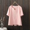 2025 Novo Estilo de Verão Retro Bordado Algodão e Linho Camisa Feminina Solta Slim Camisa Decote V Cor Pura Camiseta de Manga Curta