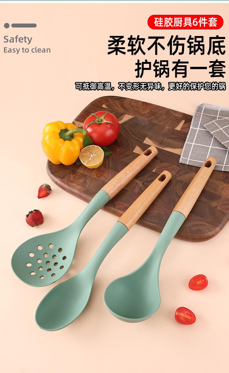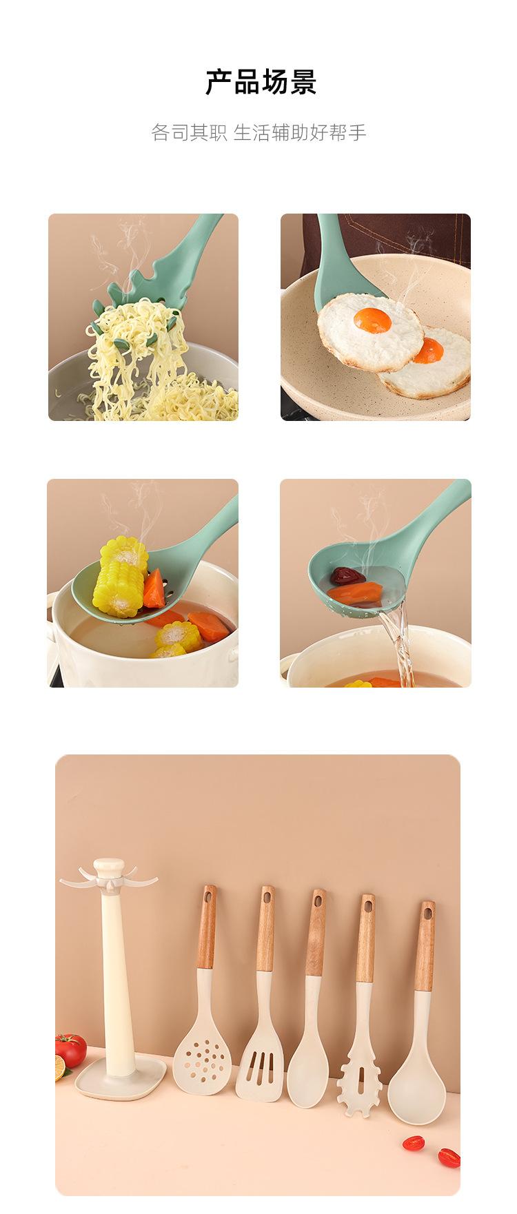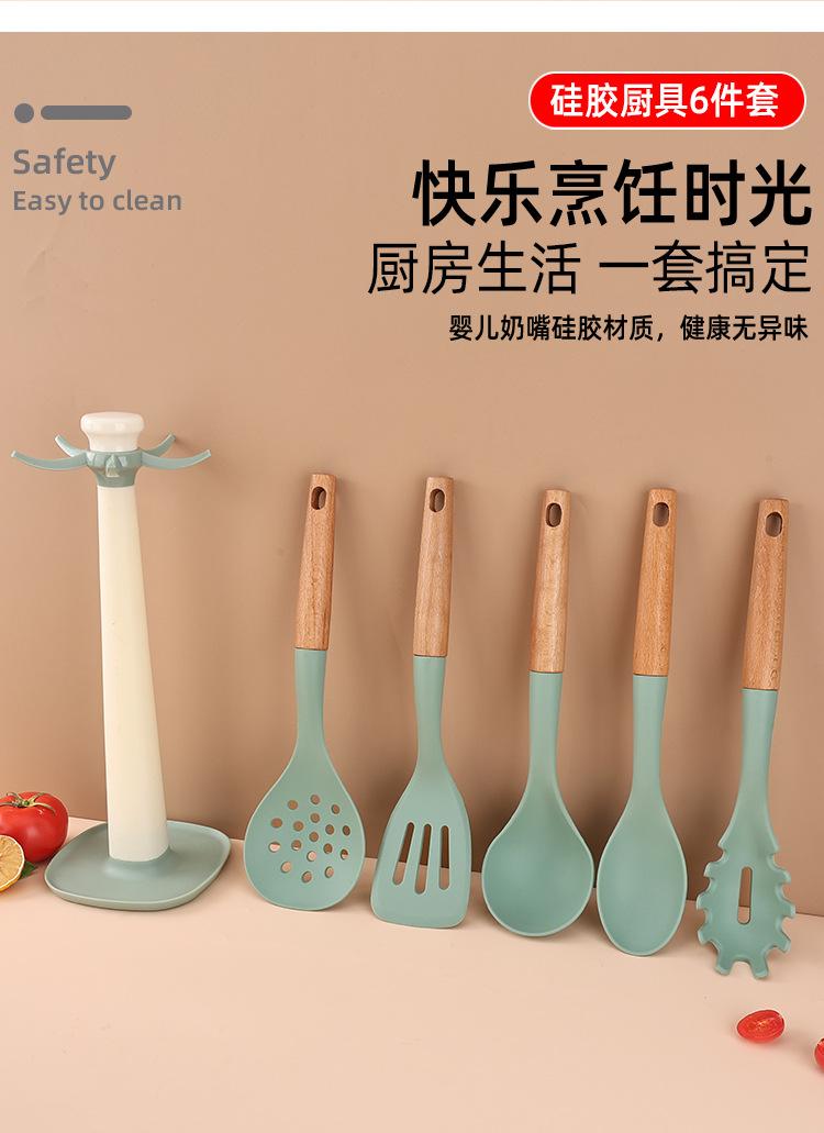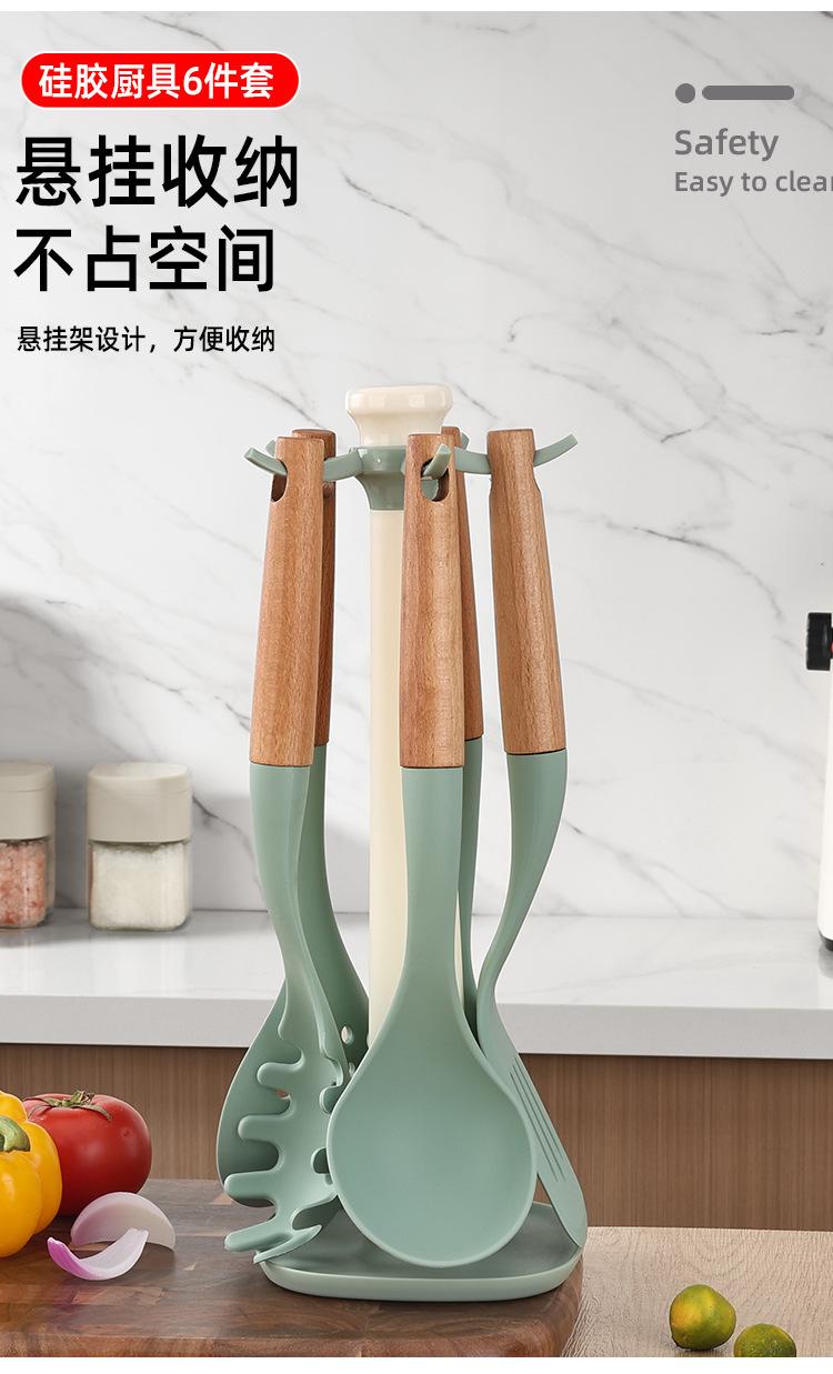 6-piece plastic rack for kitchen utensils with wooden handles (dark green)