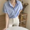 Novo Estilo Pequeno Fresco Lapela Camisa Listrada Feminina Solta Versátil Design Moderno Manga Curta Cardigã Roupas de Verão Camisa Branca Tendência