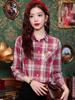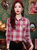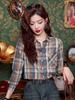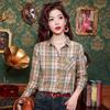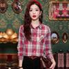 Camisa Xadrez Estilo Moda Hong Kong para Mulheres Primavera & Outono 2025 Nova Camisa Básica Solta e Versátil Camisa de Manga Comprida com Gola Polo