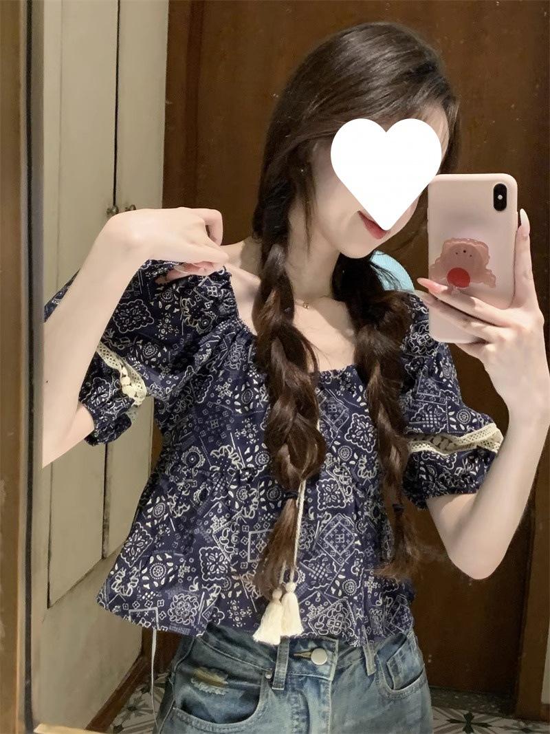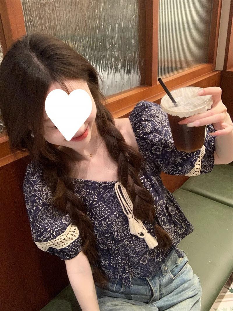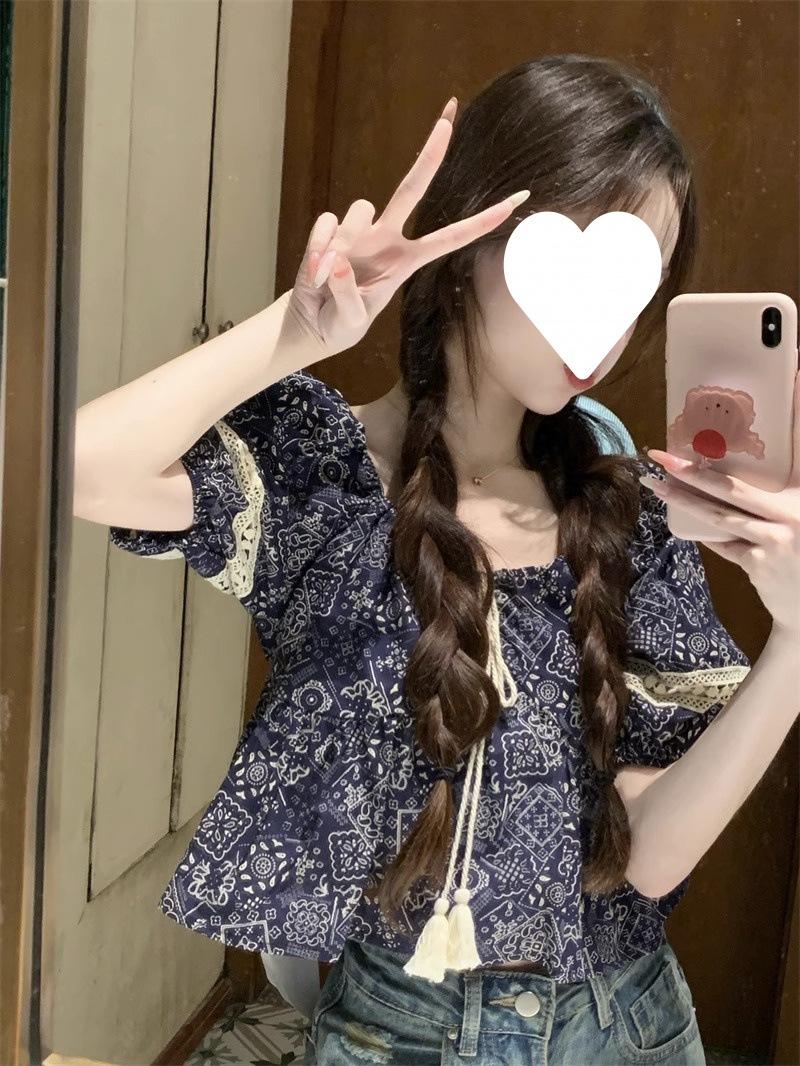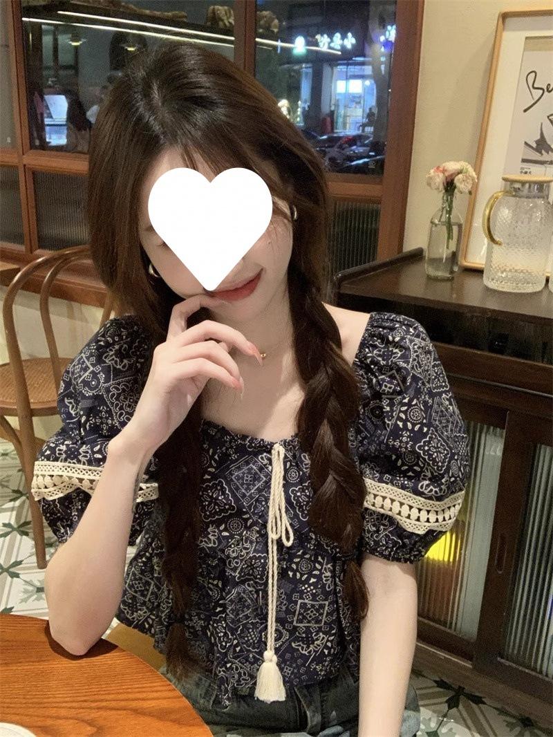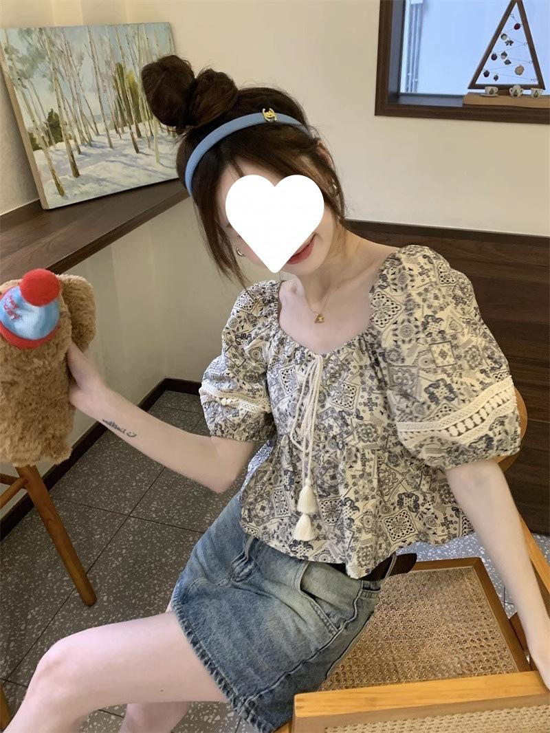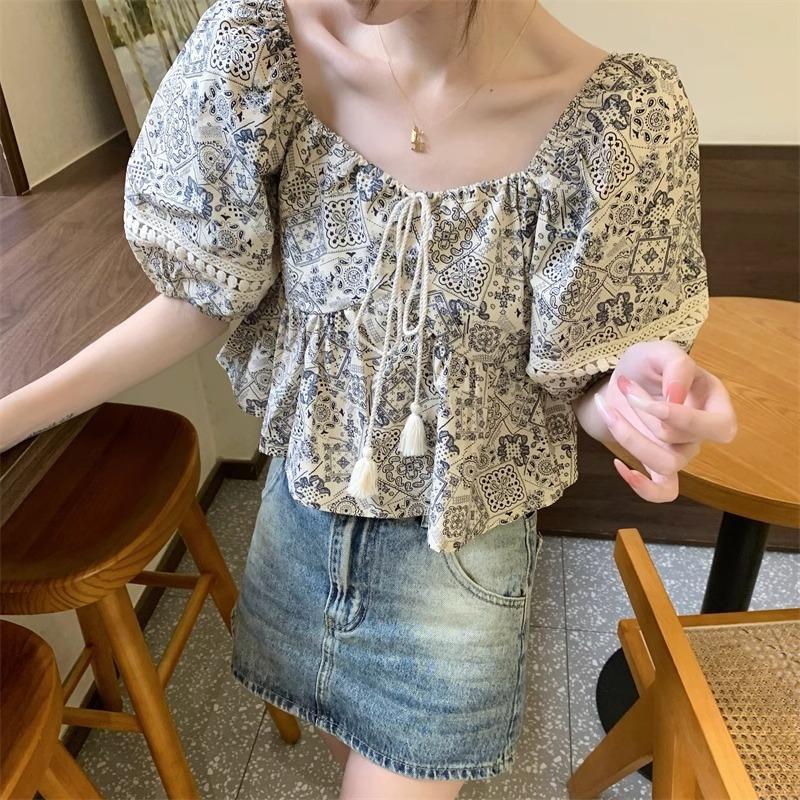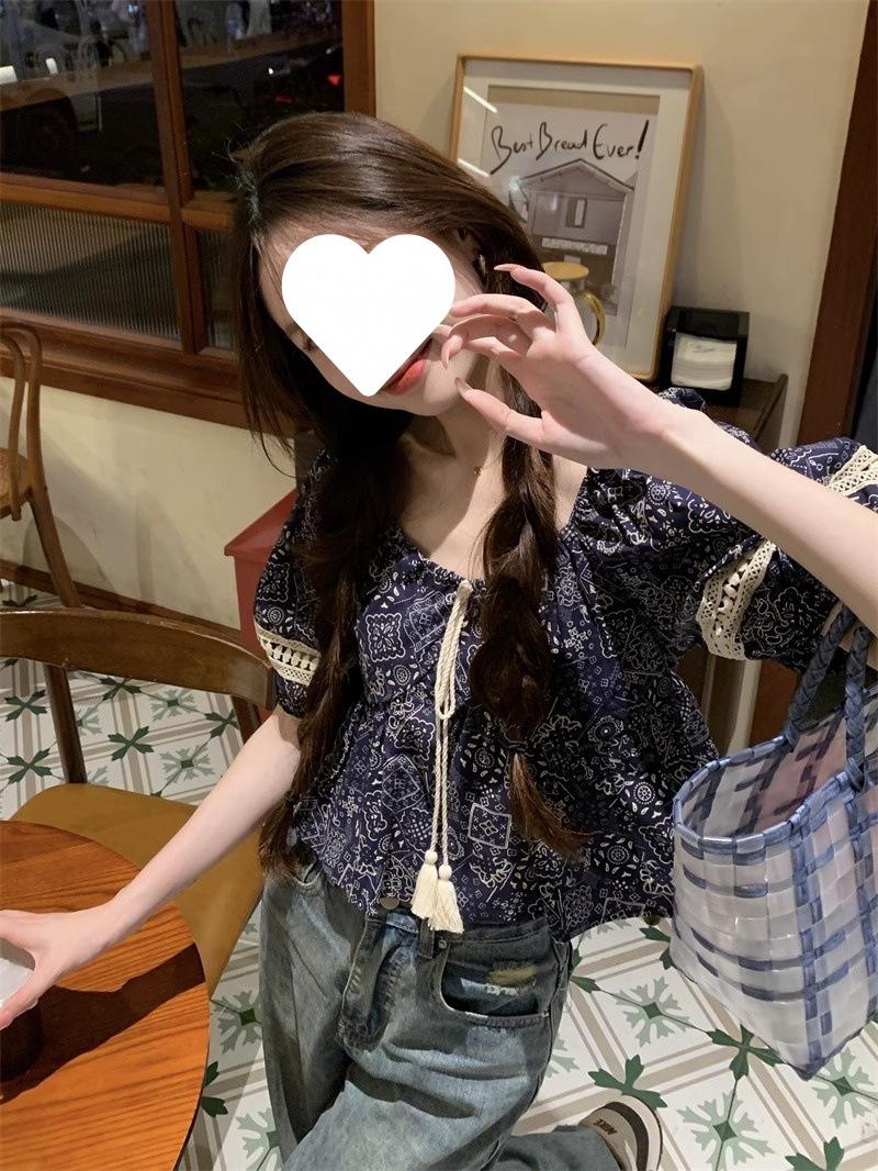 Compre Estilo étnico tamanho pequeno estampado camisa feminina verão novo vintage tassel costurando renda camisa de manga curta no atacado no Joom.pro