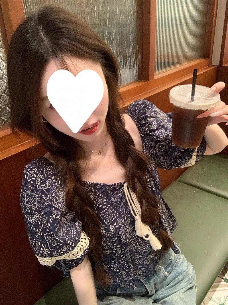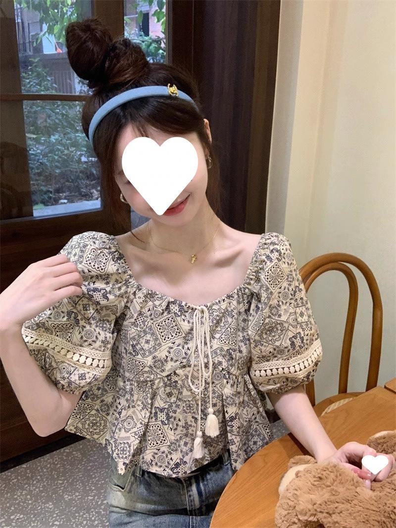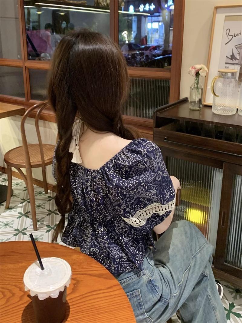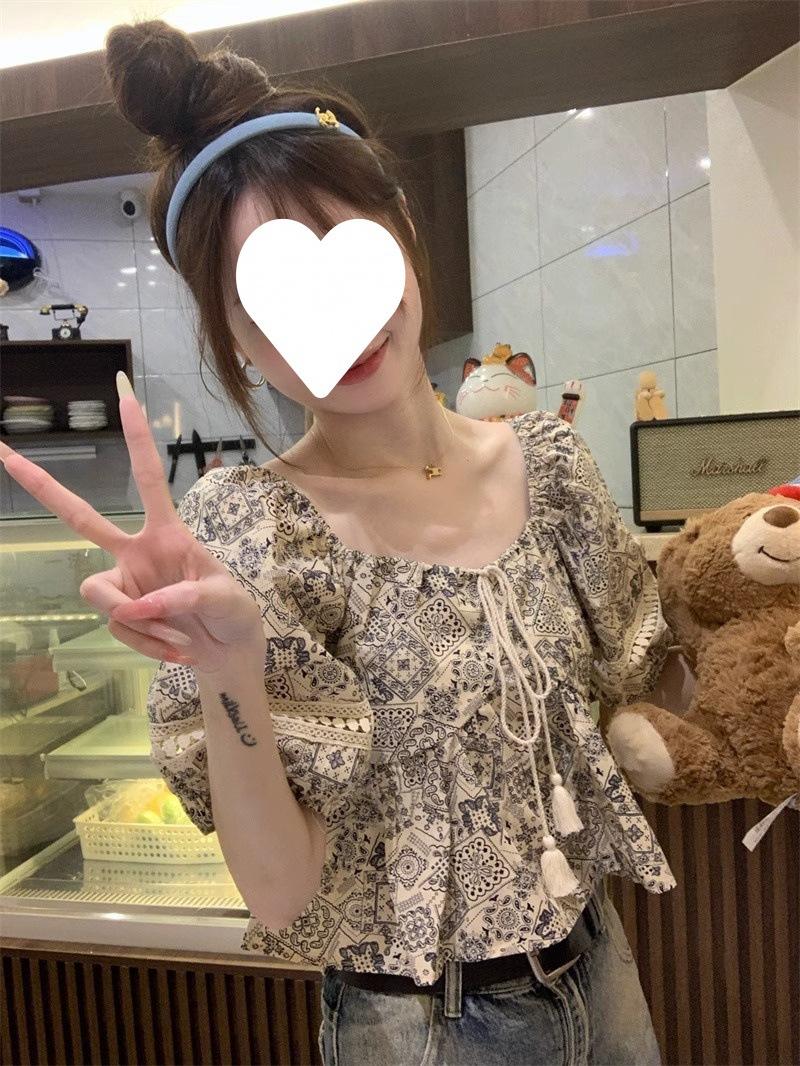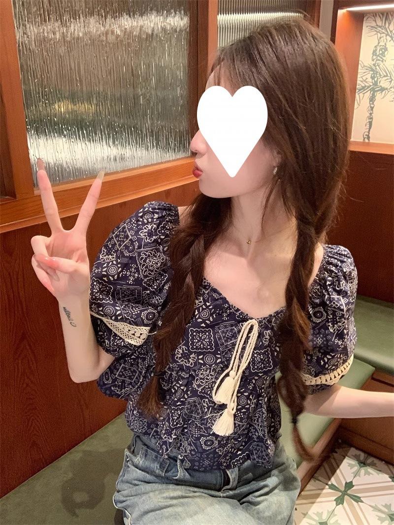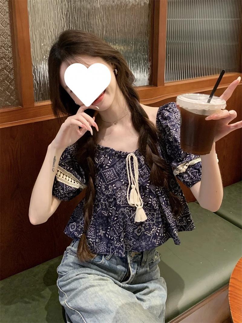 Compre Estilo étnico tamanho pequeno estampado camisa feminina verão novo vintage tassel costurando renda camisa de manga curta no atacado no Joom.pro