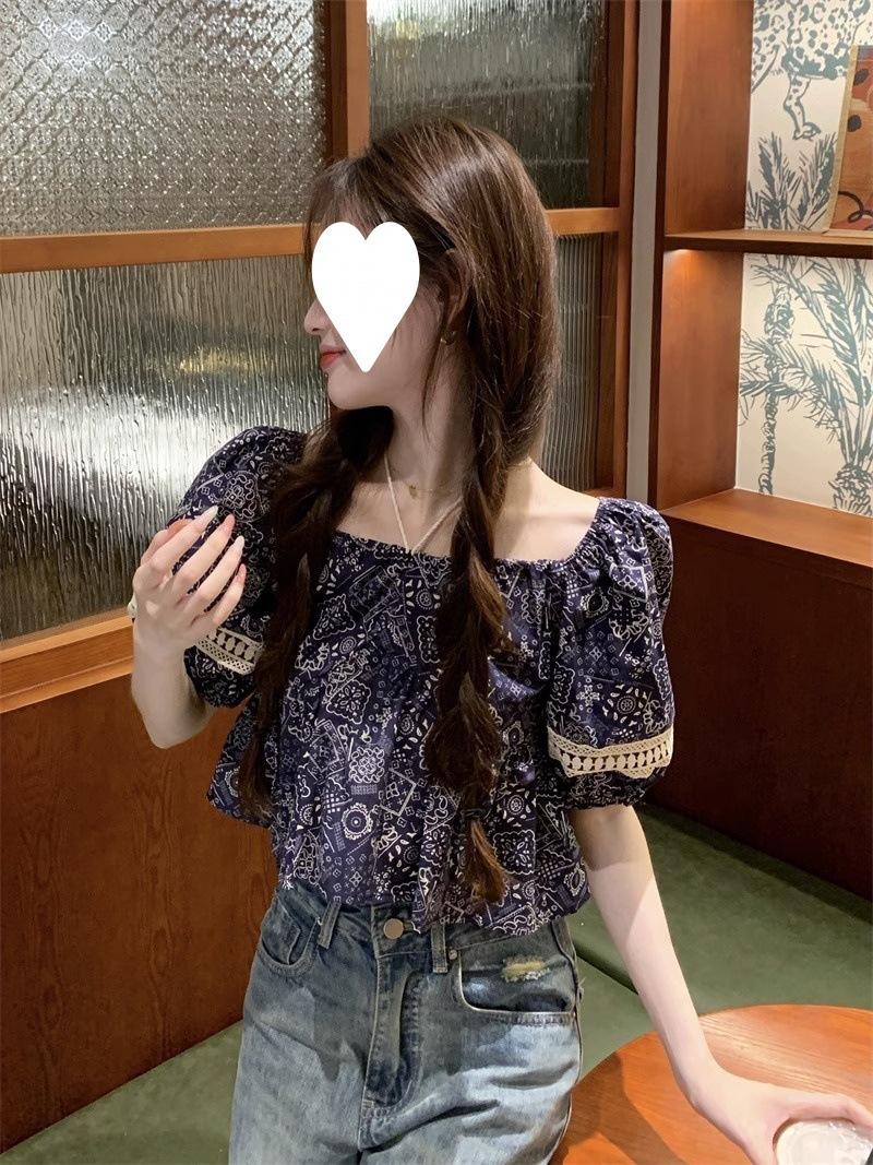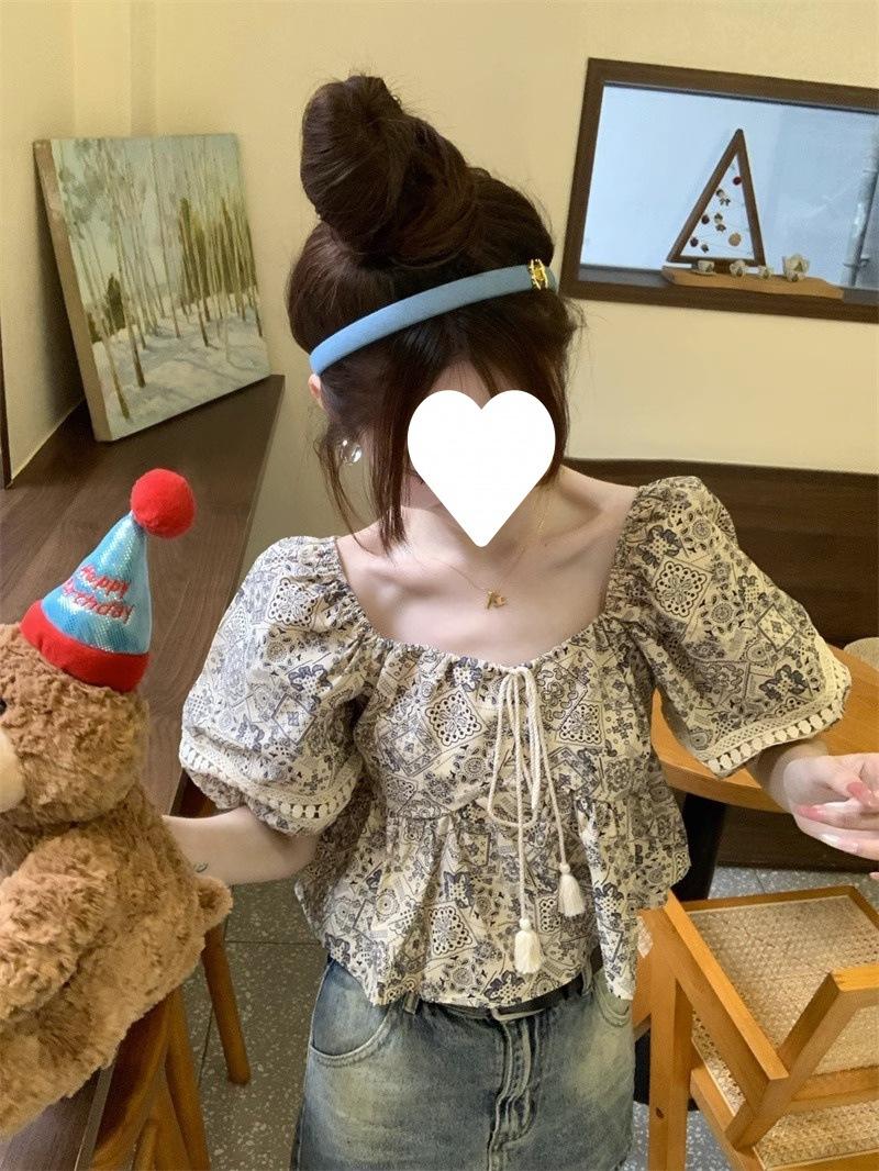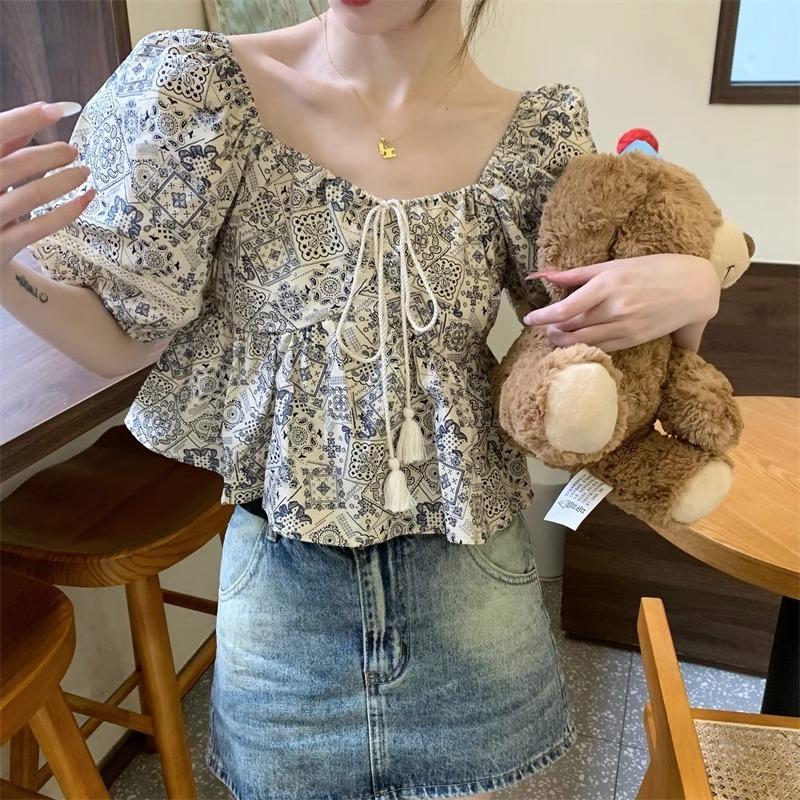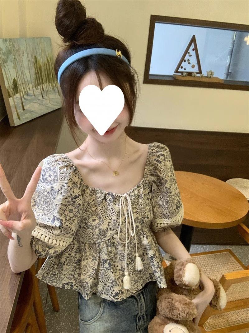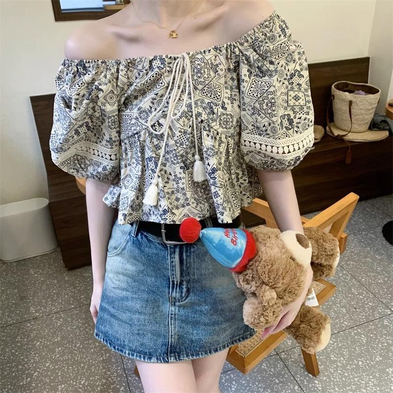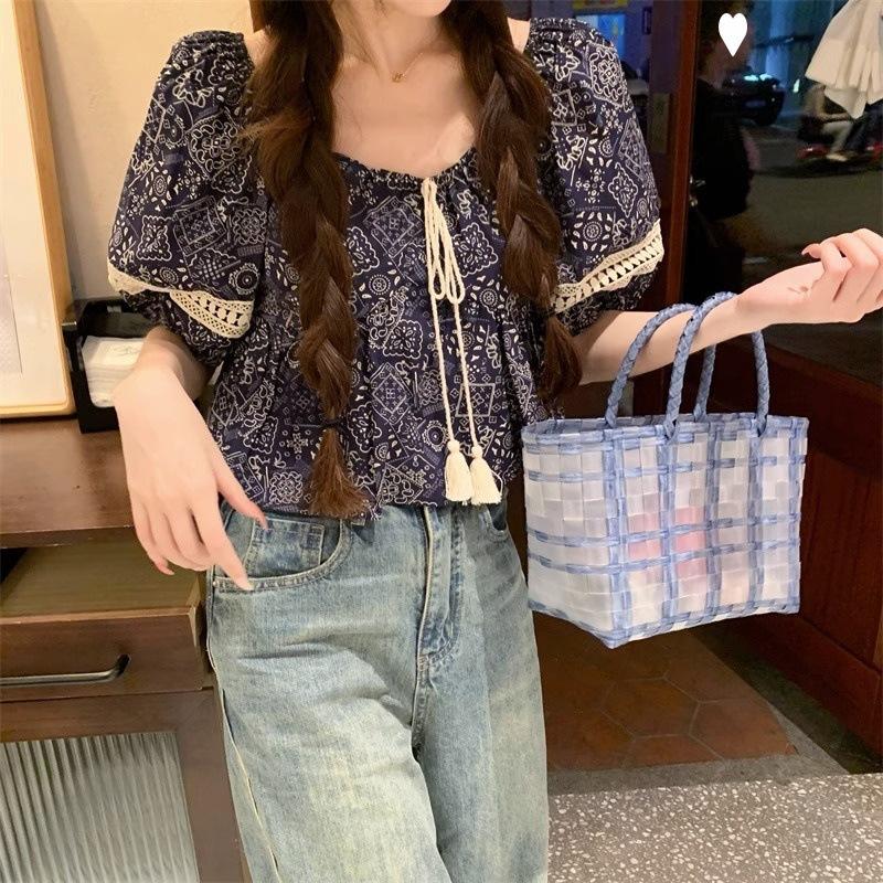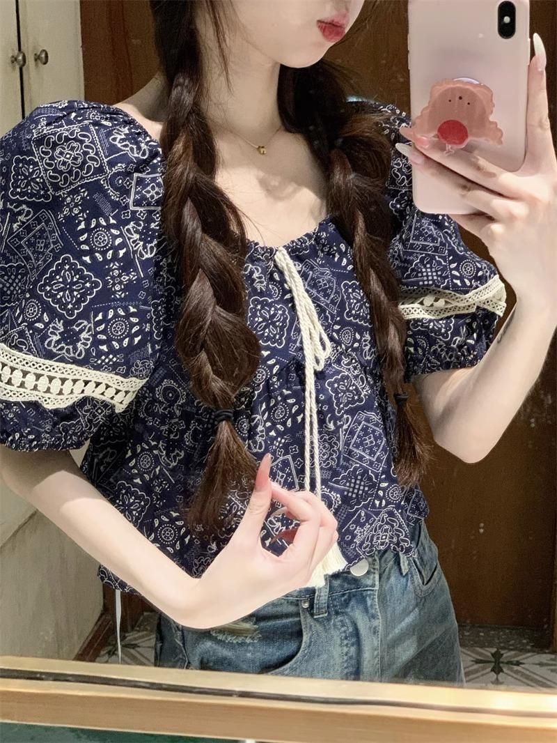 Compre Estilo étnico tamanho pequeno estampado camisa feminina verão novo vintage tassel costurando renda camisa de manga curta no atacado no Joom.pro