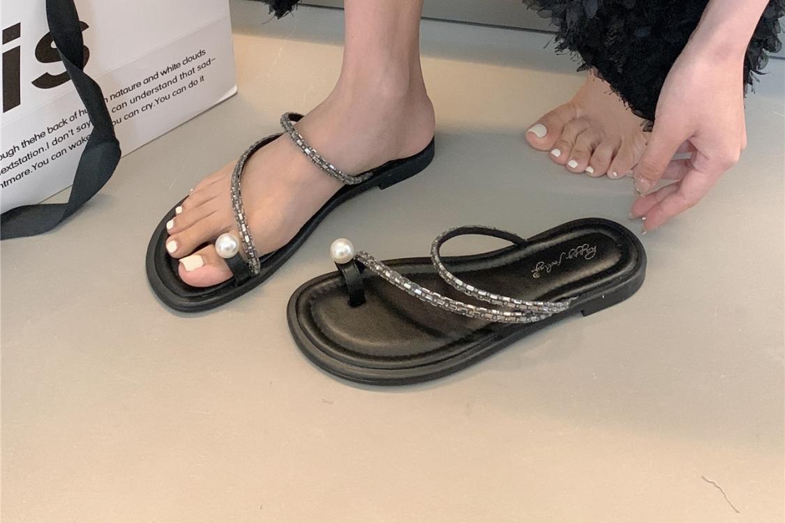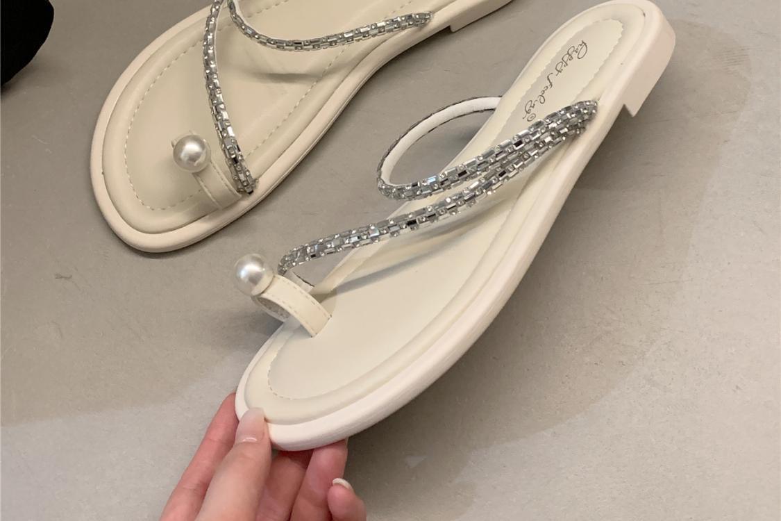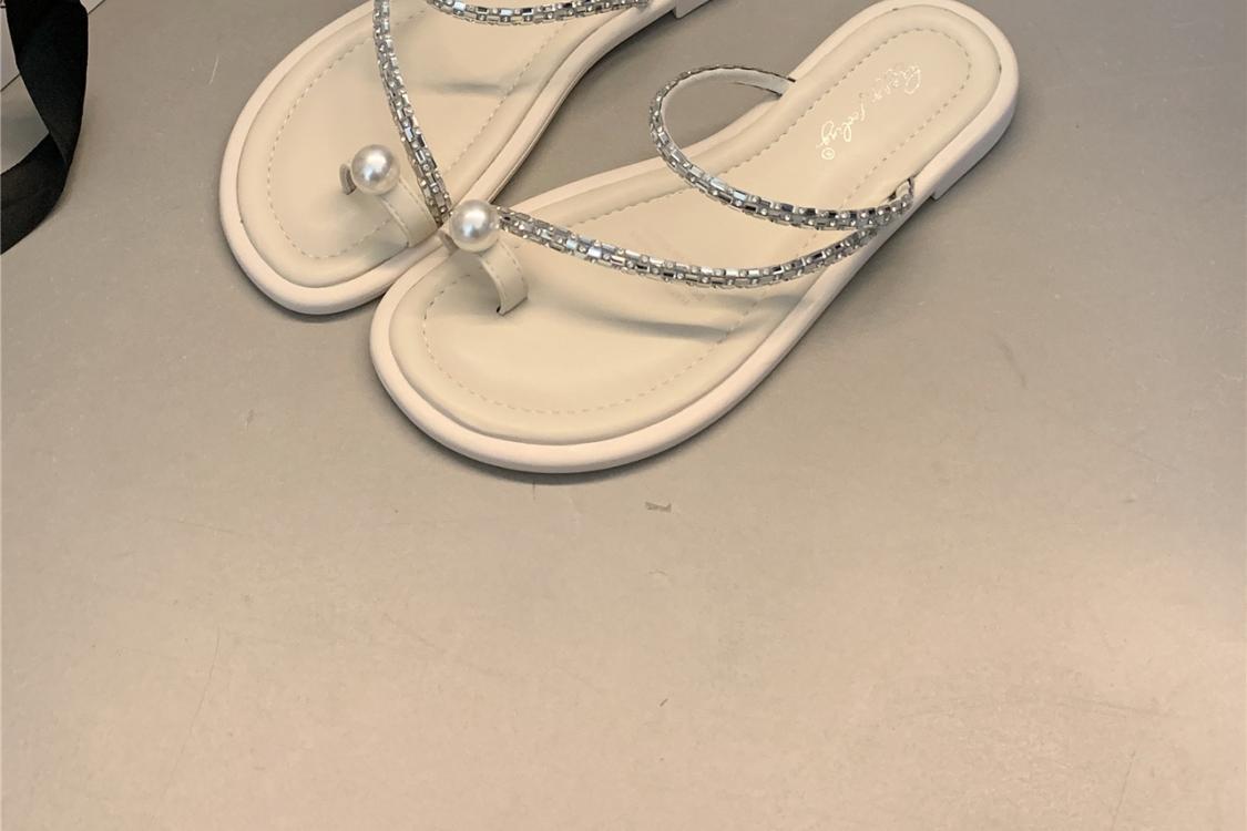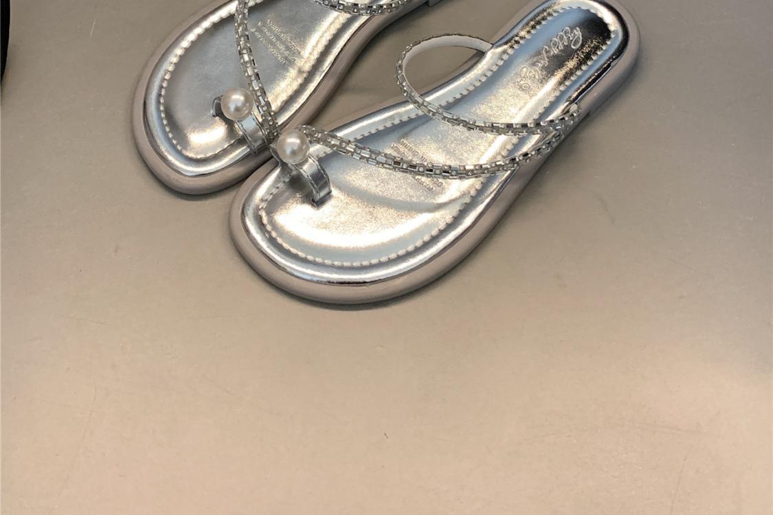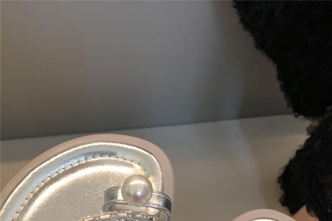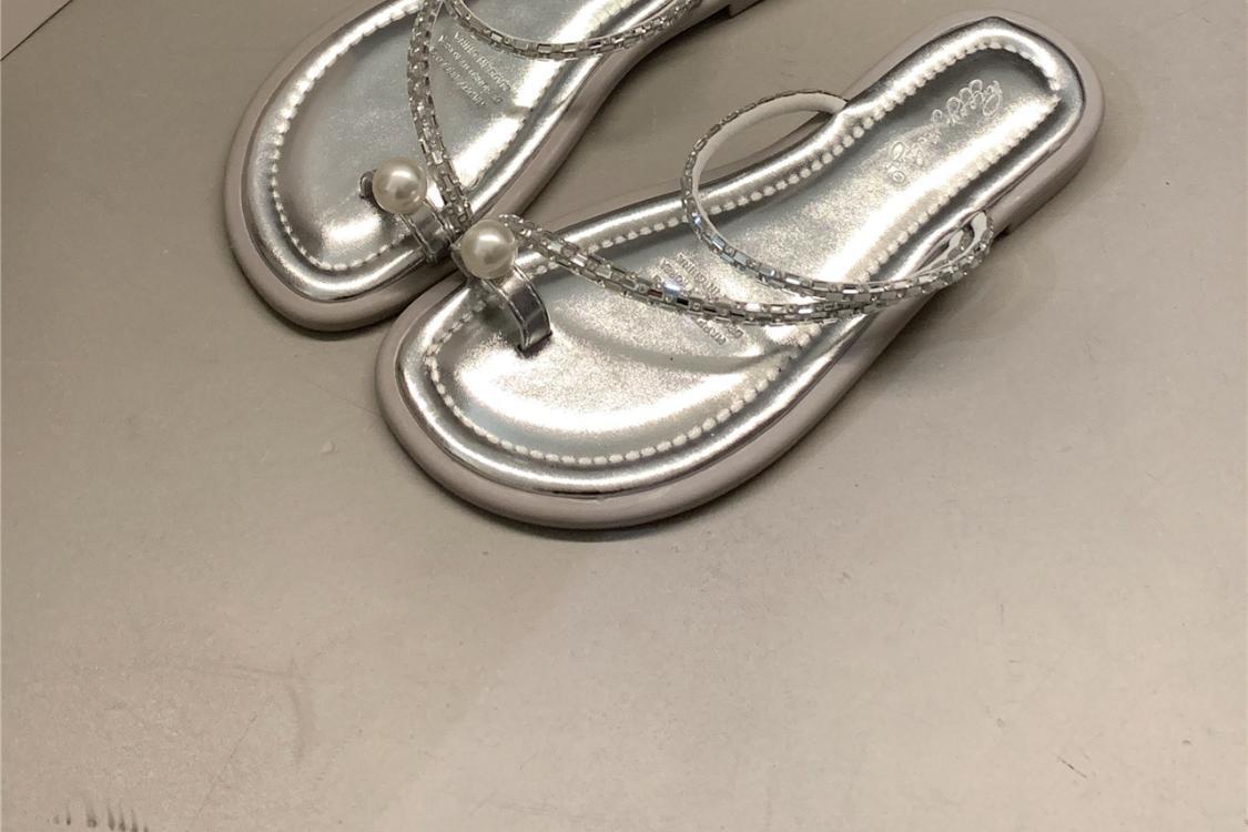 Compre Sapatilhas Slip-On Francesas Chinelos para Verão Feminino Roupa de Exterior 2025 Estilo Feriado Pérola Strass Ins Sandálias Prateadas no atacado no Joom.pro