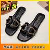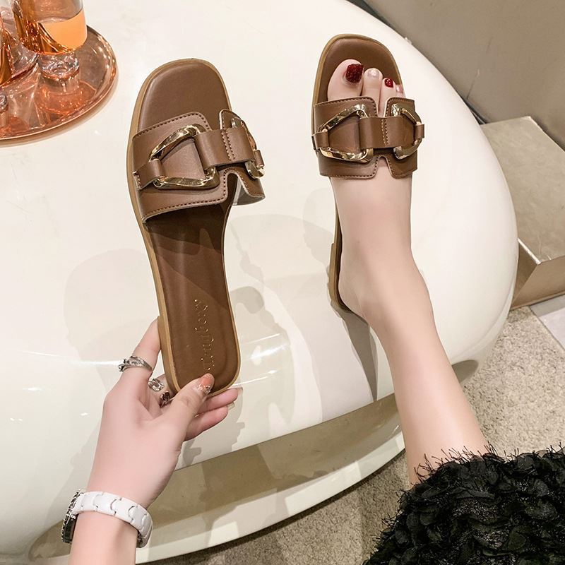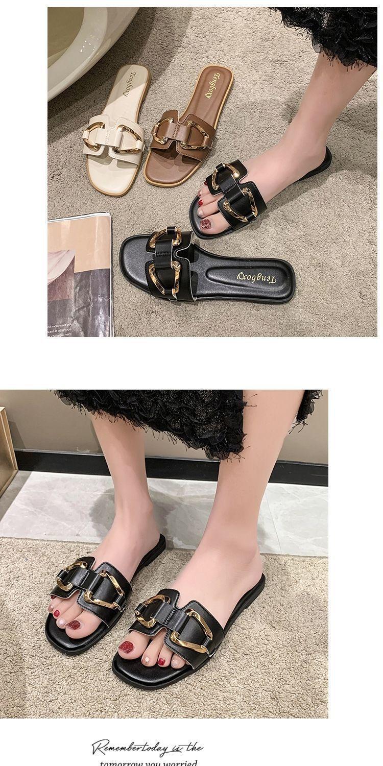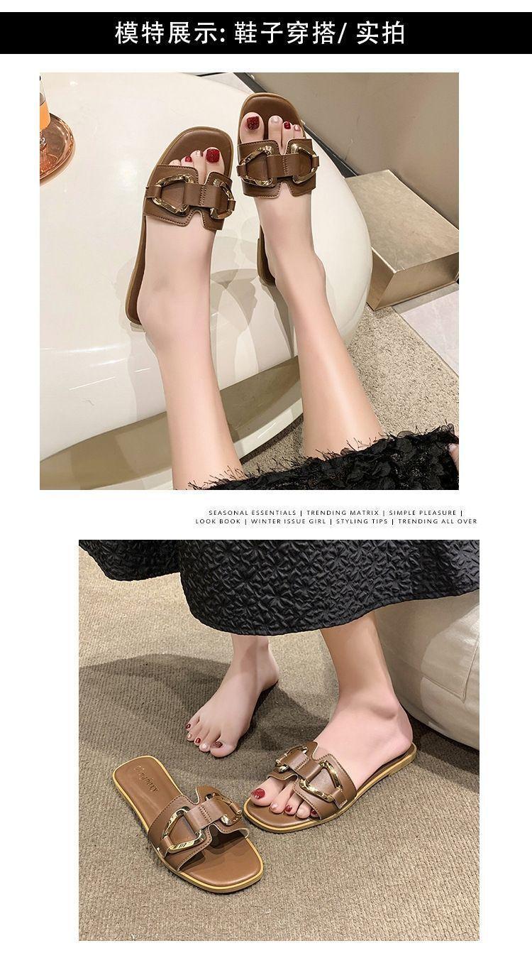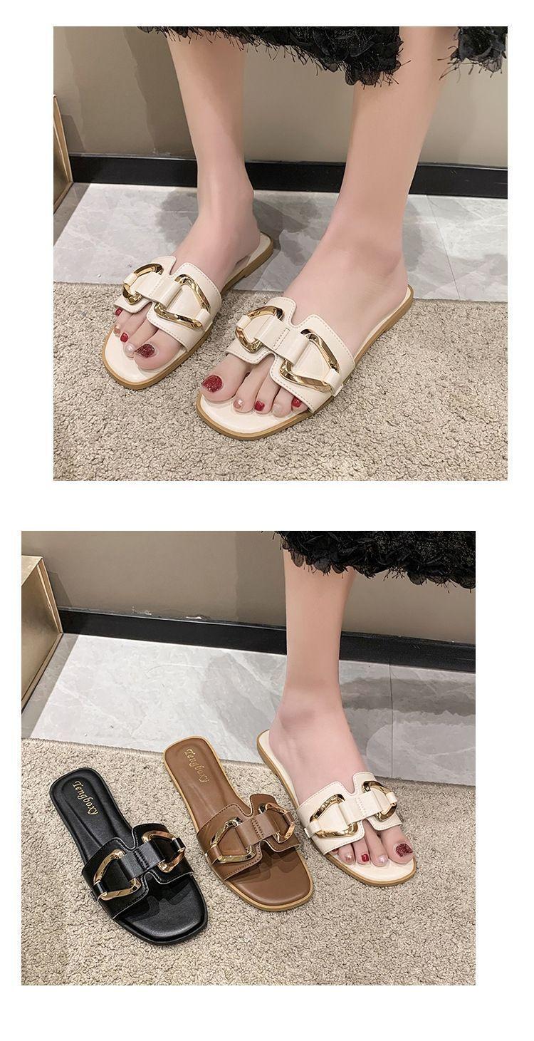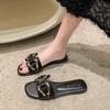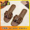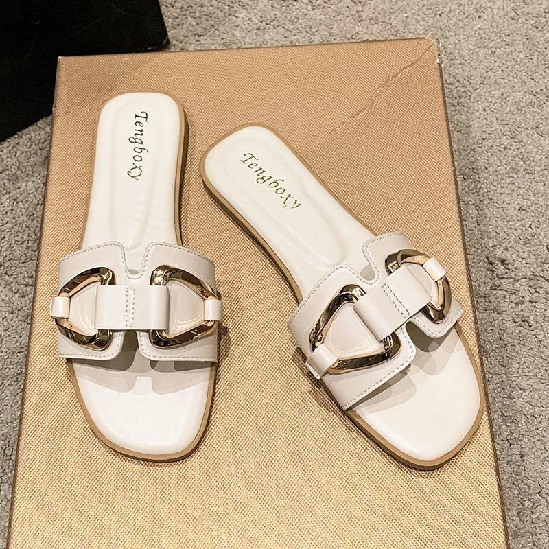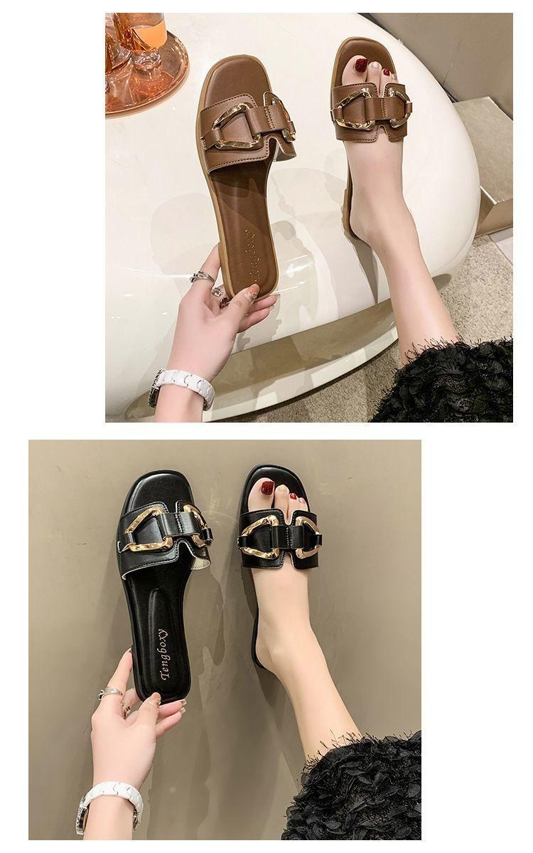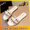 Chinelo Tamanho Grande Feminino para Comércio Exterior Transfronteiriço Mulheres 2025 Novo Estilo Verão Feminino Calçado de Exterior Fivela de Metal Sola Macia Chinelos de Uma Tira Bico Quadrado Chinelos Frescos