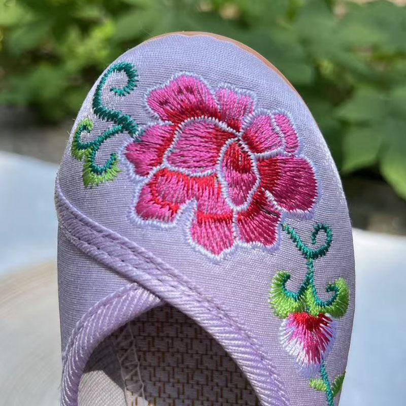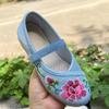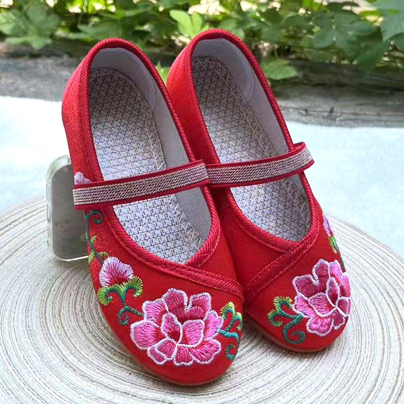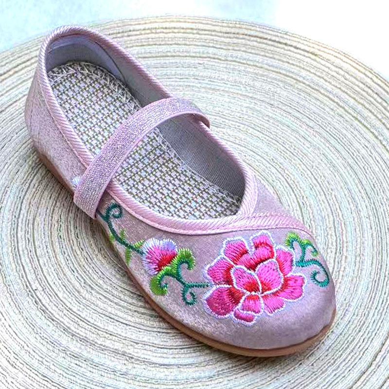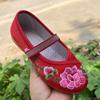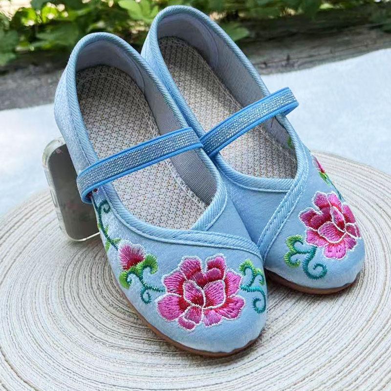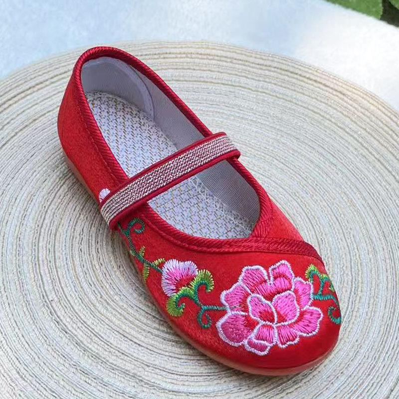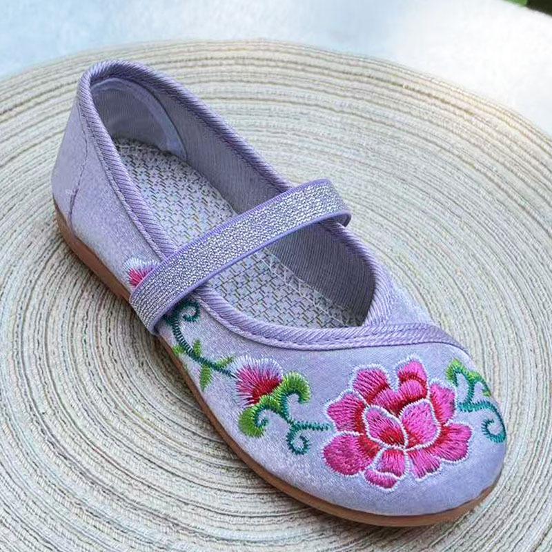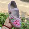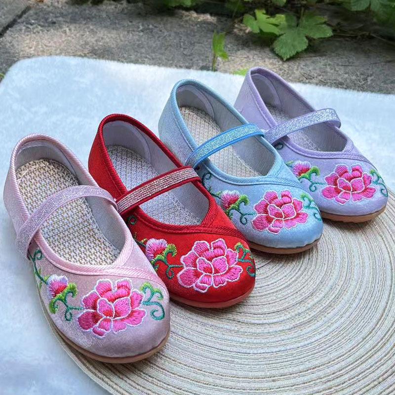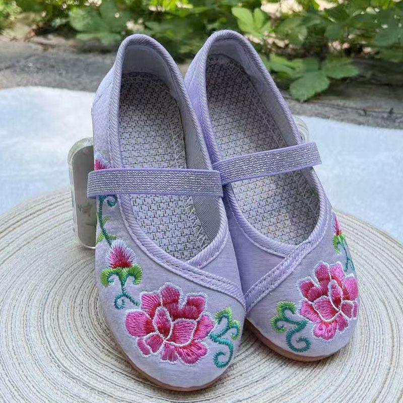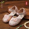 Sapatos bordados infantis de novo estilo para meninas, solas de couro de vaca, sapatos de dança infantis, estilo antigo Hanfu, elástico infantil, sapatos de pano antigos de Pequim