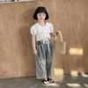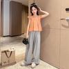 Roupa de Verão de Duas Peças para Meninas Moderna Personalidade Infantil Estilo Coreano Regata com Laço Calças de Perna Larga Yamamoto