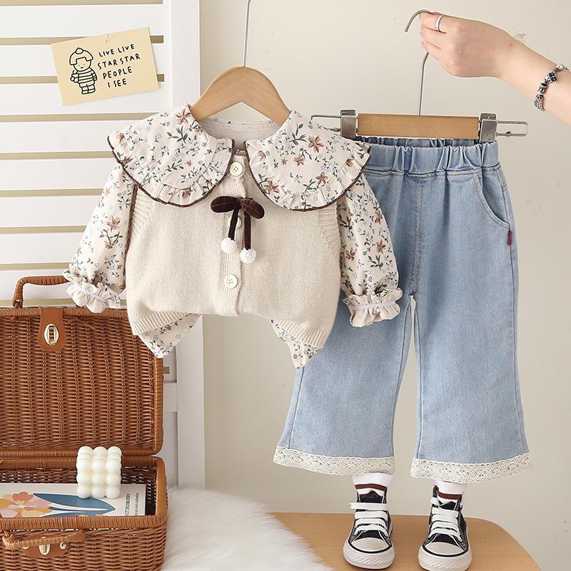 Conjunto de Primavera e Outono para Meninas 2025 Novo Cardigã da Moda Infantil com Laço Conjunto de Três Peças Roupas de Primavera e Outono para Bebê