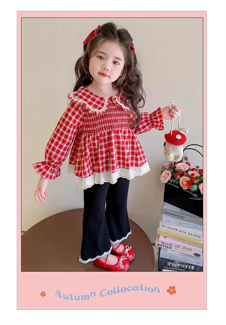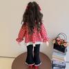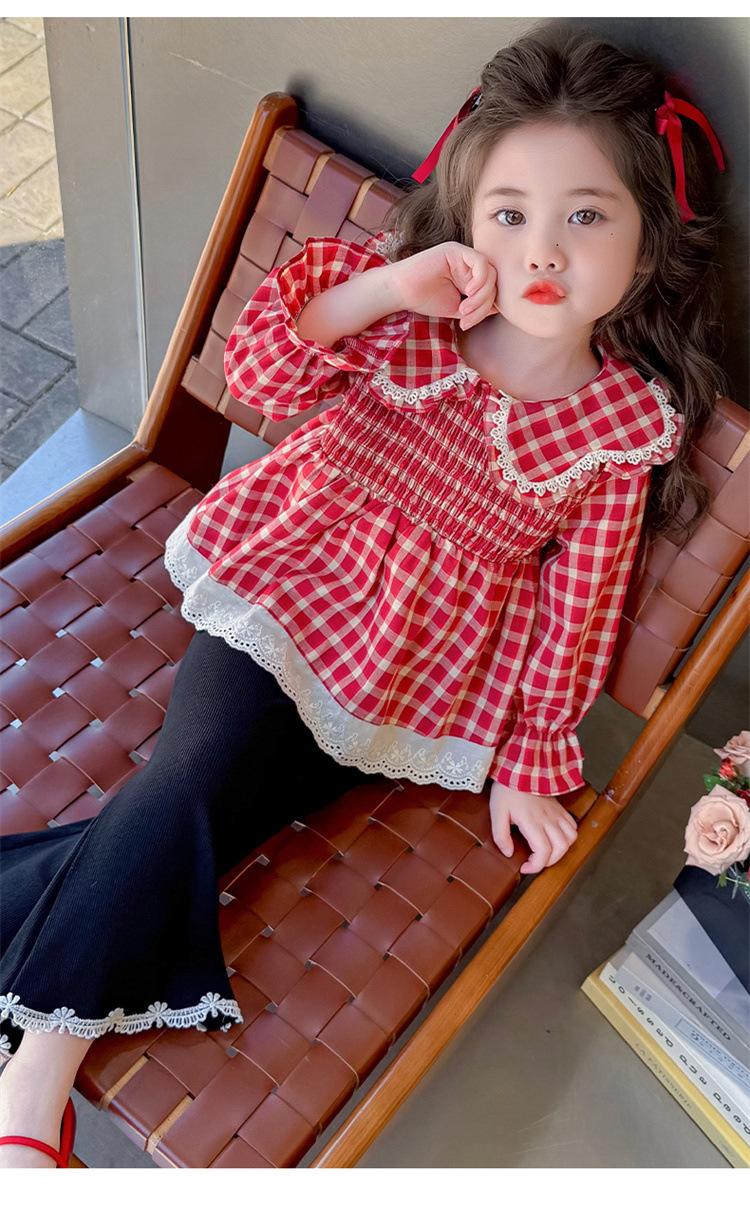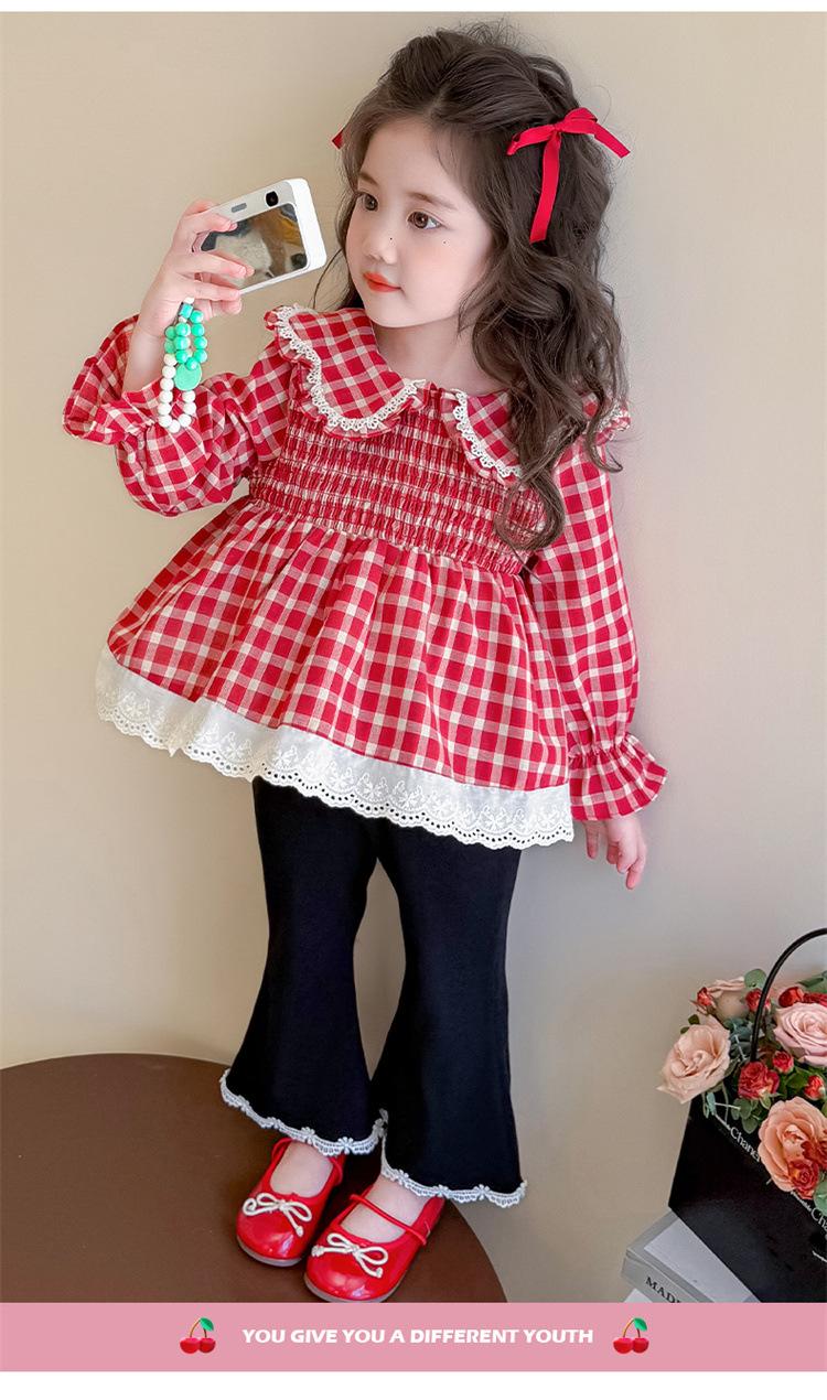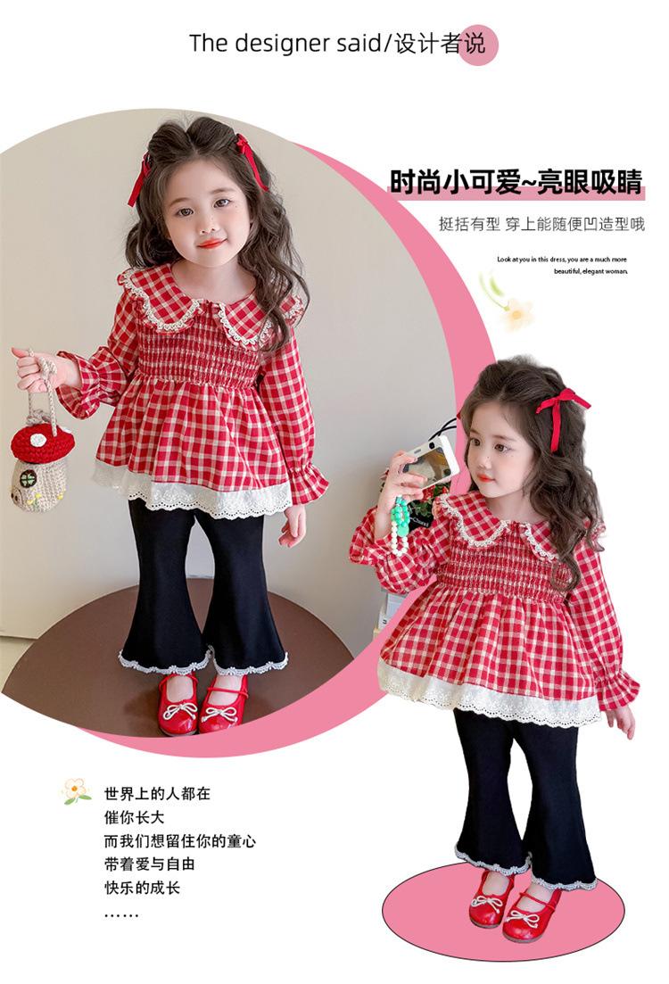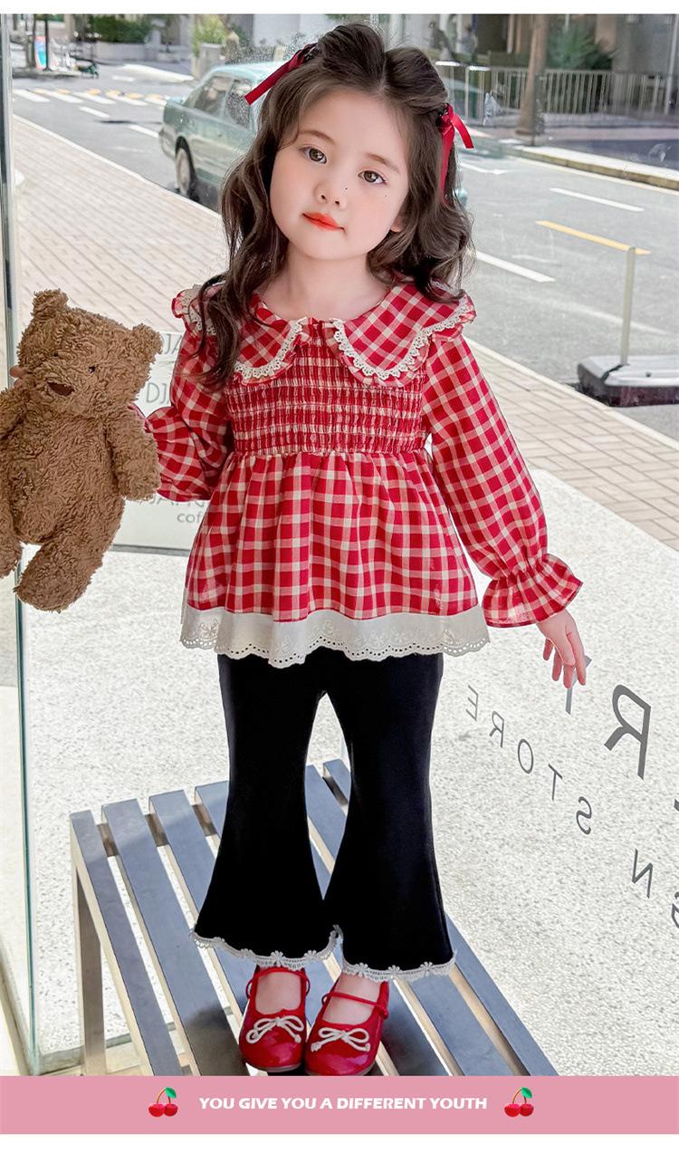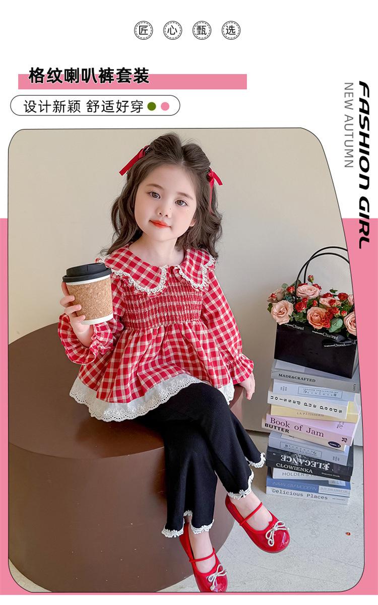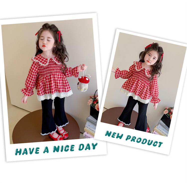 Conjunto da Moda Outono para Meninas Estilo Estrangeiro 2025 Novo Infantil Bebê Xadrez Camisa Boneca Calças Flare Conjunto Duas Peças Tendência