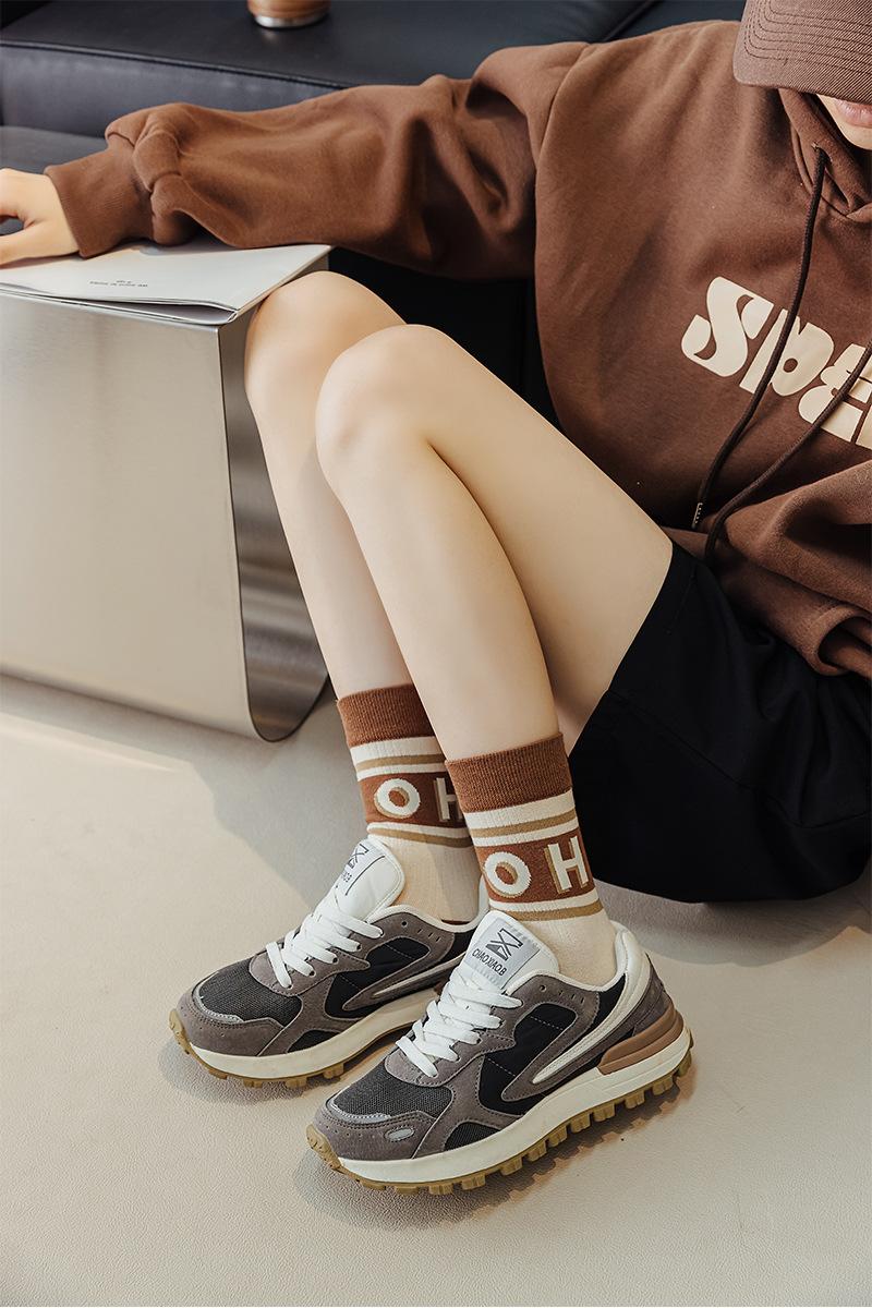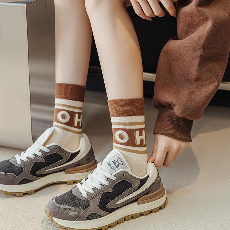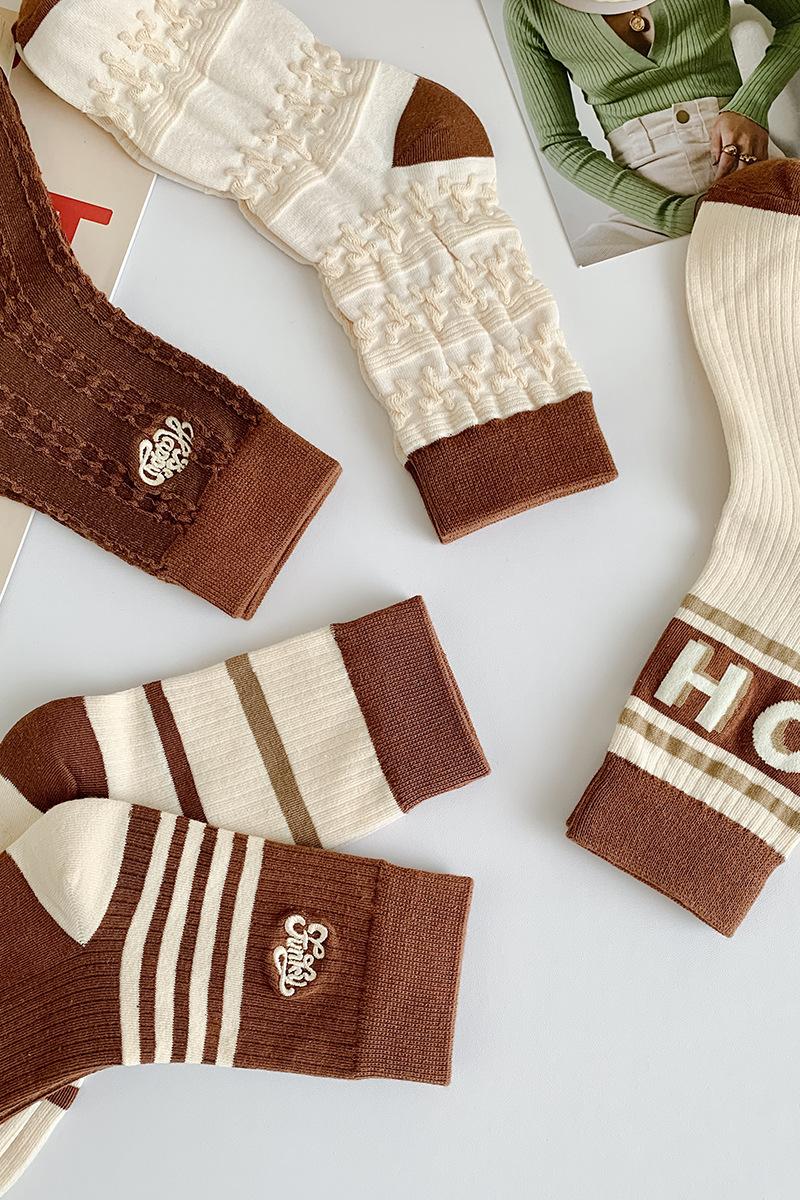Compre Meias Femininas Primavera Outono Cor Café Bloco de Cores Espessas Algodão Penteado Meias Agulha Dupla Meias Femininas Respiráveis Absorventes de Suor Aplicável às Quatro Estações no atacado no Joom.pro