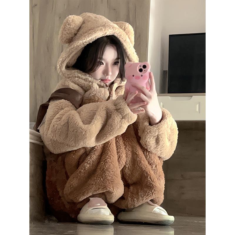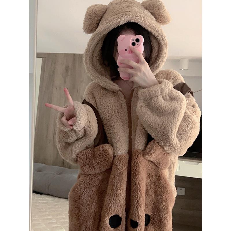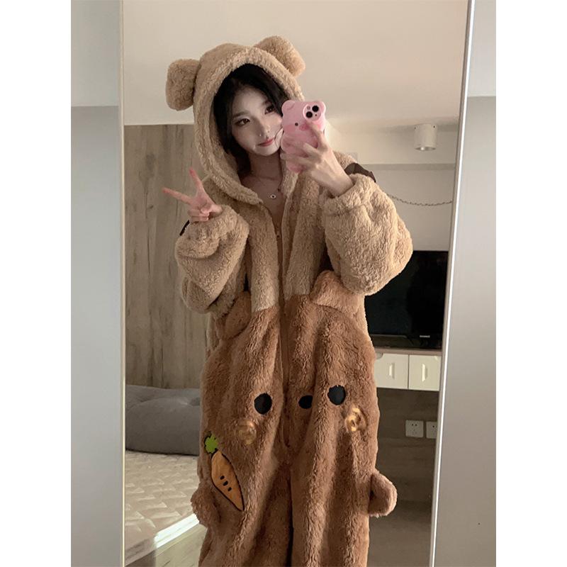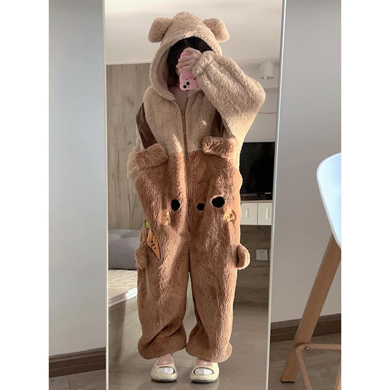 Pijama Macacão Urso Fofo Estilo Coreano Lã Coral Feminino Inverno Novo Pelúcia Espessura Lã Roupão de Banho Peça Única