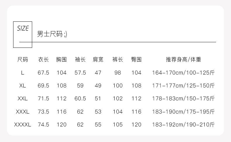L(100-125 catties), XL (125-150 catties), XXL (150-175 catties), XXXL(175-195 jin), XXXXL (190-210 catties)