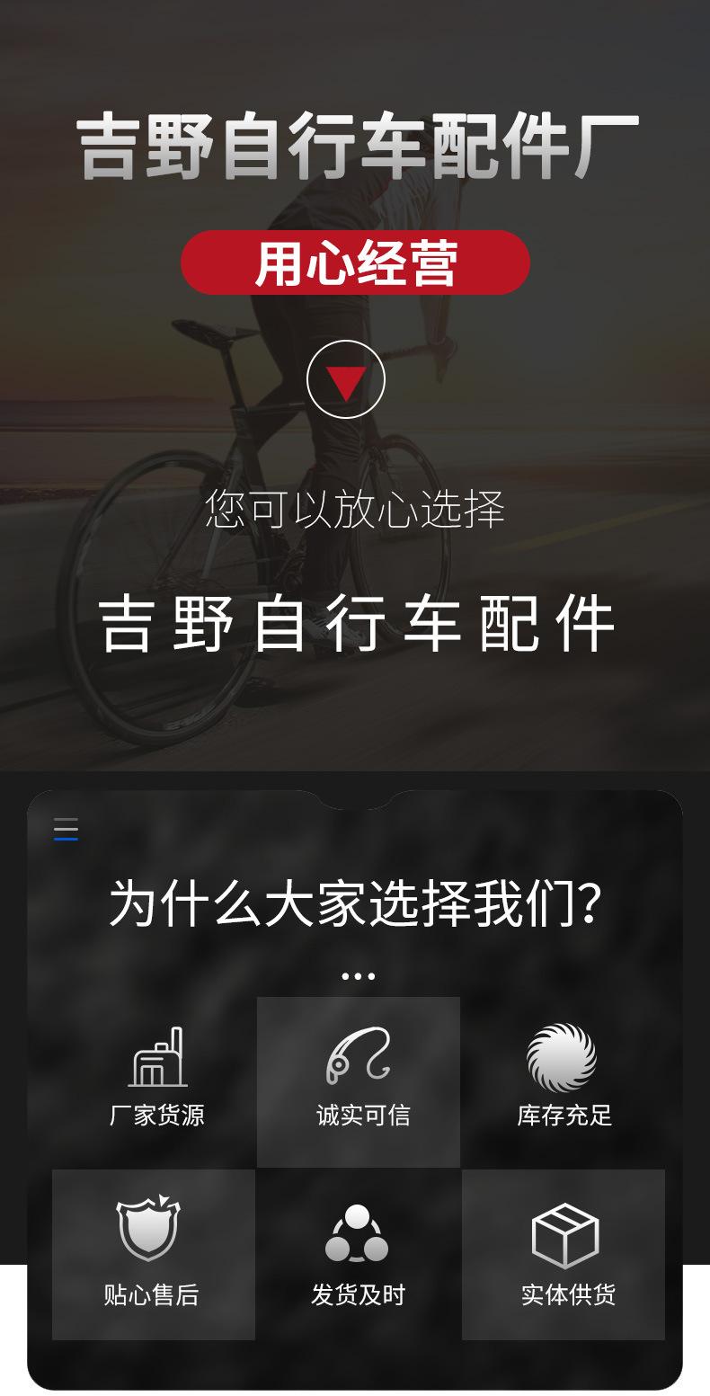 A Yoshino Bicycle Parts Factory lida principalmente com peças para bicicletas, mountain bike e veículos elétricos. Temos nossa própria rede de informações de produtos e parceiros em todo o país. Sob a orientação da filosofia empresarial de "gerir com o coração" e dos esforços incessantes de todos os funcionários, a nossa empresa está prosperando. A empresa valoriza o crédito, cumpre os contratos, garante as especificações dos produtos, tem uma grande variedade de produtos e preços razoáveis, e conquistou a confiança dos clientes com as suas características empresariais multi-variedades e o princípio dos pequenos lucros mas do rápido volume de negócios.
