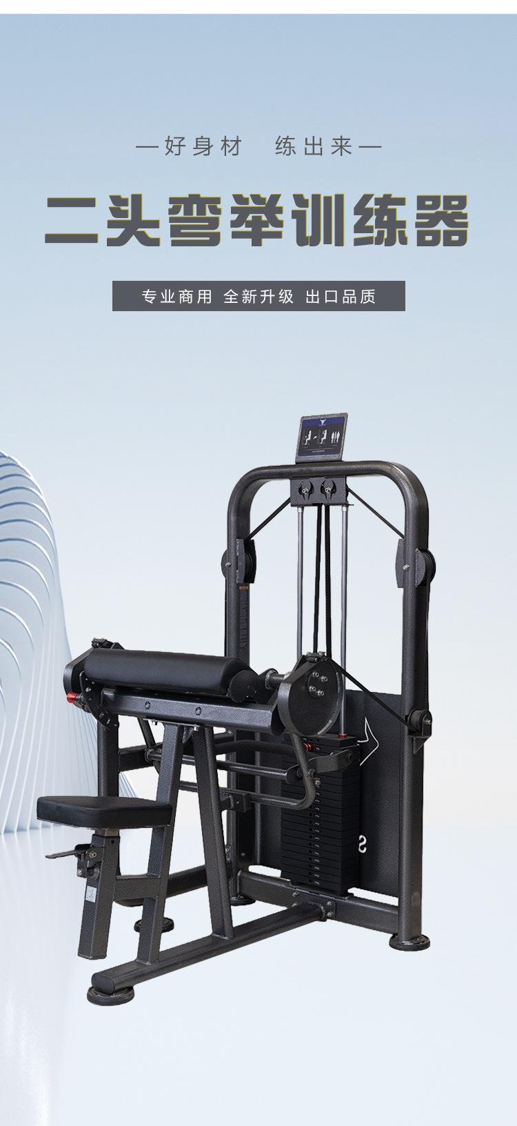 Gym personal trainer uses a full set of strength training equipment, biceps training machine