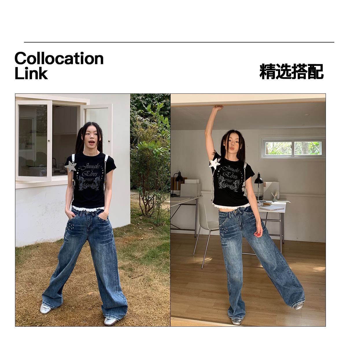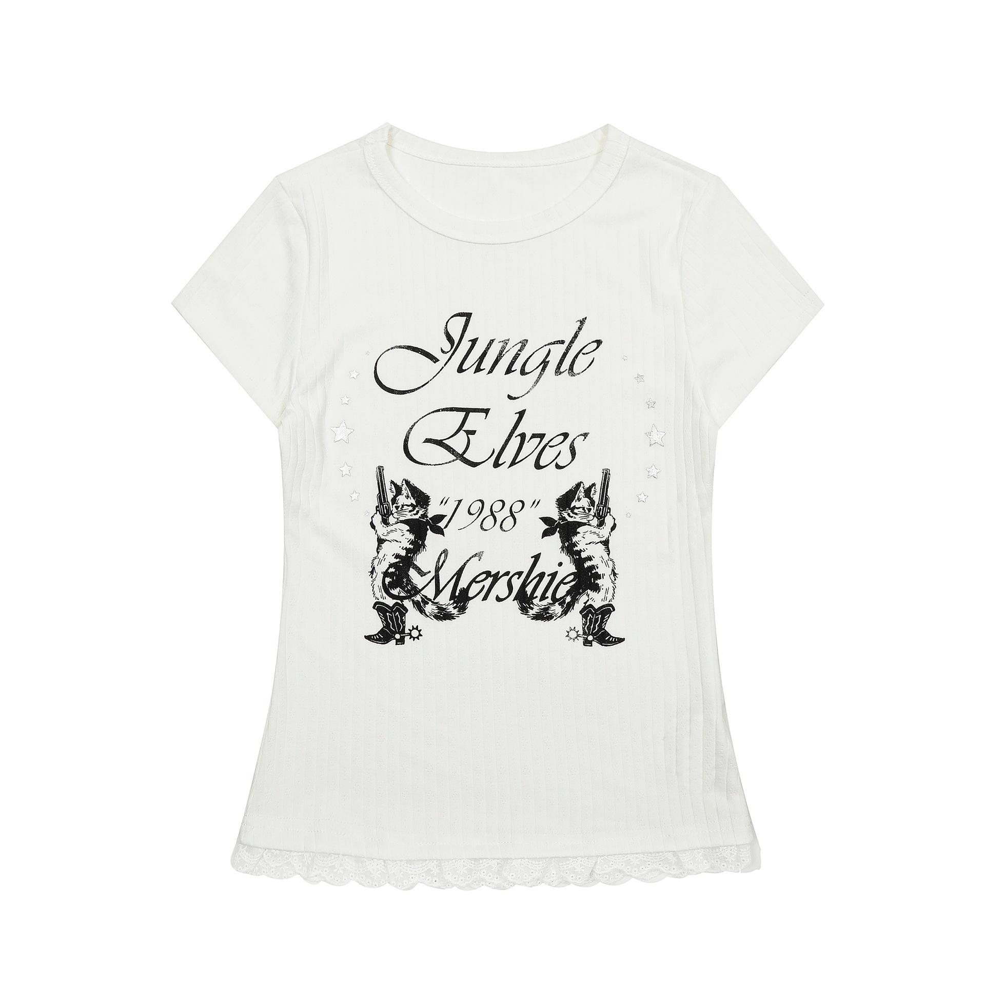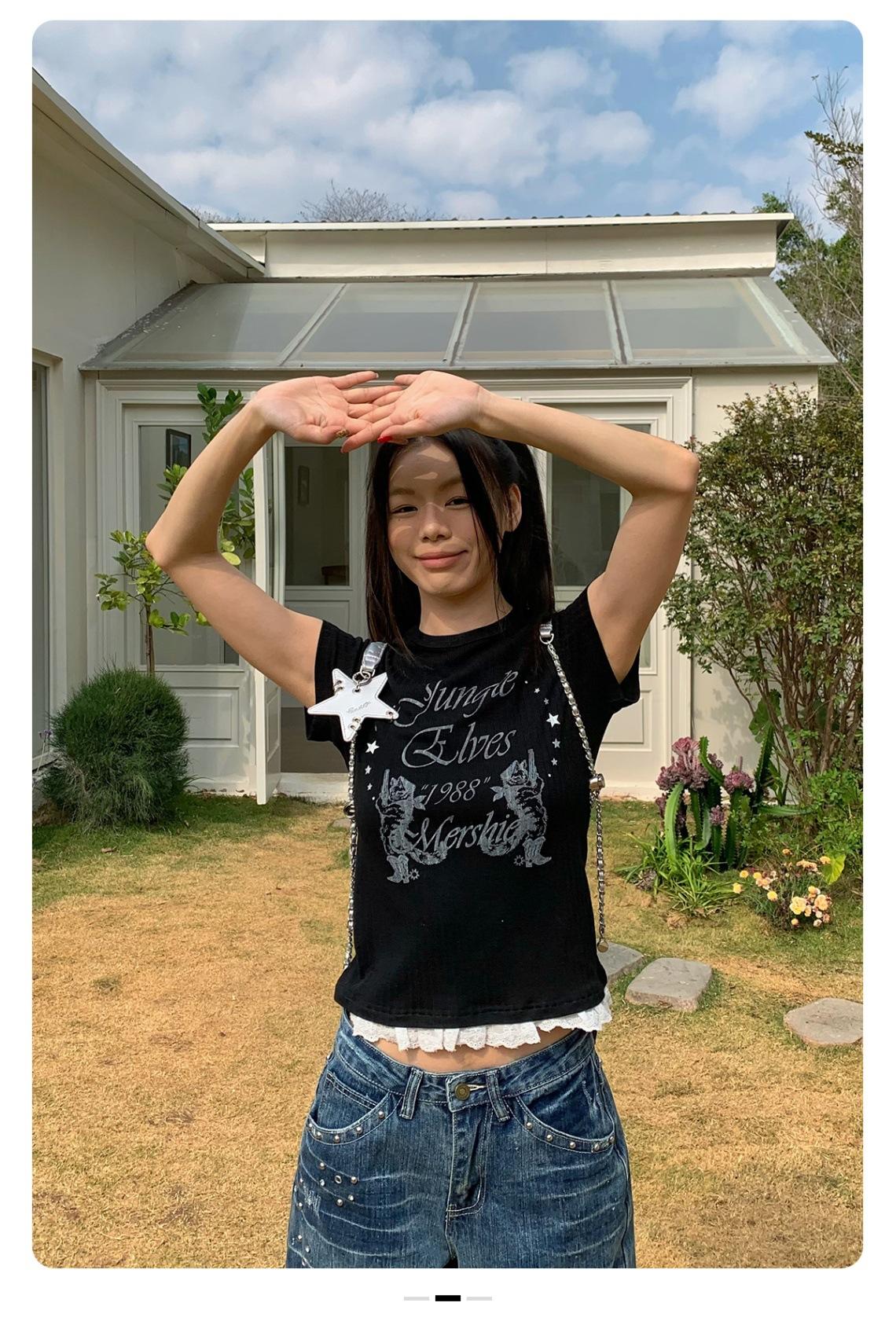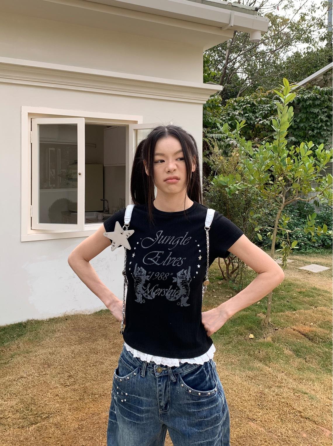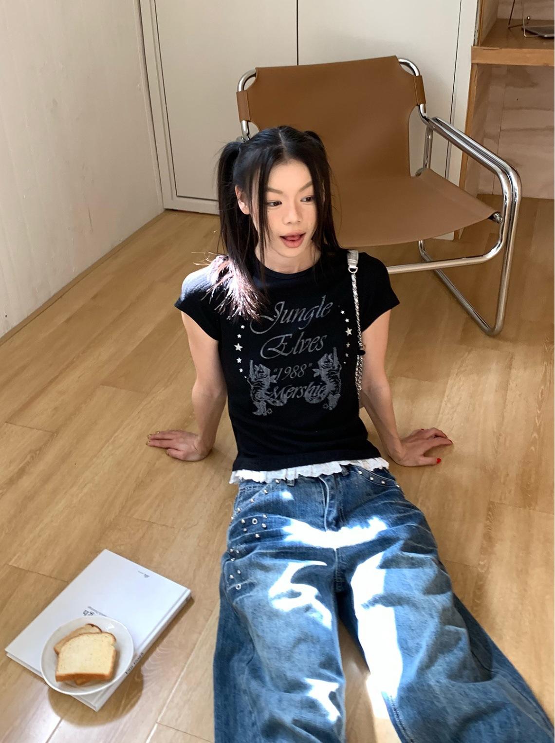 Camiseta Curta Feminina de Verão Sexy Slim com Renda de Borda Retrô Americana, Manga Curta, Nicho Único, Top Preto