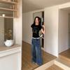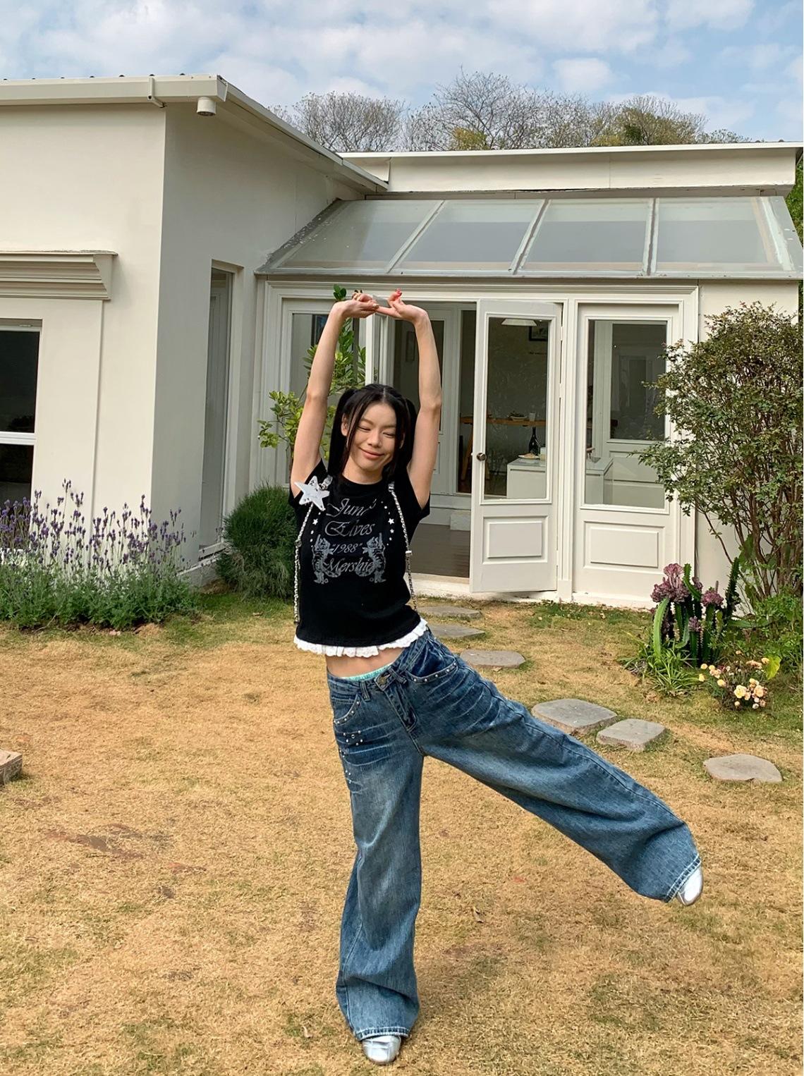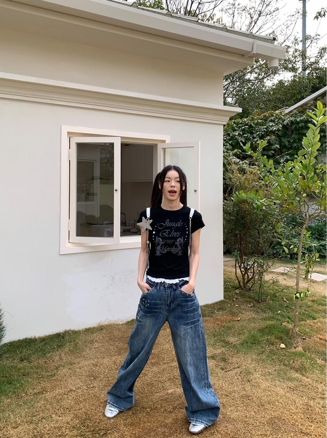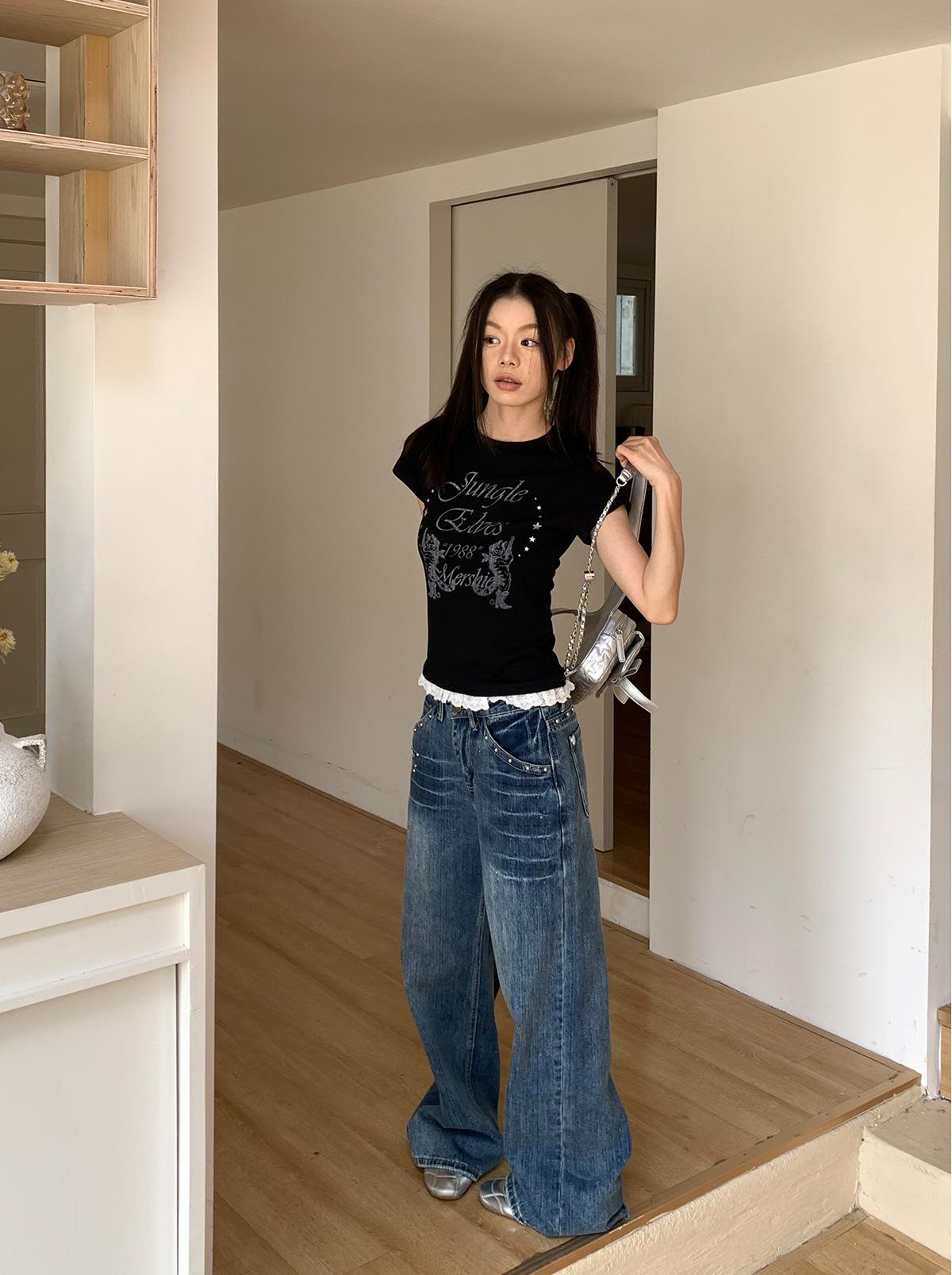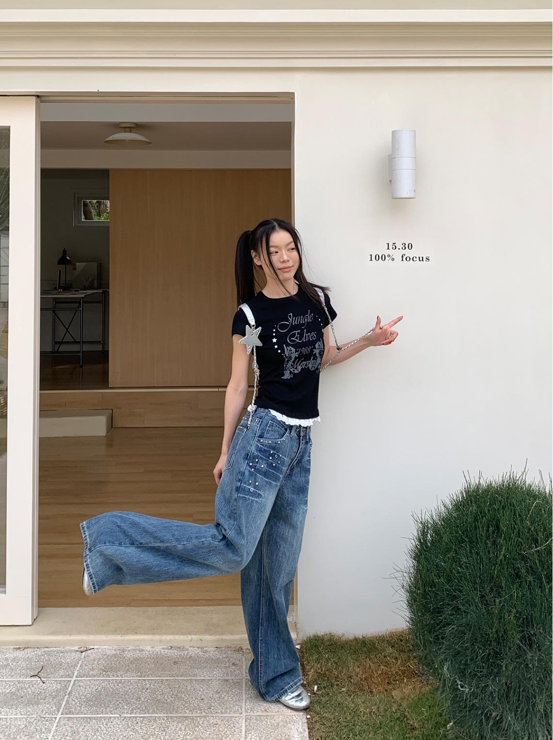Camiseta Curta Feminina de Verão Sexy Slim com Renda de Borda Retrô Americana, Manga Curta, Nicho Único, Top Preto