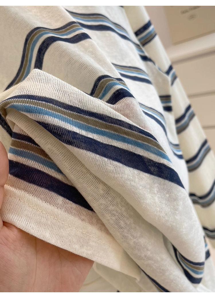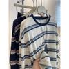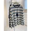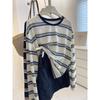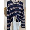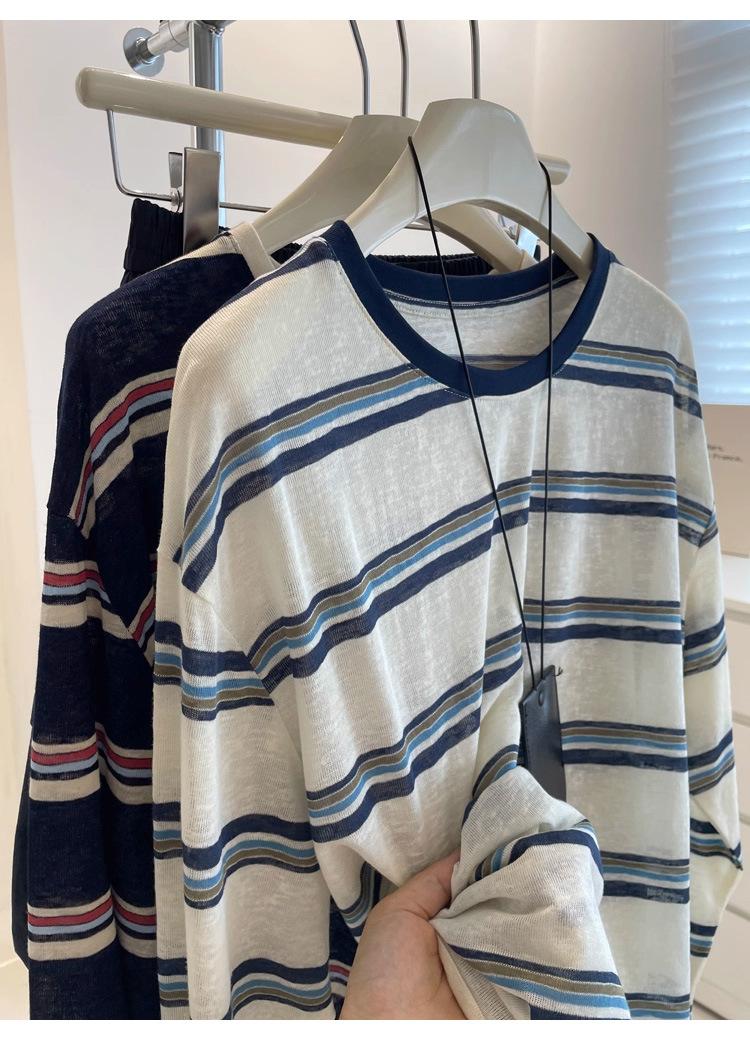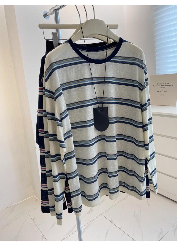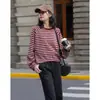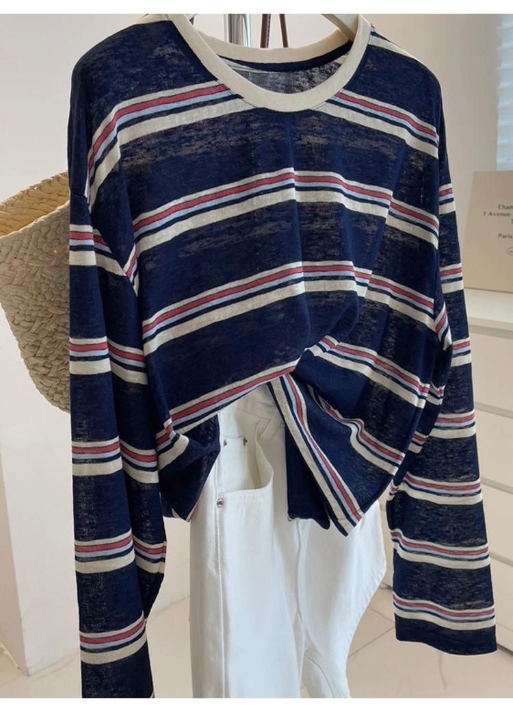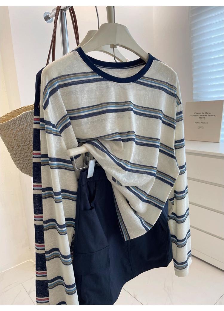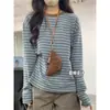 Camiseta Fina de Bloco de Cor Listrada Gola Careca Feminina Outono Casual Versátil Protetor Solar Cobertura Emagrecimento Relaxada Manga Longa