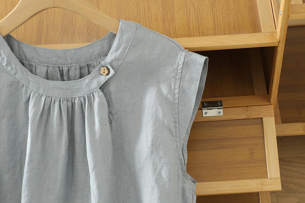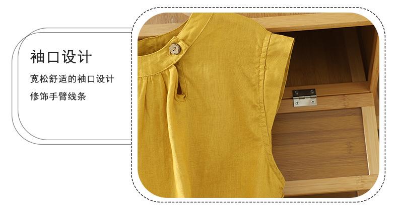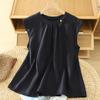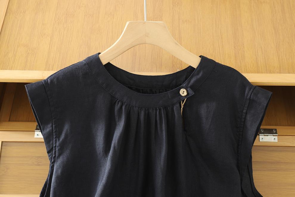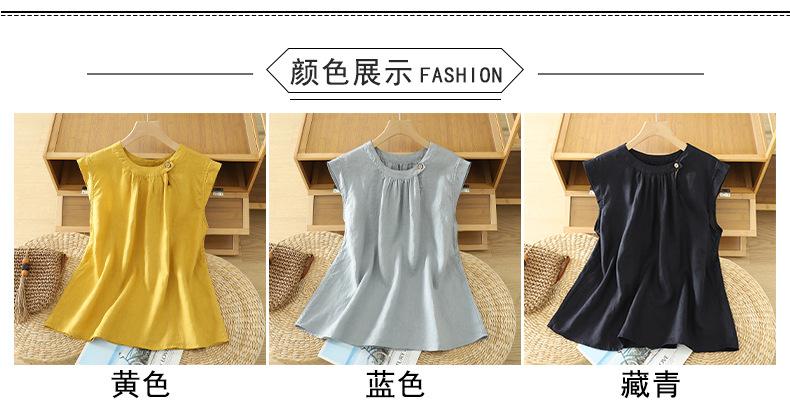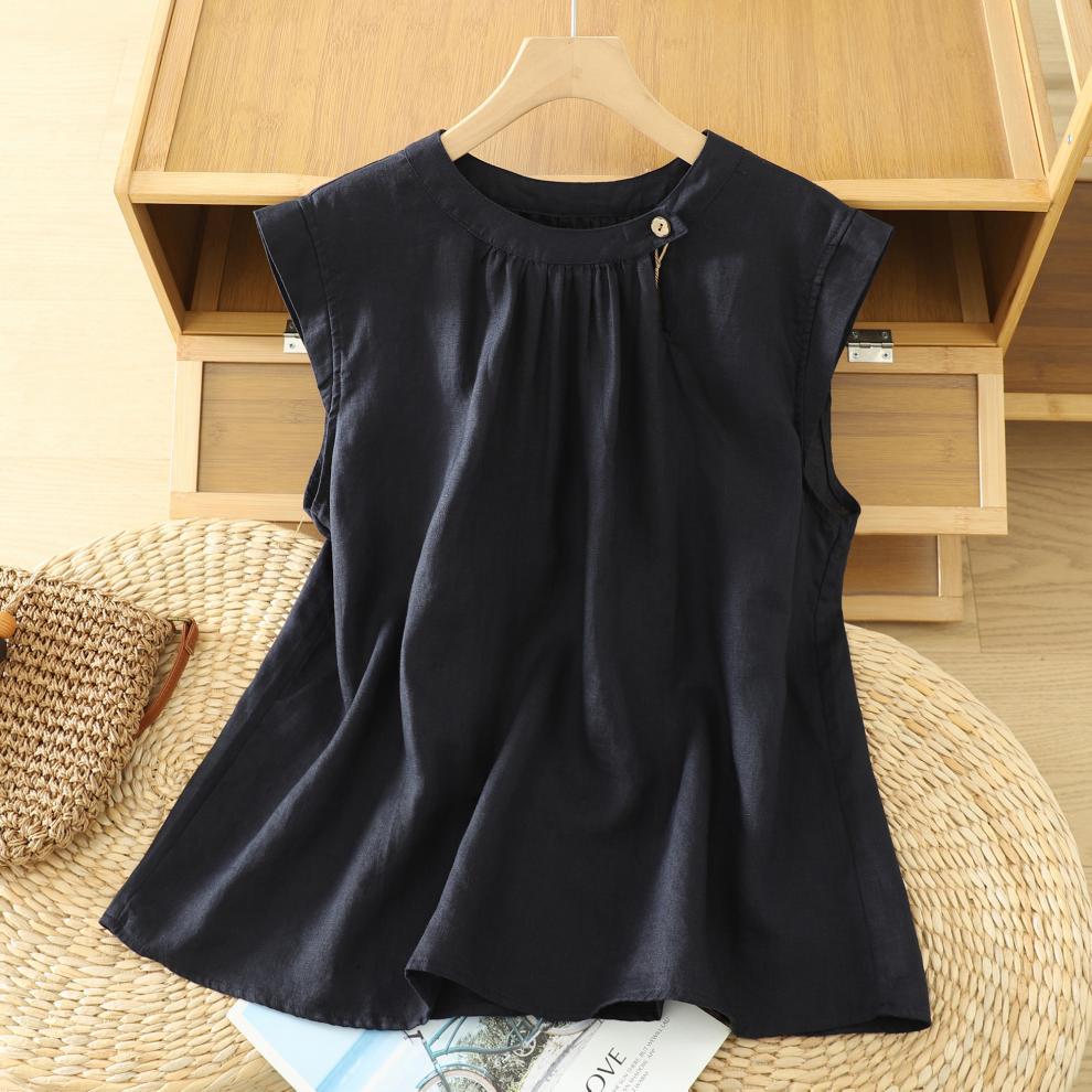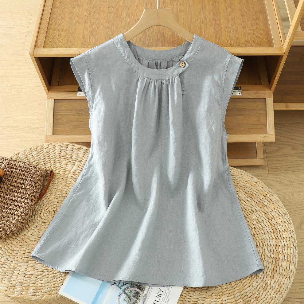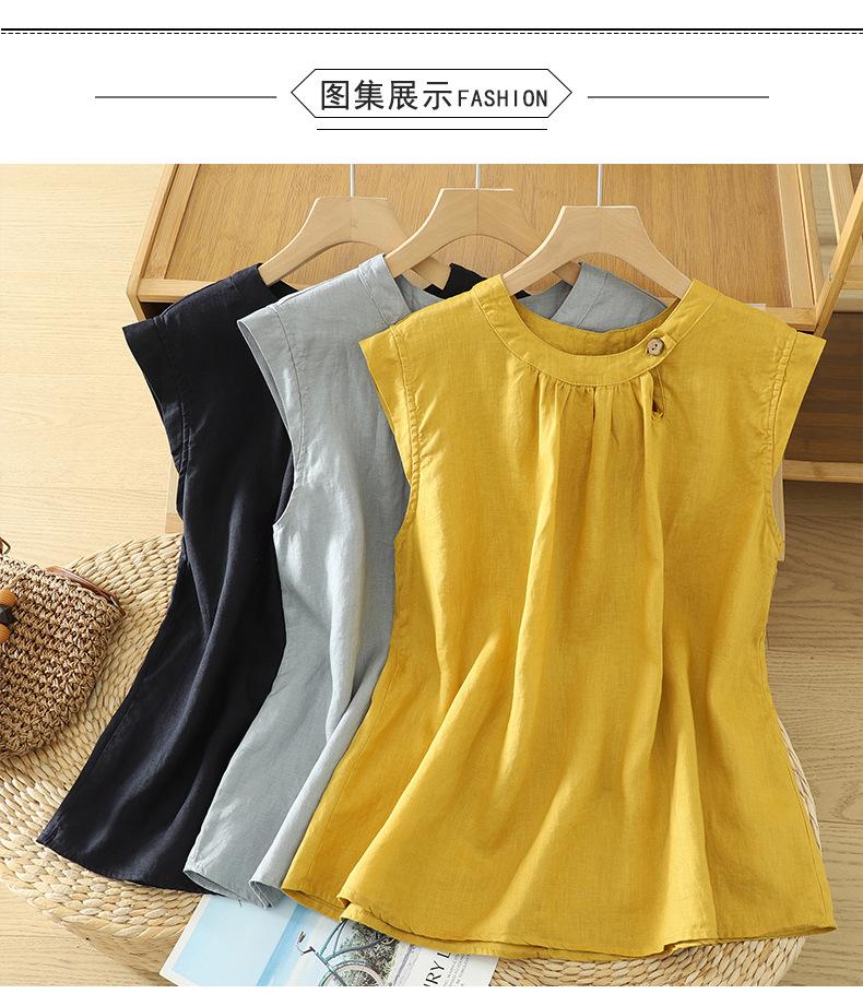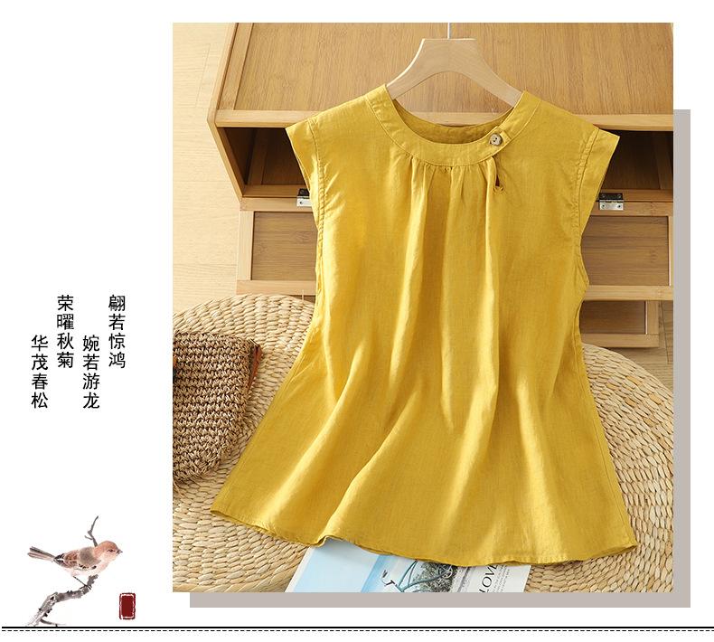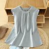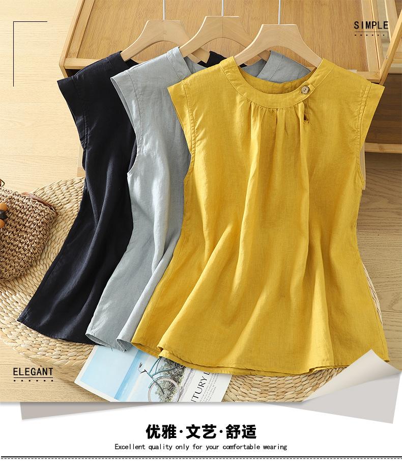 Foto real em estoque verão 2025 novo senso de design gola redonda algodão e linho regata sem mangas mulheres versátil top manga bufante pequena mulheres