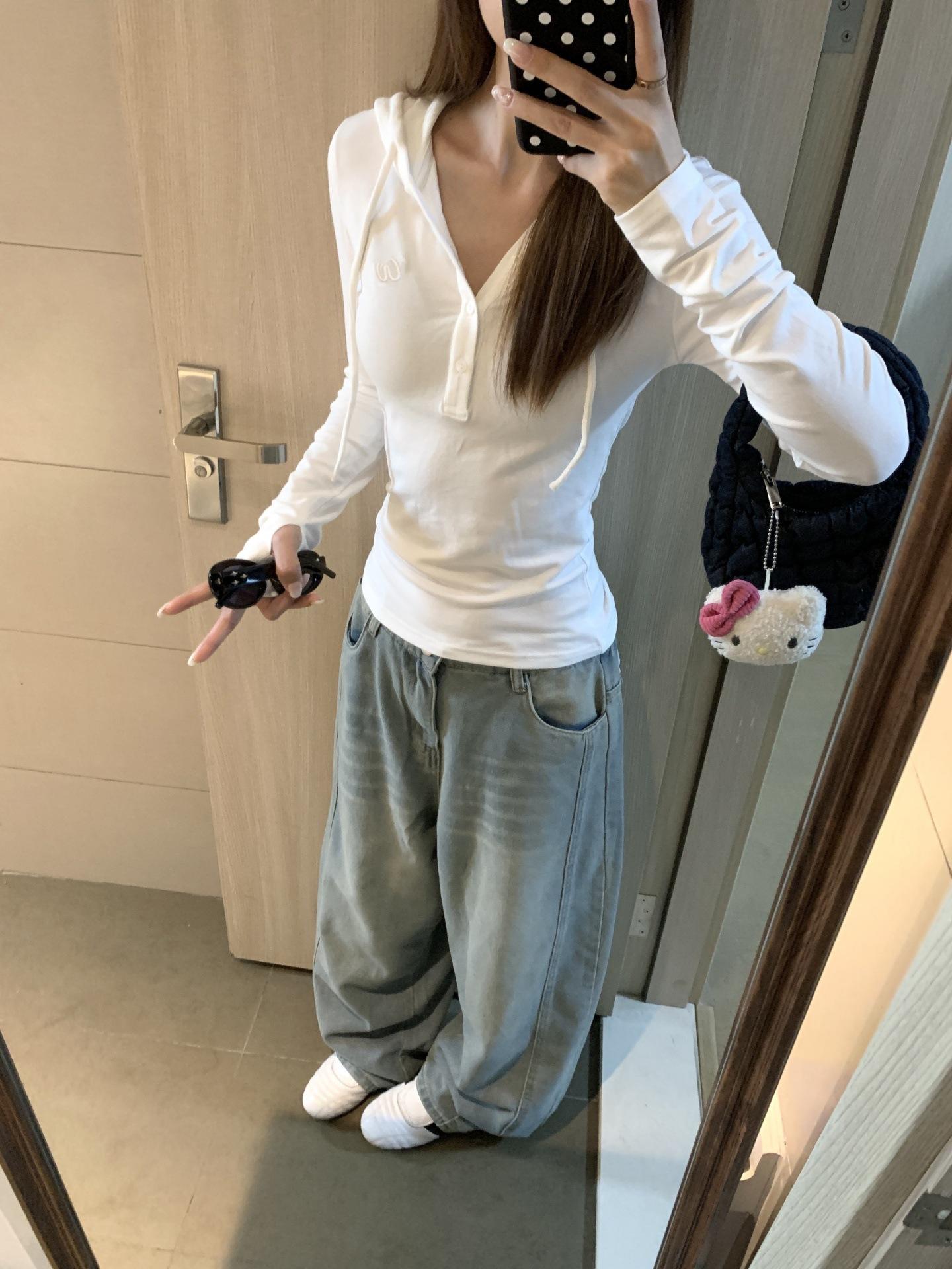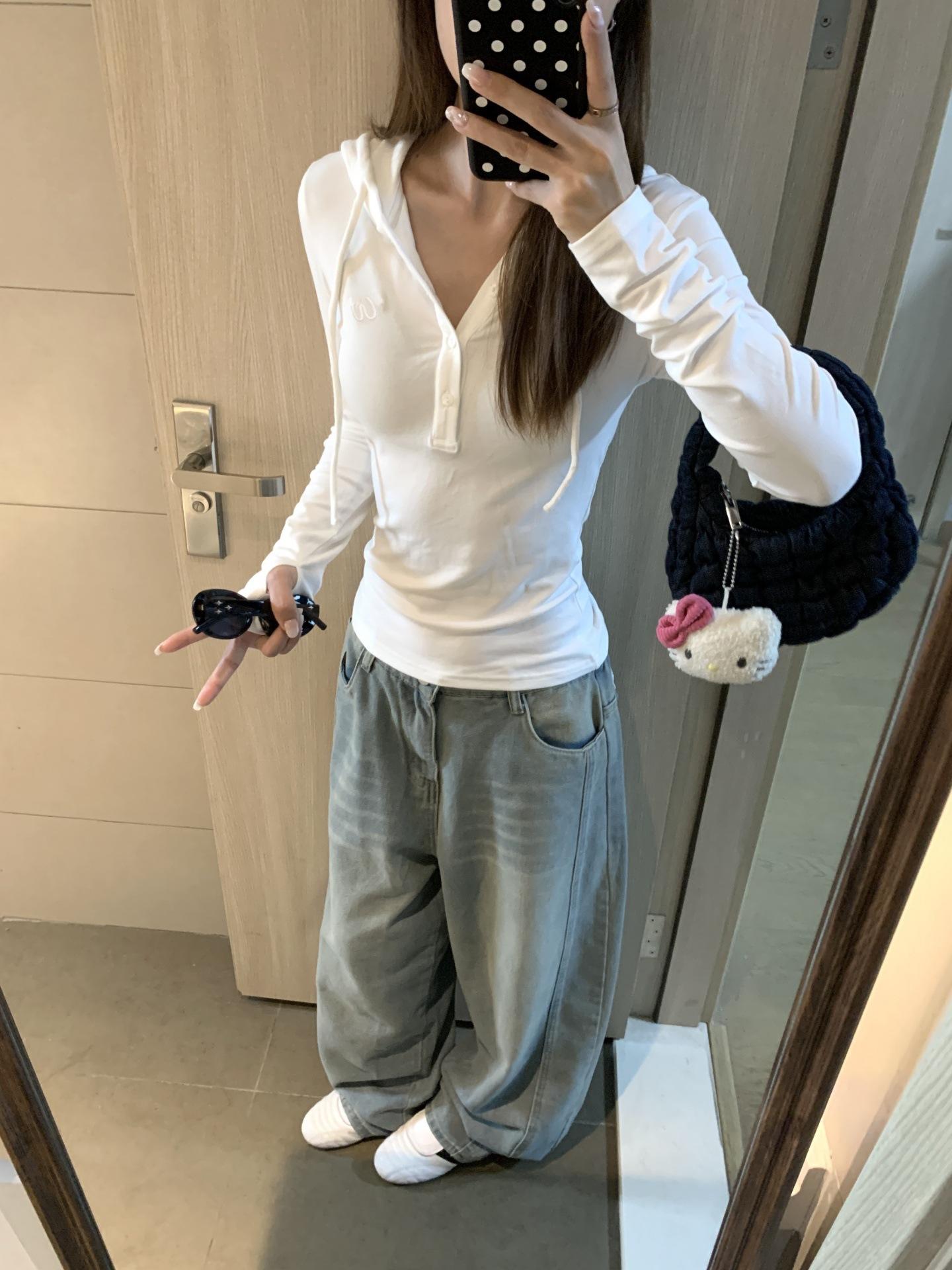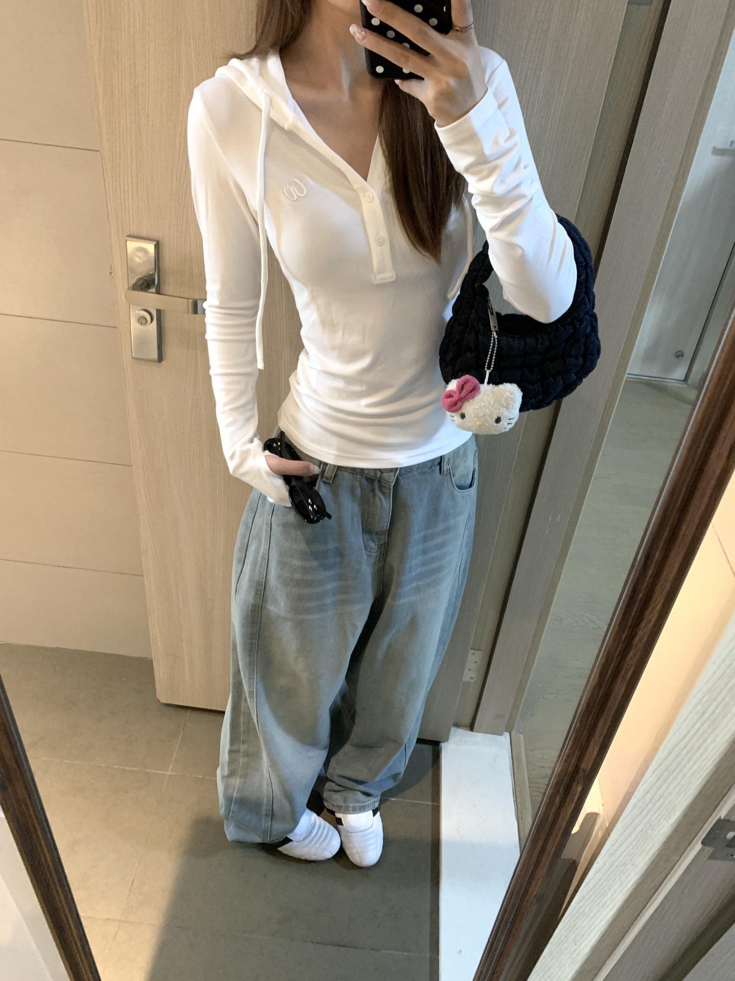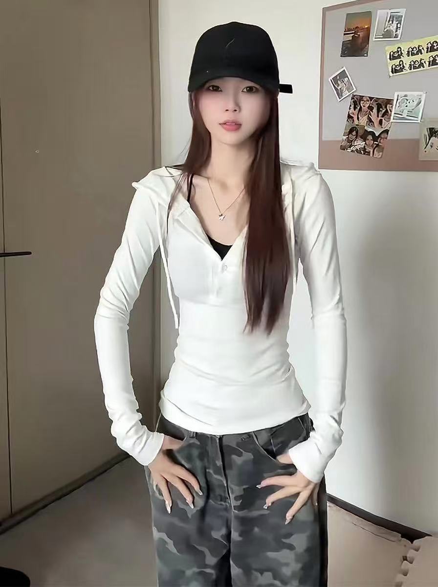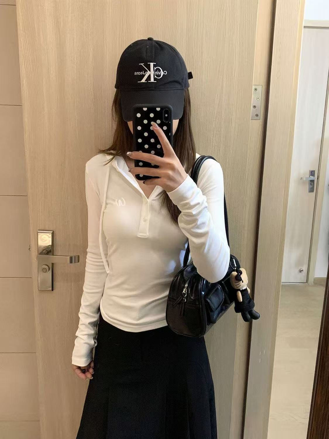 Camiseta feminina americana picante com gola meio aberta com botões, capuz e manga comprida, nova moda de início de outono, branca, justa, curta