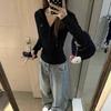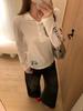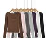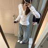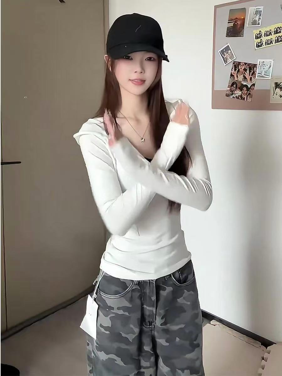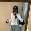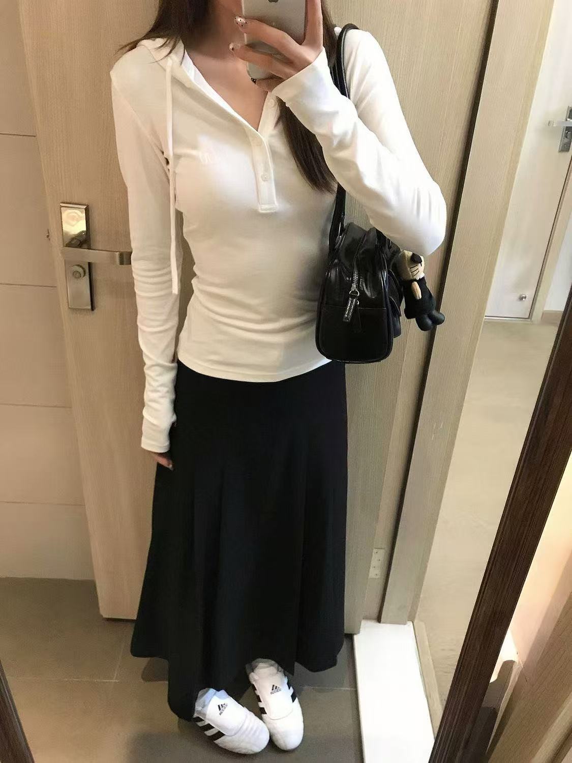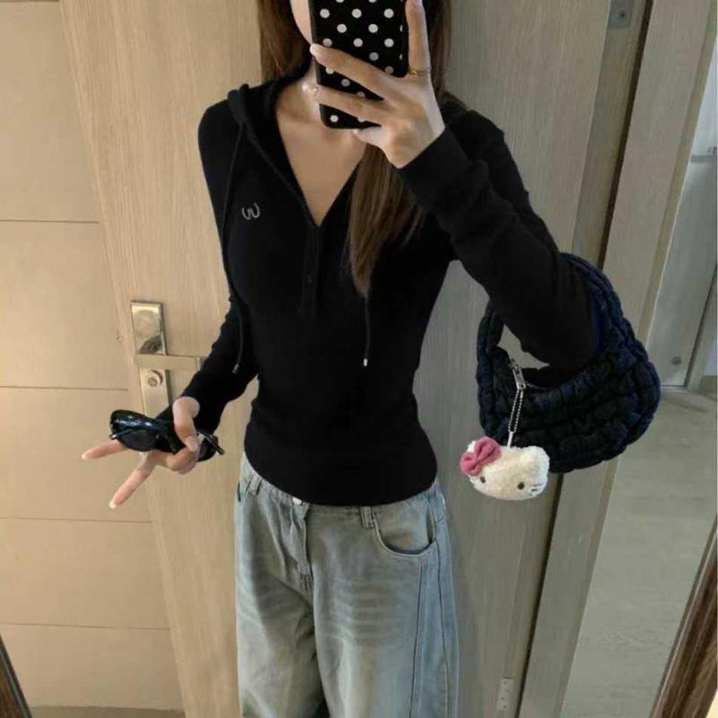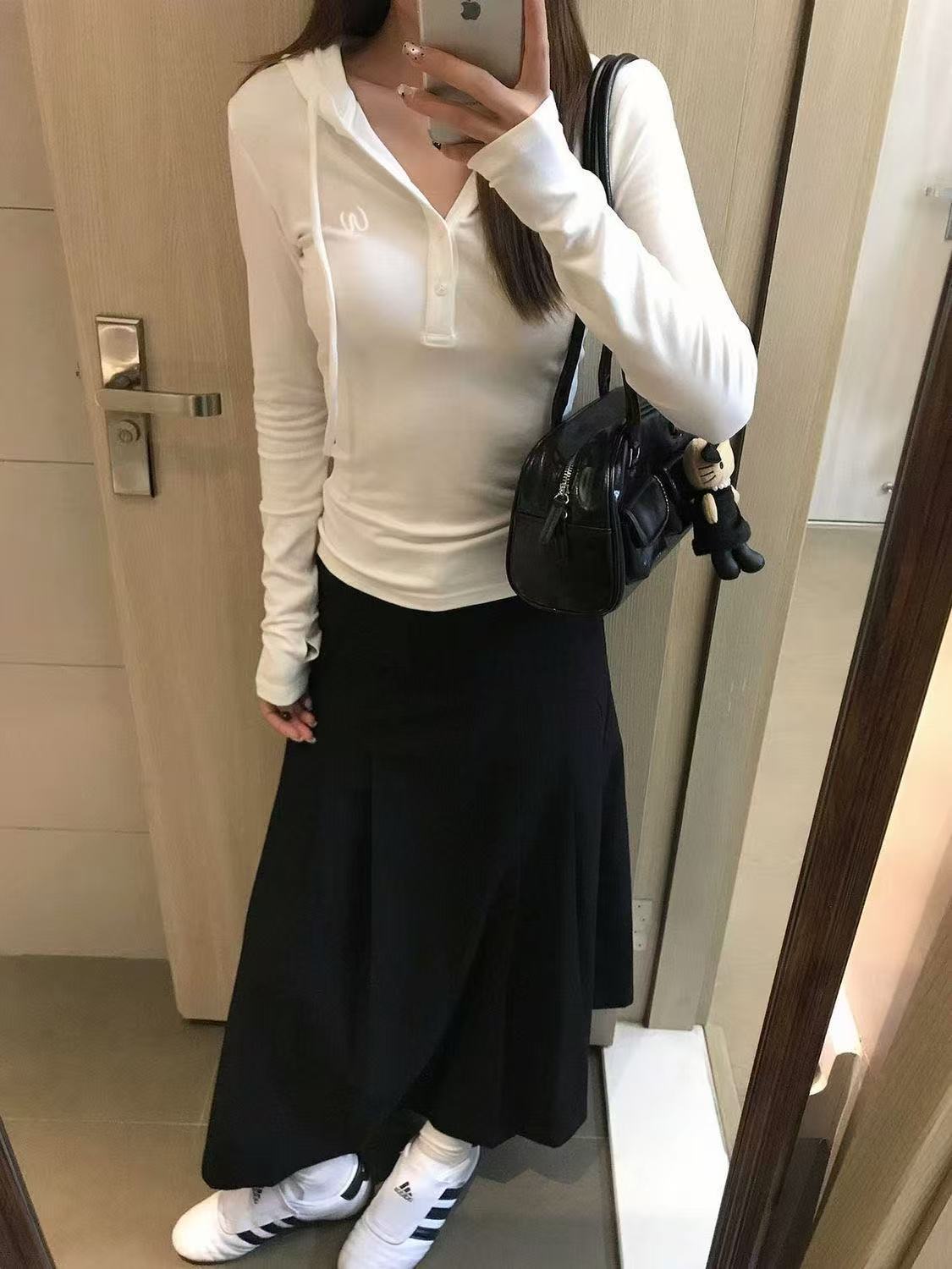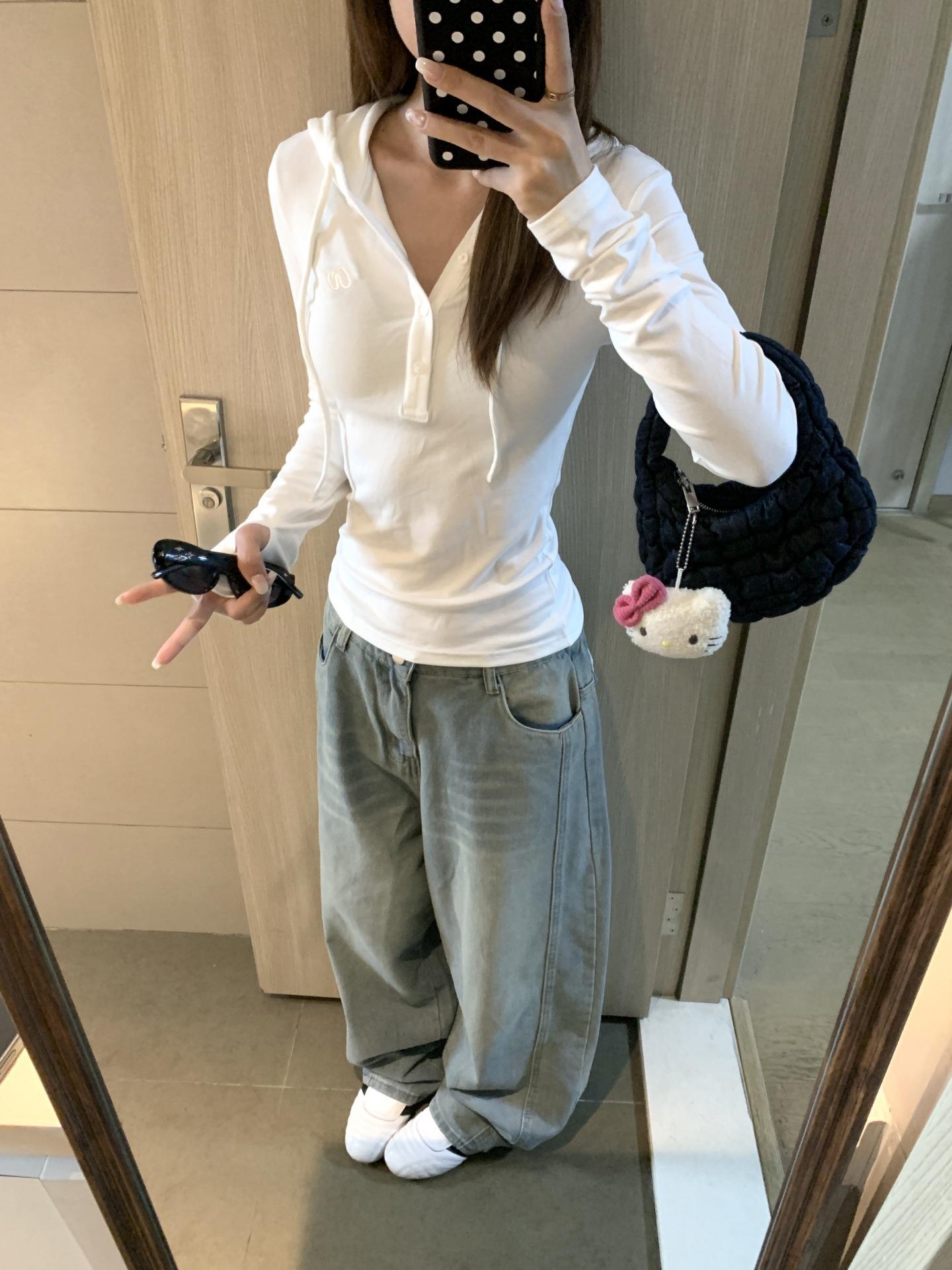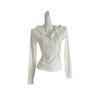 Camiseta feminina americana picante com gola meio aberta com botões, capuz e manga comprida, nova moda de início de outono, branca, justa, curta