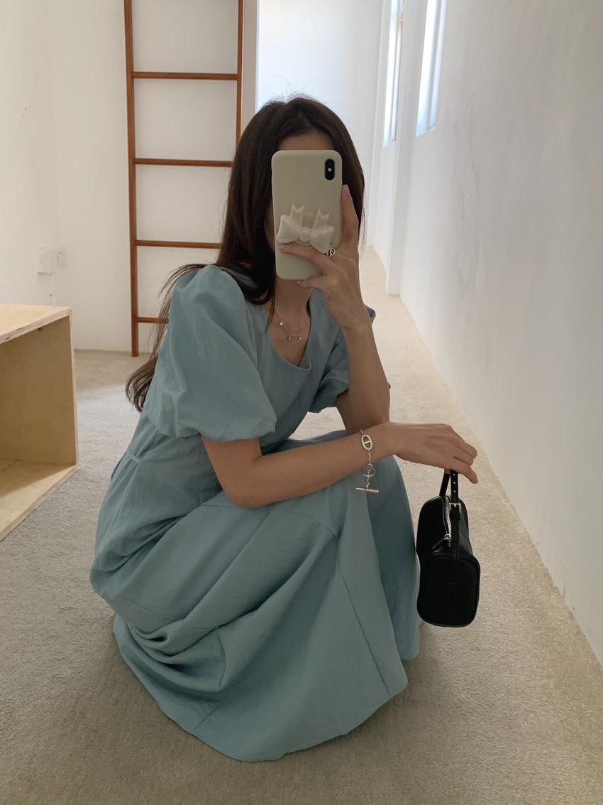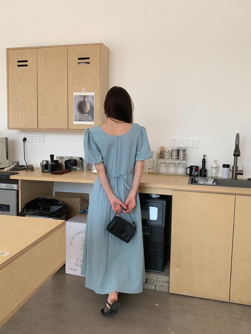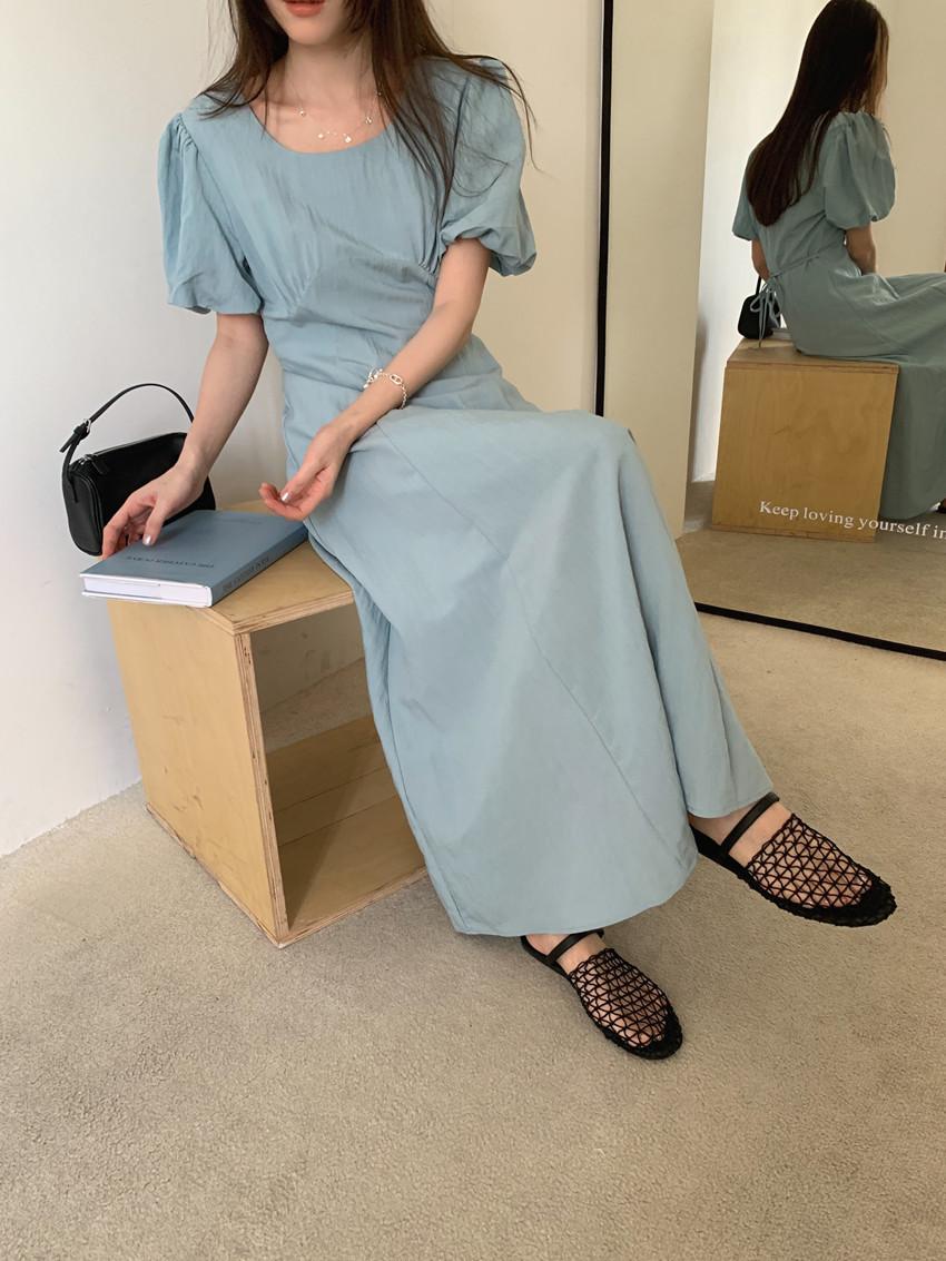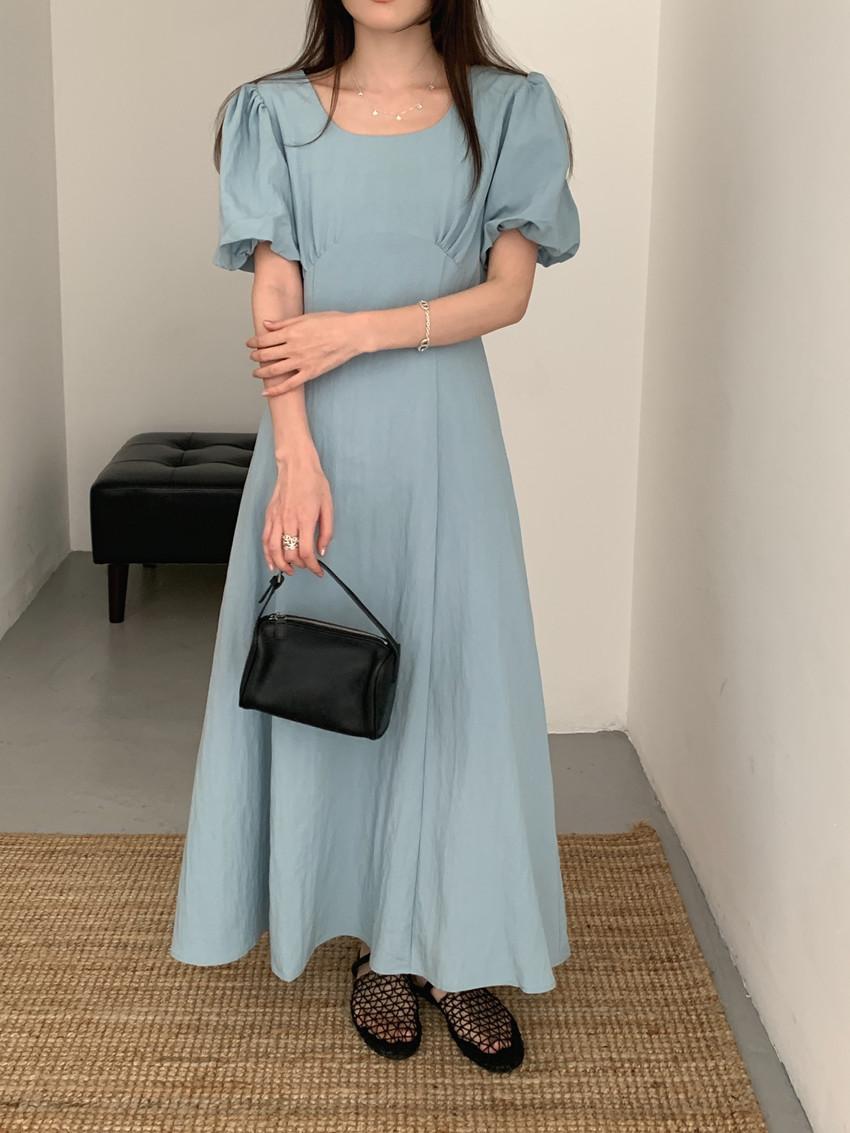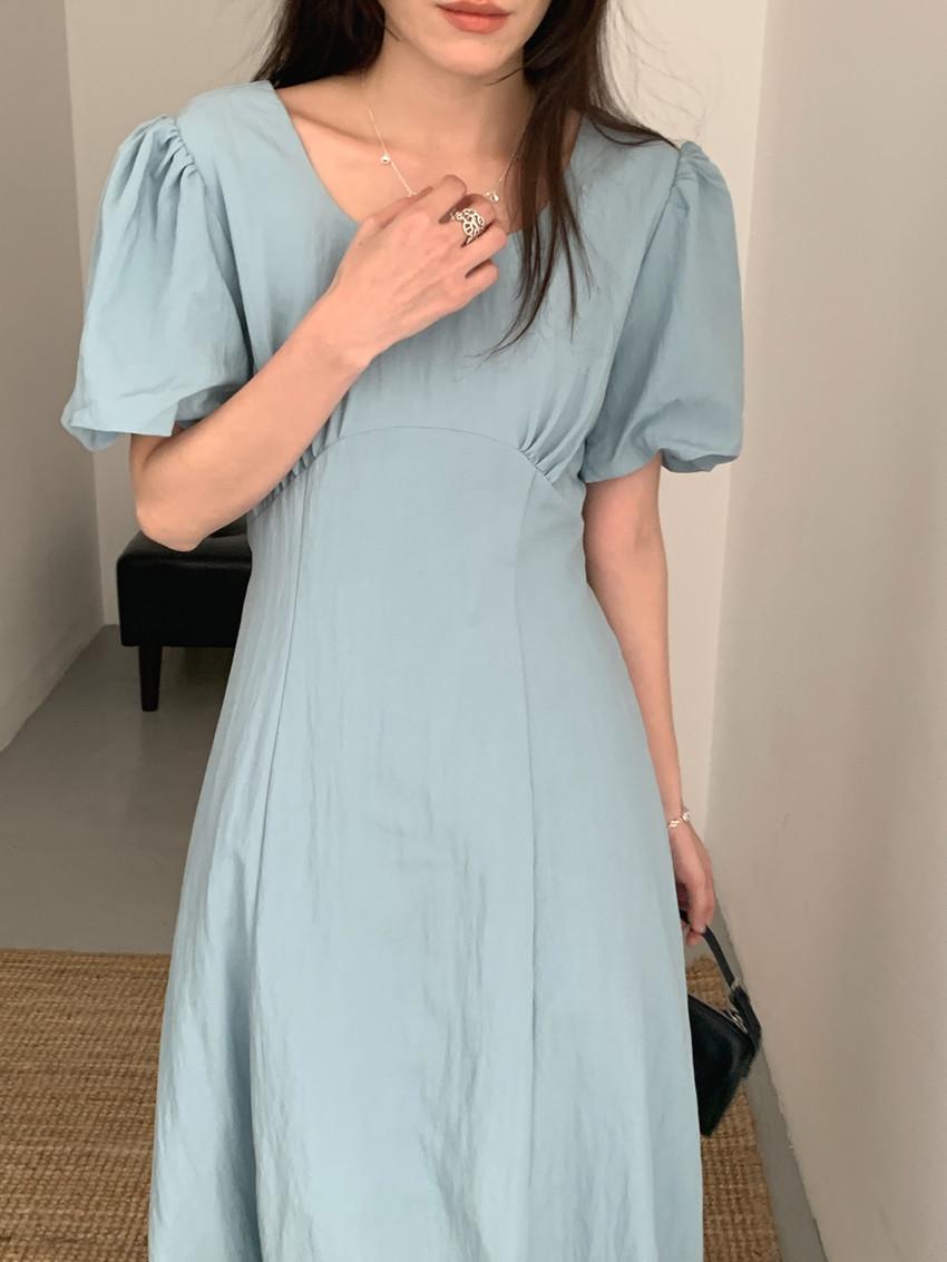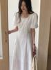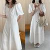 Compre Luar Branco Suave~Design Decote U Manga Bufante Cintura Marcada Amarrar Vestido Longo no atacado no Joom.pro