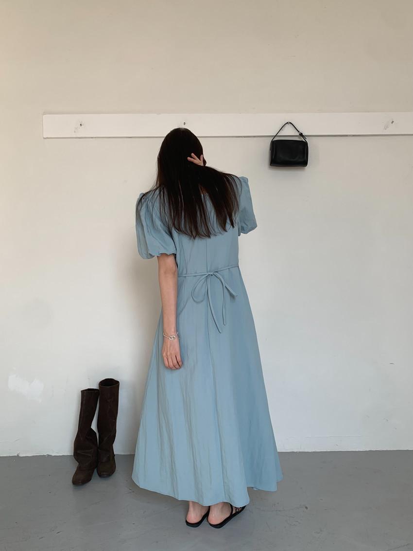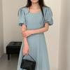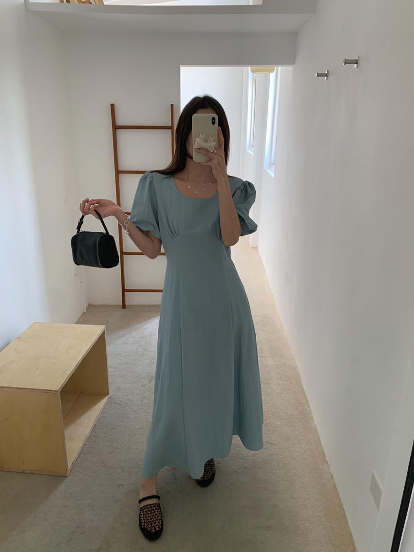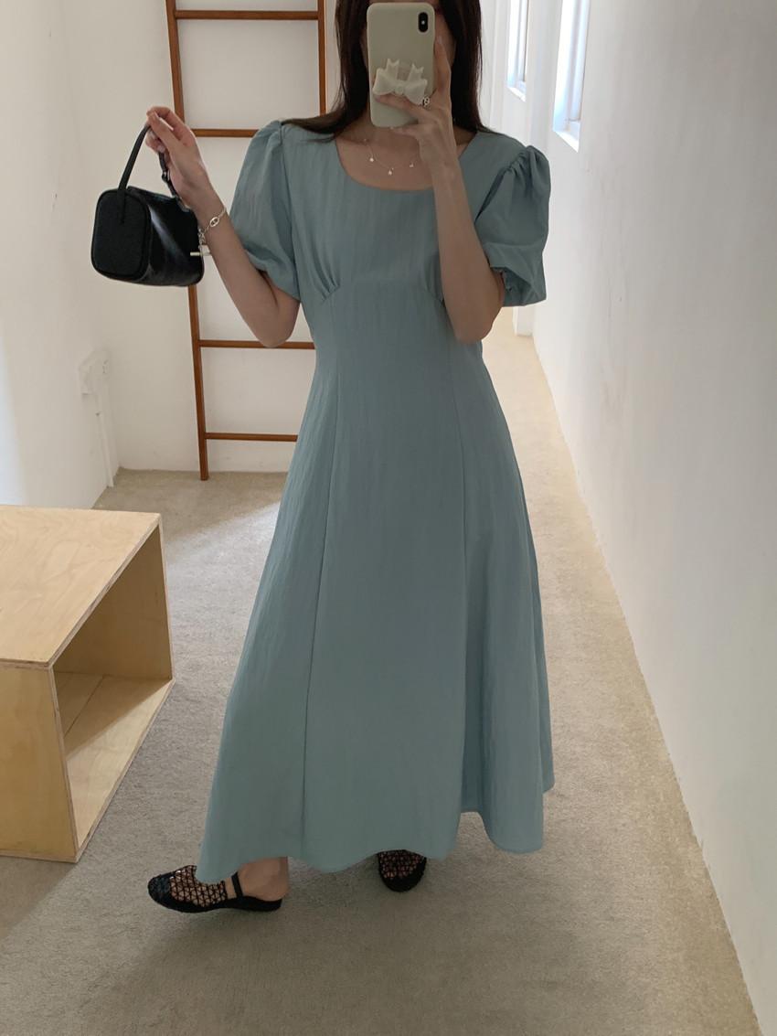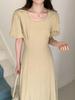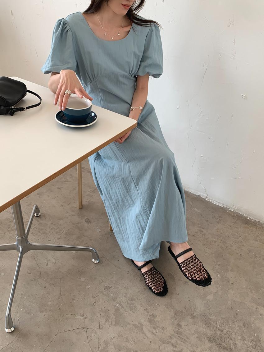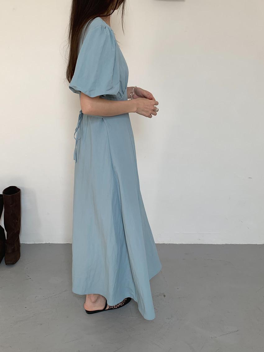 Compre Luar Branco Suave~Design Decote U Manga Bufante Cintura Marcada Amarrar Vestido Longo no atacado no Joom.pro
