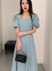 Luar Branco Suave~Design Decote U Manga Bufante Cintura Marcada Amarrar Vestido Longo