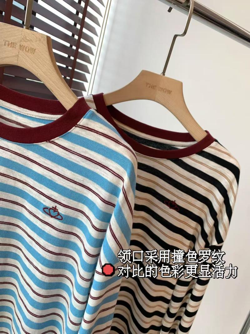 O decote usa tecido canelado contrastante, e as cores contrastantes são mais vibrantes.