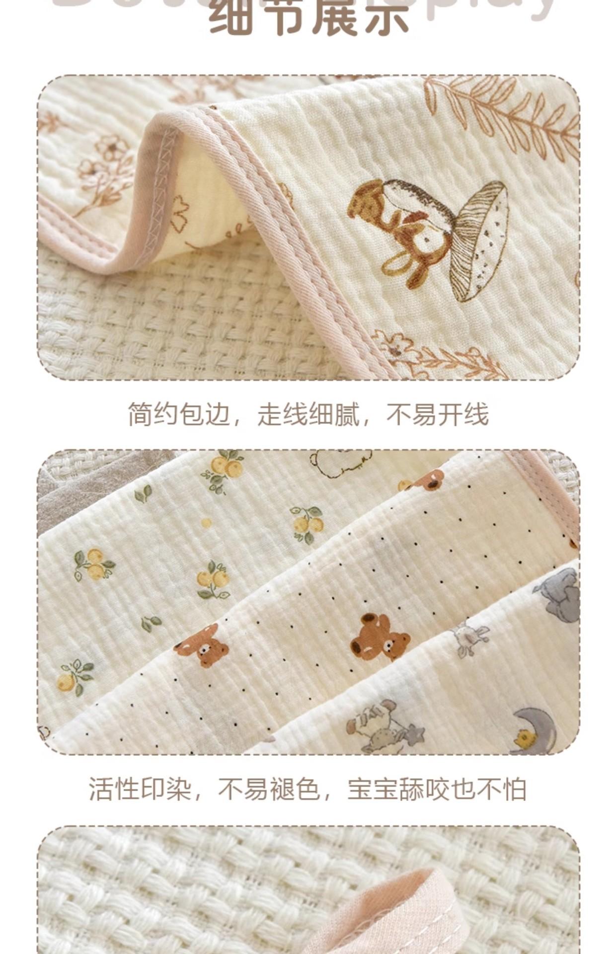 Toalha quadrada de gaze de algodão para bebês e crianças pequenas Tecido de gaze de quatro camadas de algodão puro natural selecionado, leve e macio como uma nuvem Toque delicado e sedoso, envolve suavemente a pele delicada do bebê Design crepe seersucker, fofo, macio e super absorvente Adotando um processo de estamparia e tingimento reativo ecologicamente correto, as cores são puras e suaves. Alta solidez da cor, durável e não desbota facilmente Uma toalha, múltiplos usos, pode ser usada como babador para baba, pano de rosto, toalha de banho, etc. Qualidade Classe A, sem fluorescência