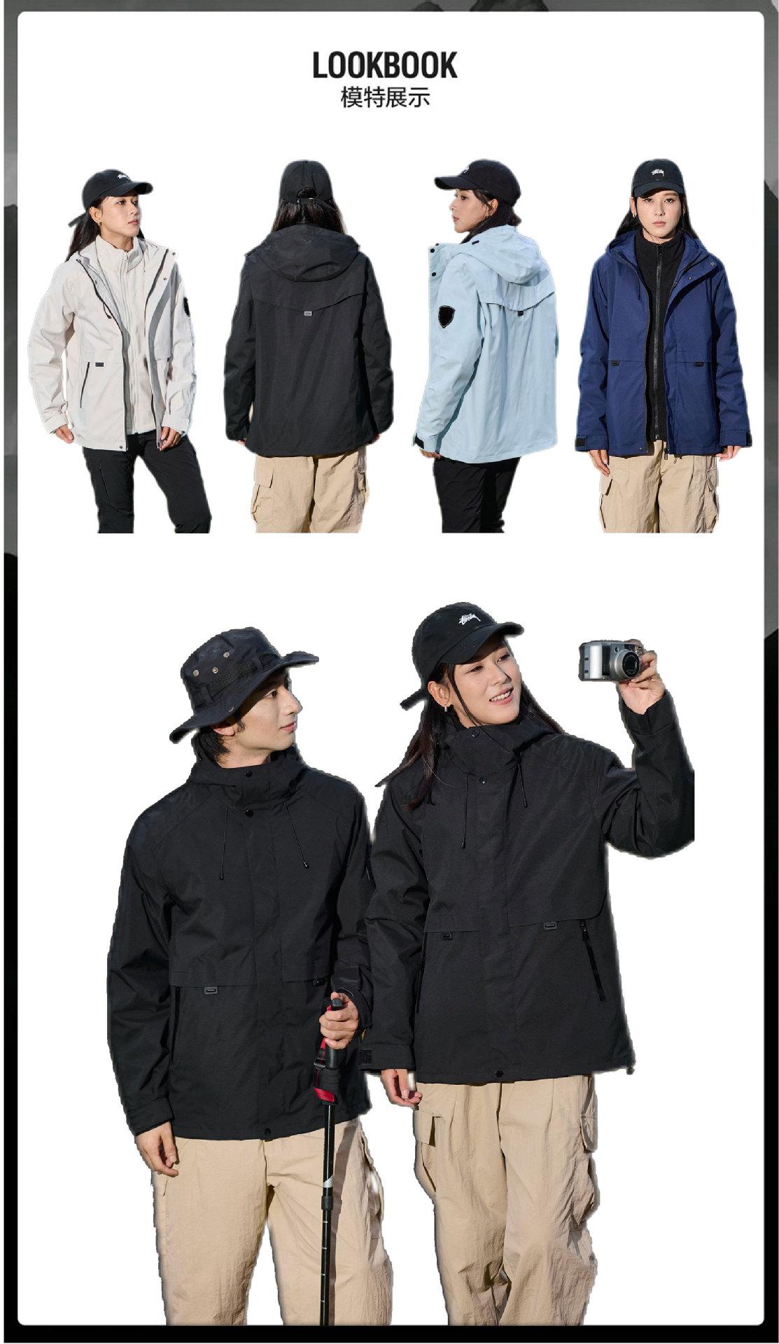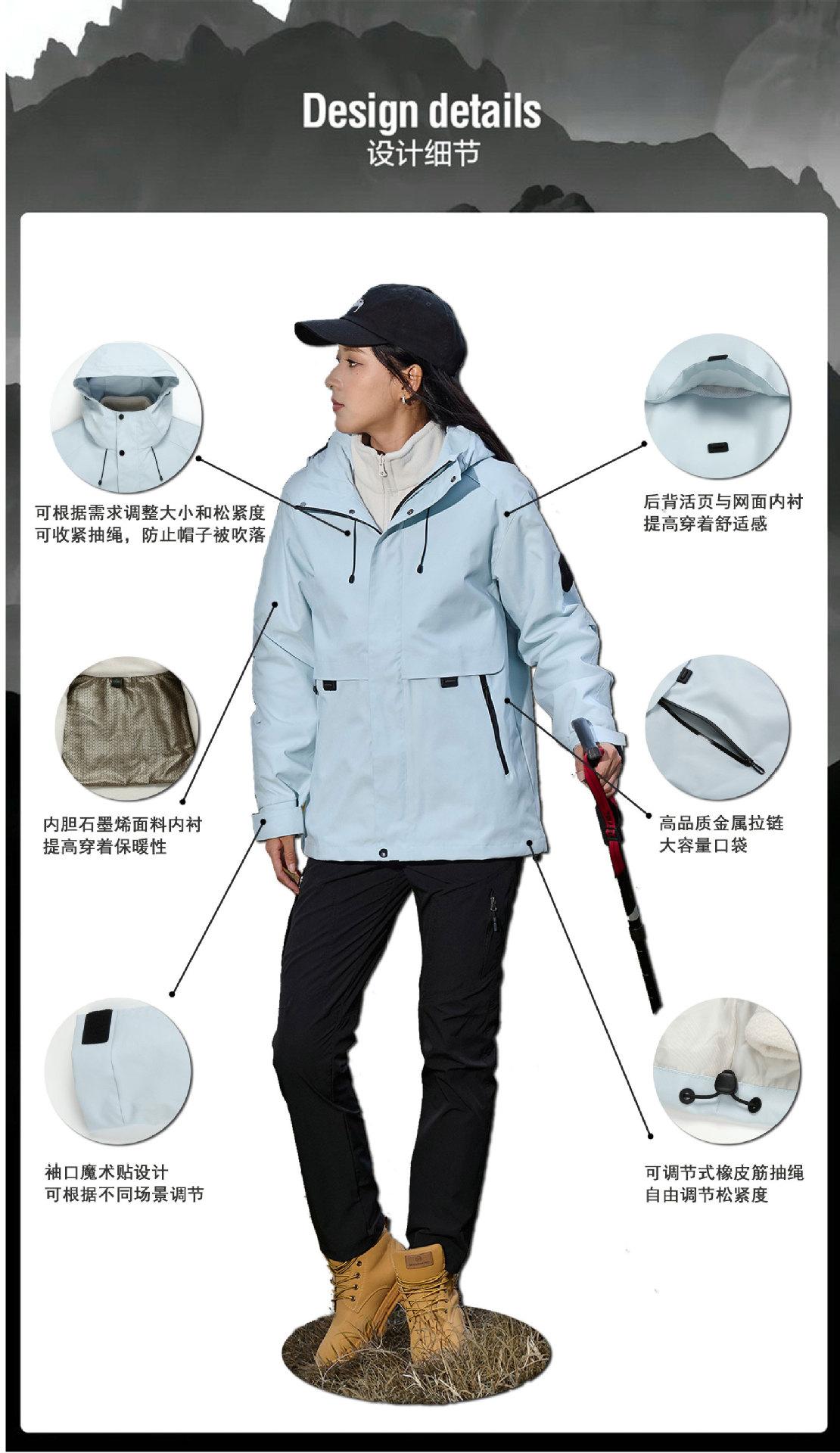 Roupa de trabalho para montanhismo impermeável à prova de vento três em um para inverno ao ar livre para homens e mulheres conjunto de duas peças destacável de grafeno