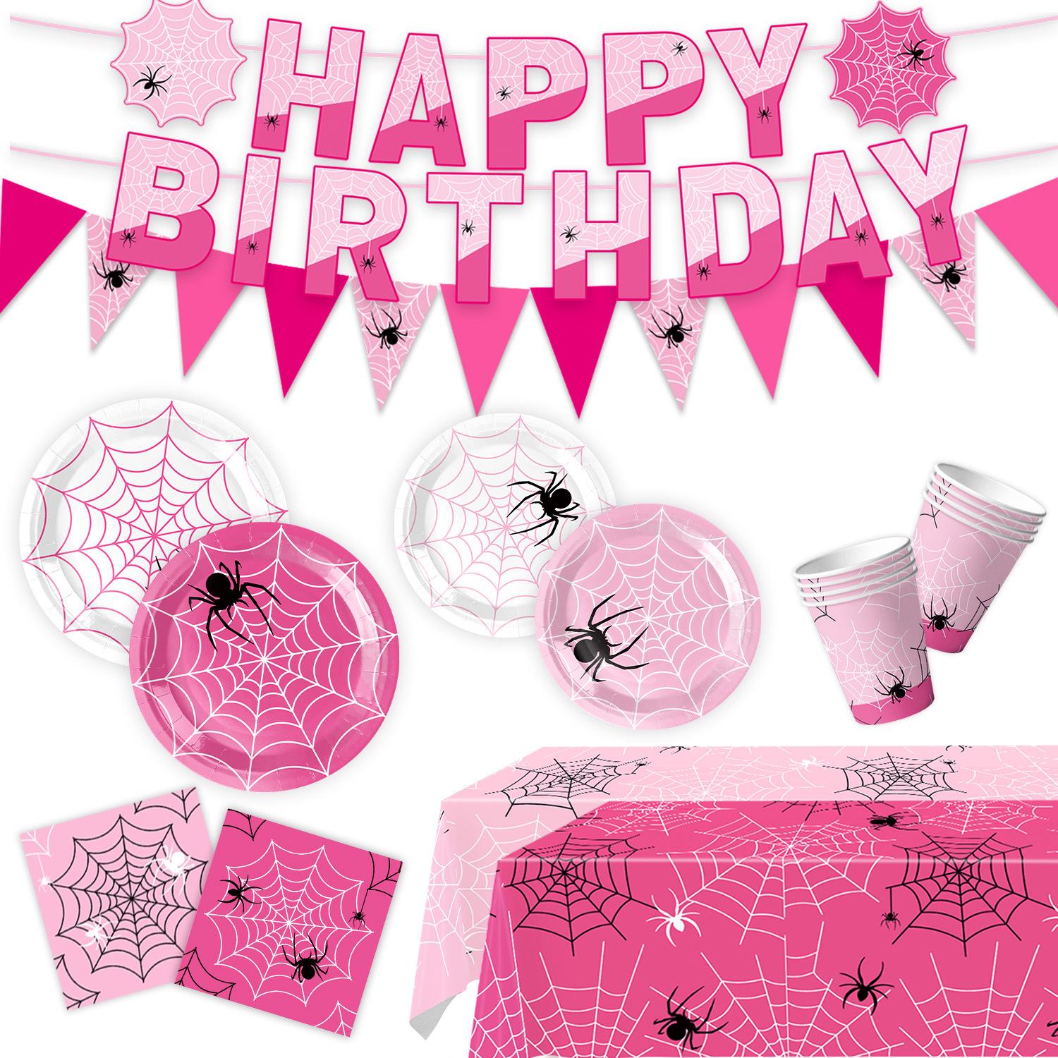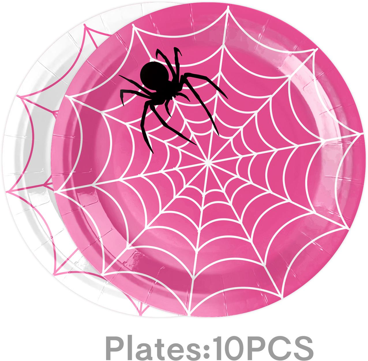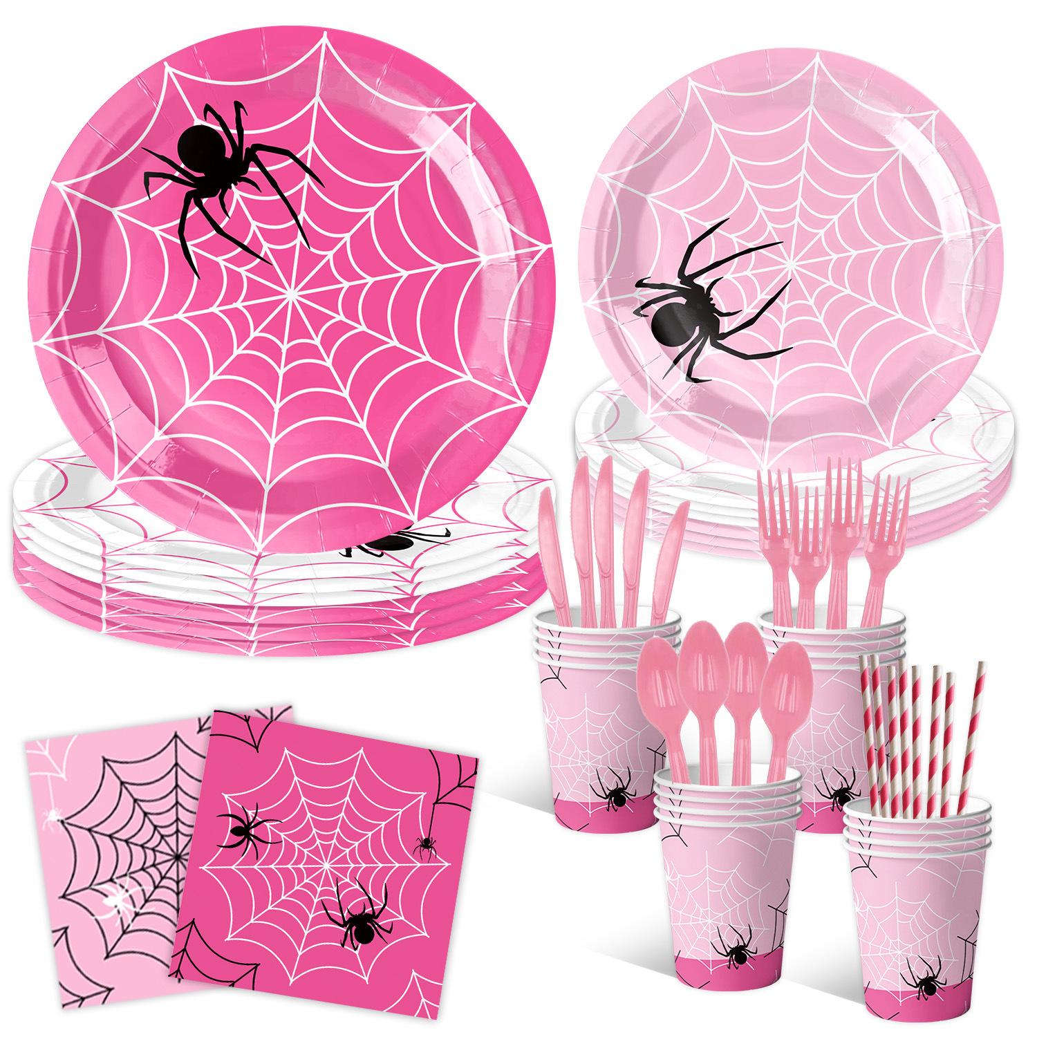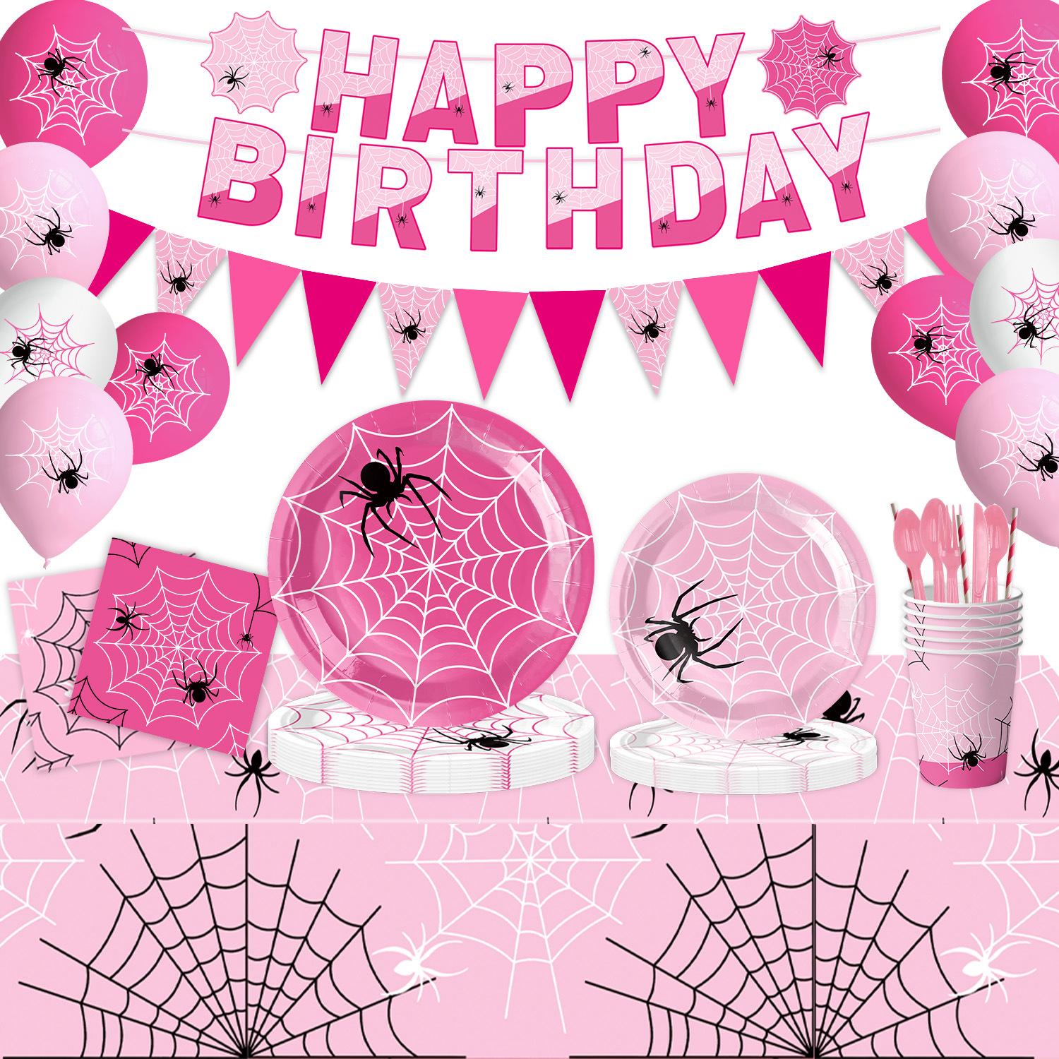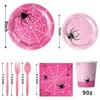Halloween Transfronteiriço Tema Teia de Aranha Rosa Louça de Mesa para Festa de Aniversário Pratos de Papel Copos de Papel Bandeirola Balão Suprimentos para Pendurar