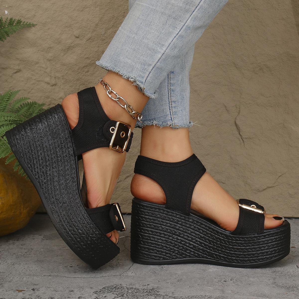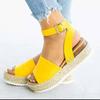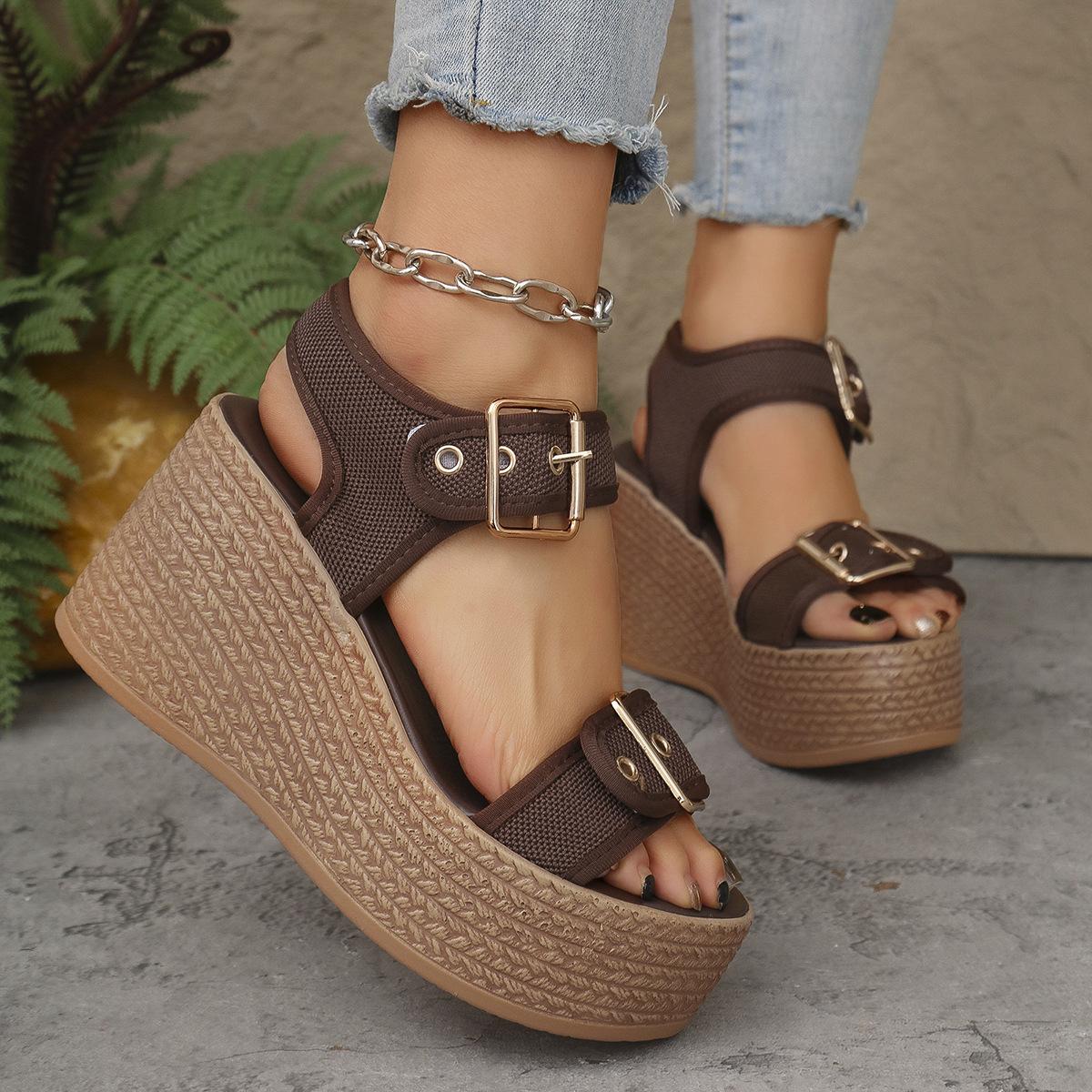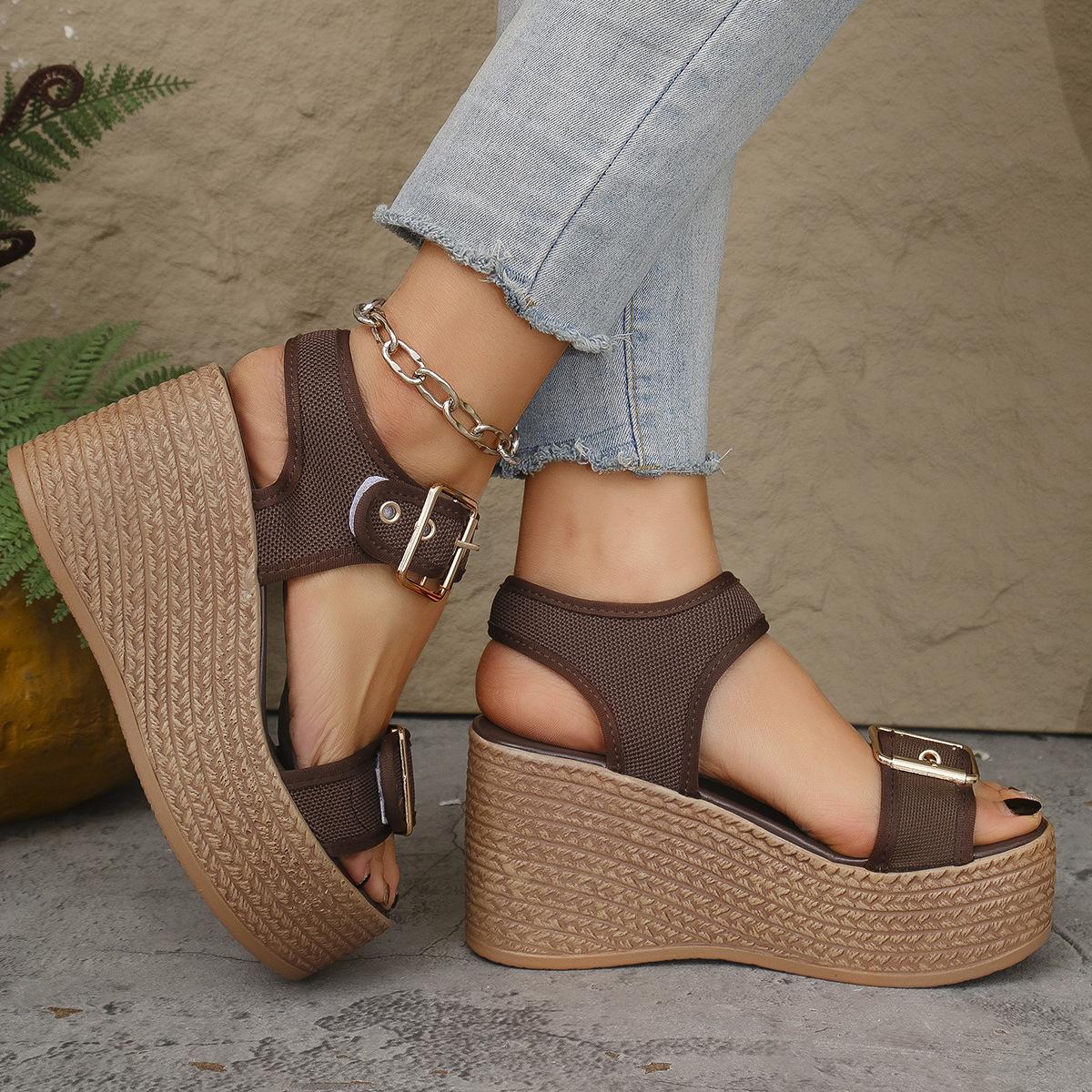 Sandálias de Comércio Exterior Europeu e Americano Sandálias Femininas Verão Novo Estilo Salto Anabela Solado Grosso Sandálias Tecidas em Palha Salto Alto Sapatos Femininos Moda Boca de Peixe Sandálias Casuais