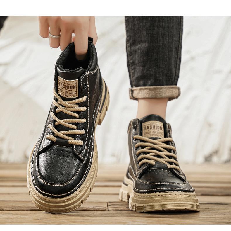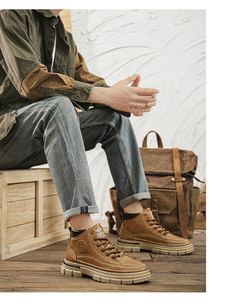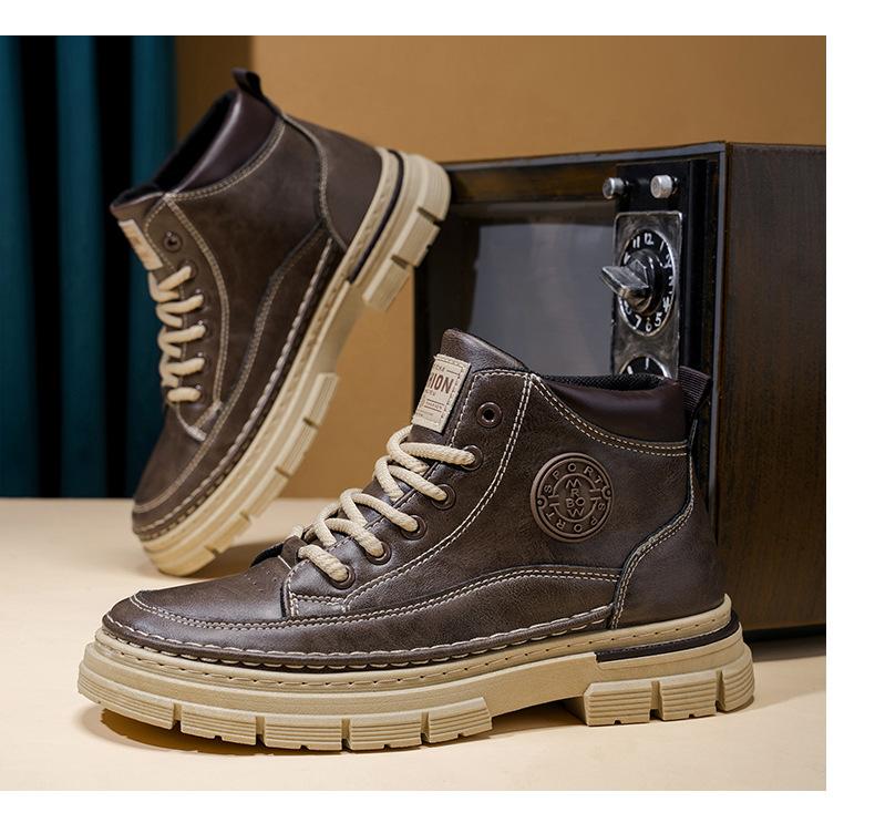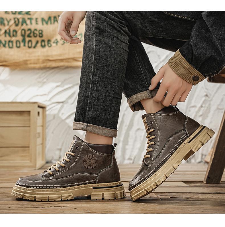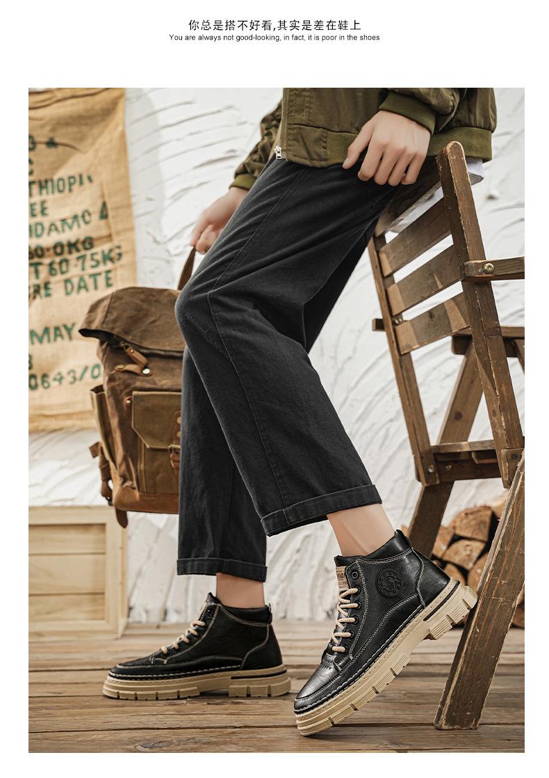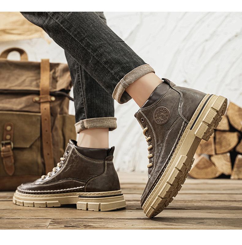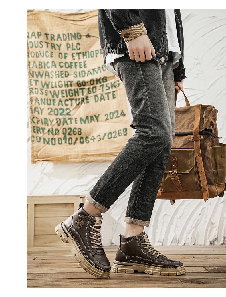 Botas Masculinas Cano Alto Outono Estilo Britânico Retrô Couro Genuíno Sapatos Casuais de Couro Masculinos Cano Médio com Aumento Impermeáveis Botas de Trabalho