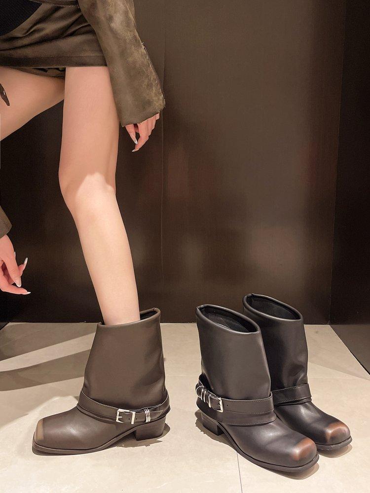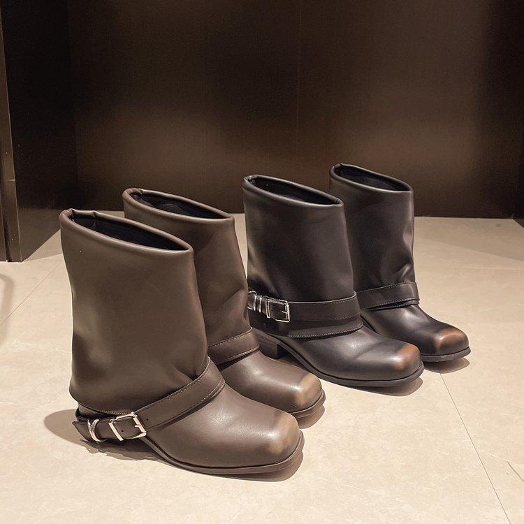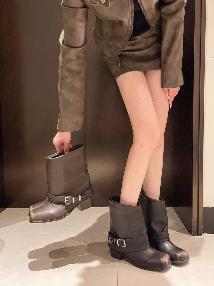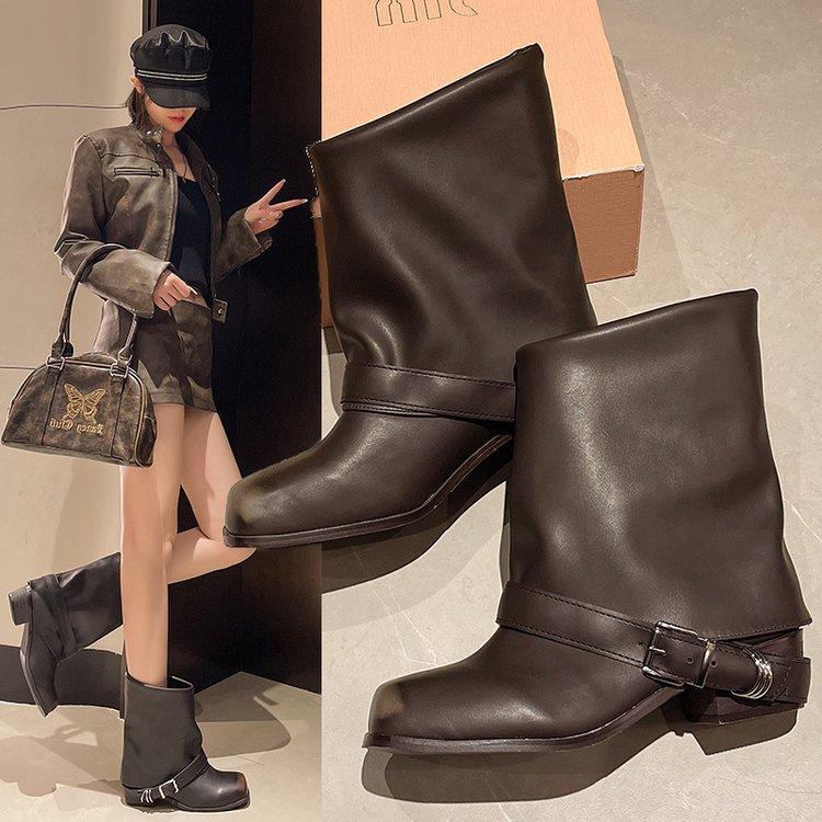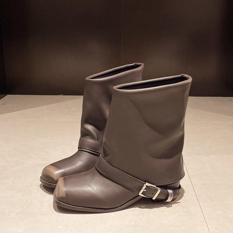 Estilo Celebridade Calças Hot Girl Botas de Cano Moda Estilo Wasteland Enrugadas Tira com Fivela Botas Cowboy Ocidentais Botins