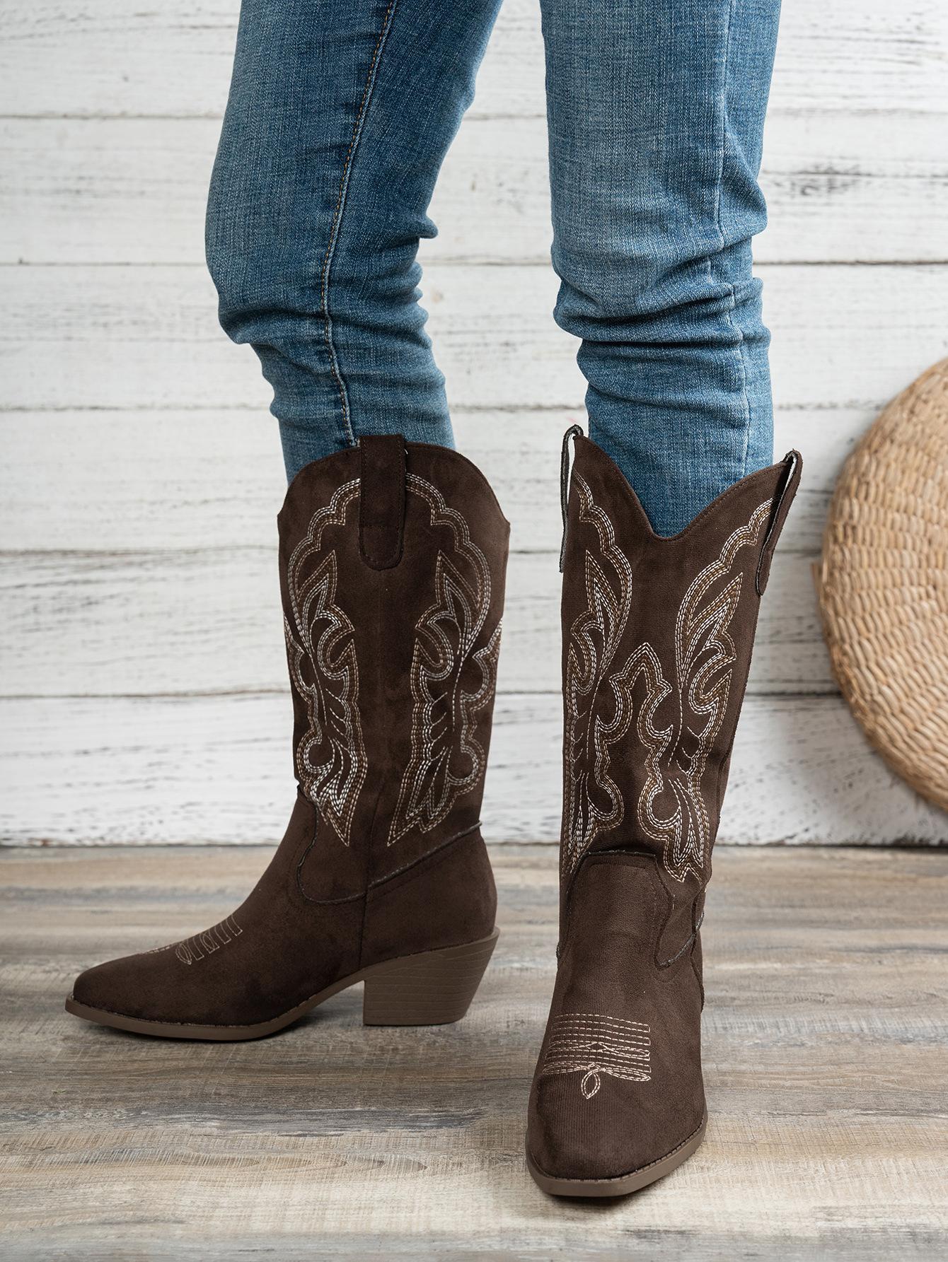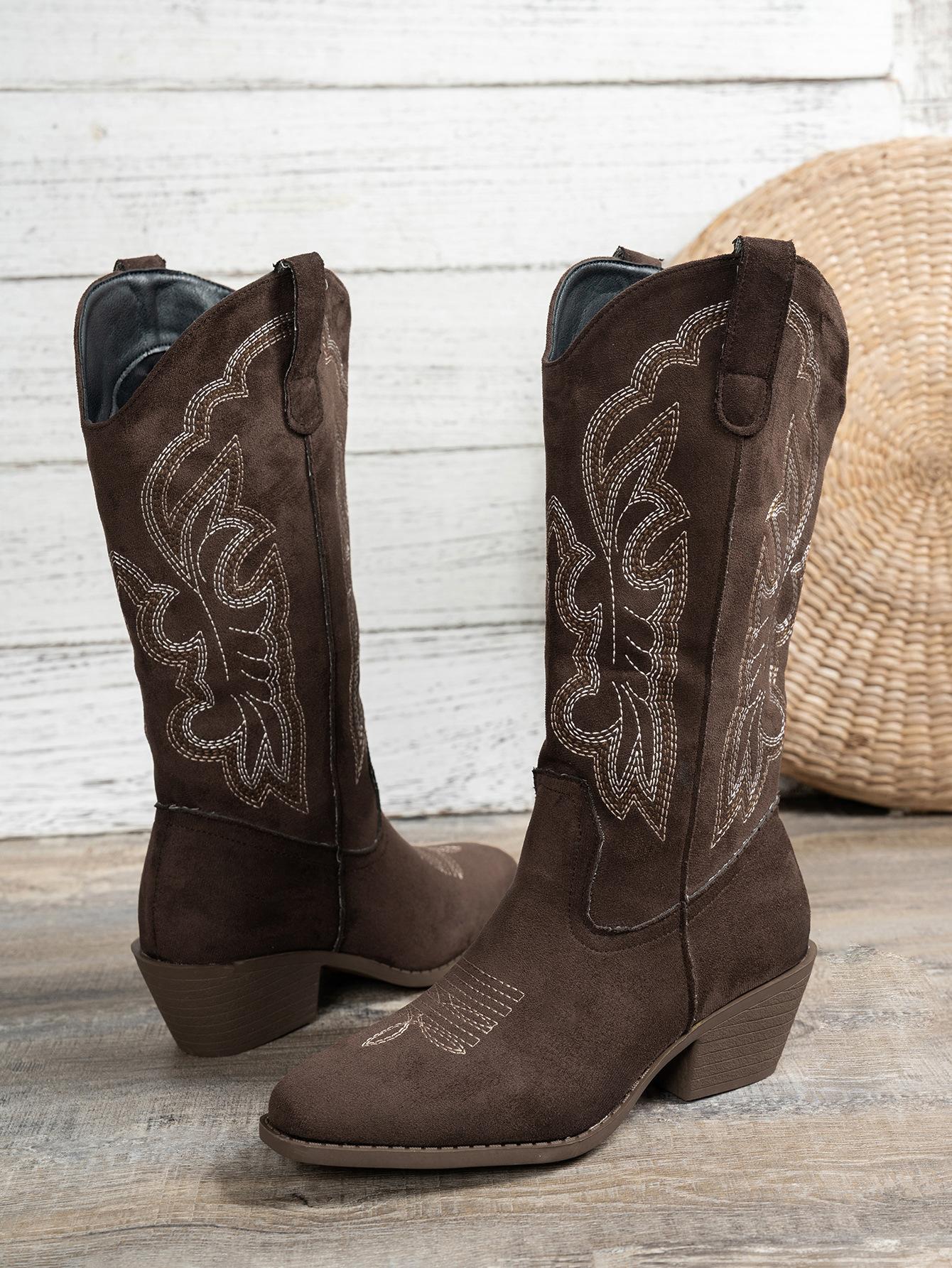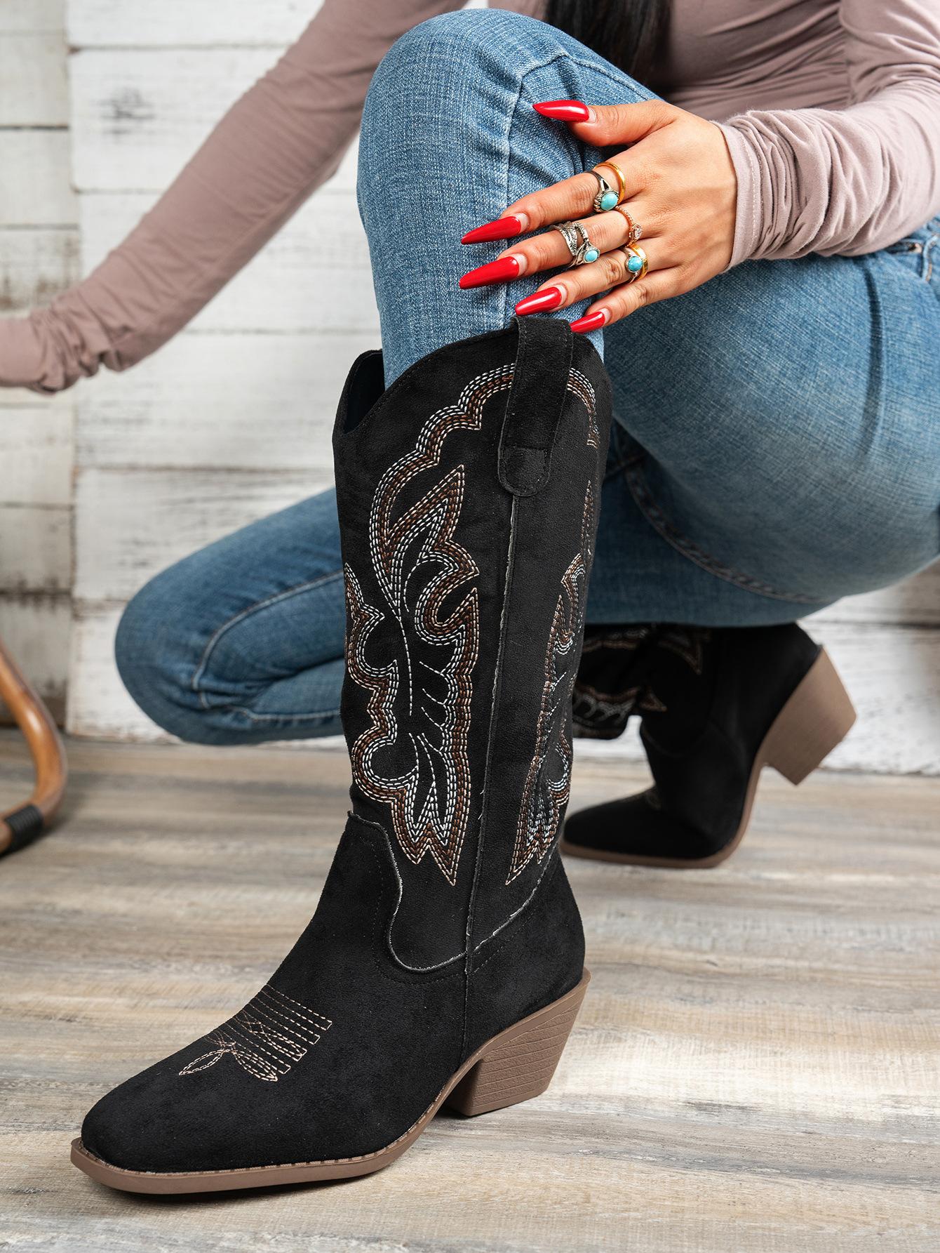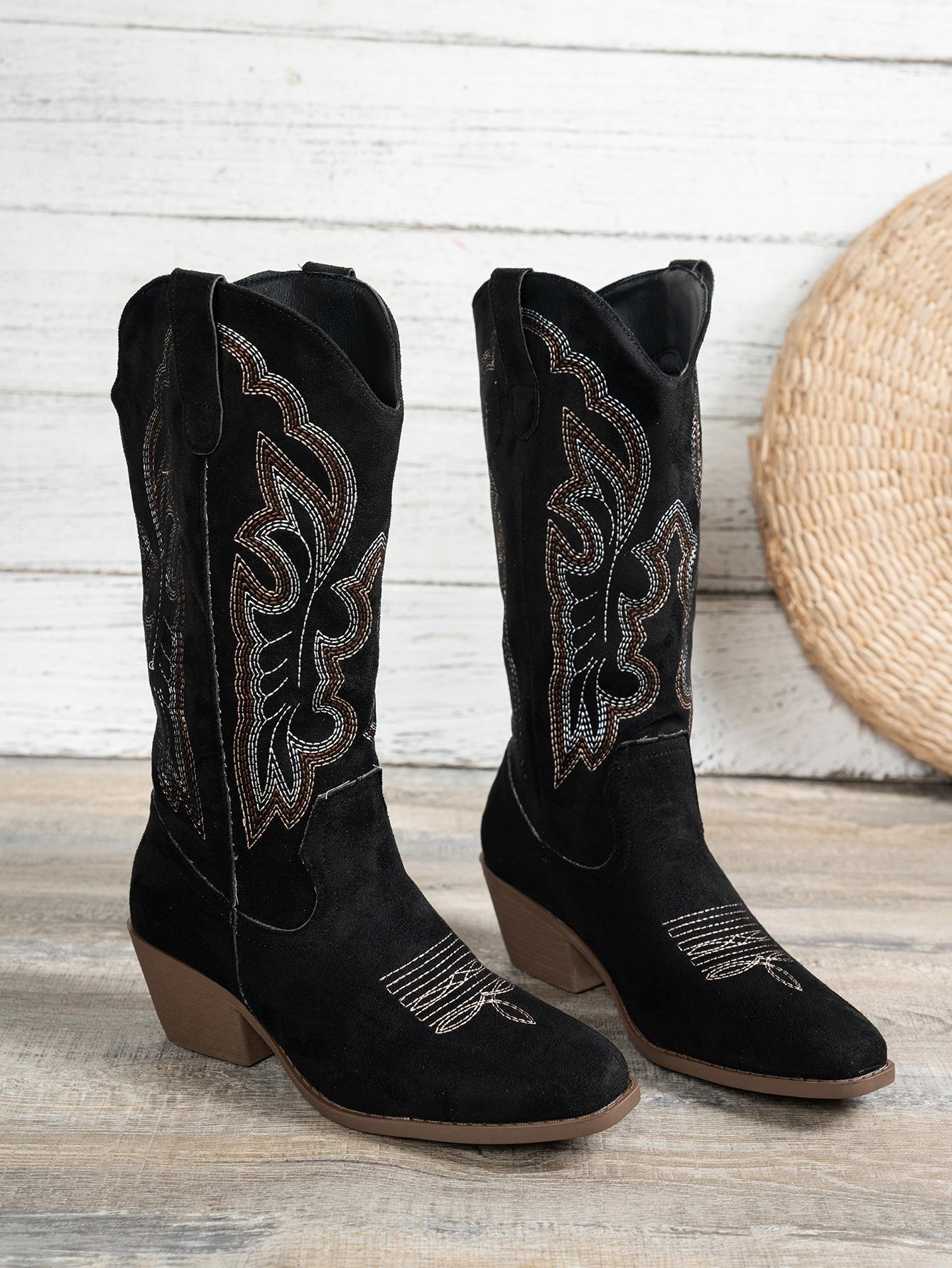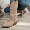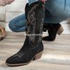 Europeu e Americano Transfronteiriço Ocidental 2025 Botas Femininas Bico Redondo Comércio Exterior Bordado Botas de Couro Pronta Entrega Outono e Inverno Tamanho Grande Atacado Tamanho Grande