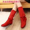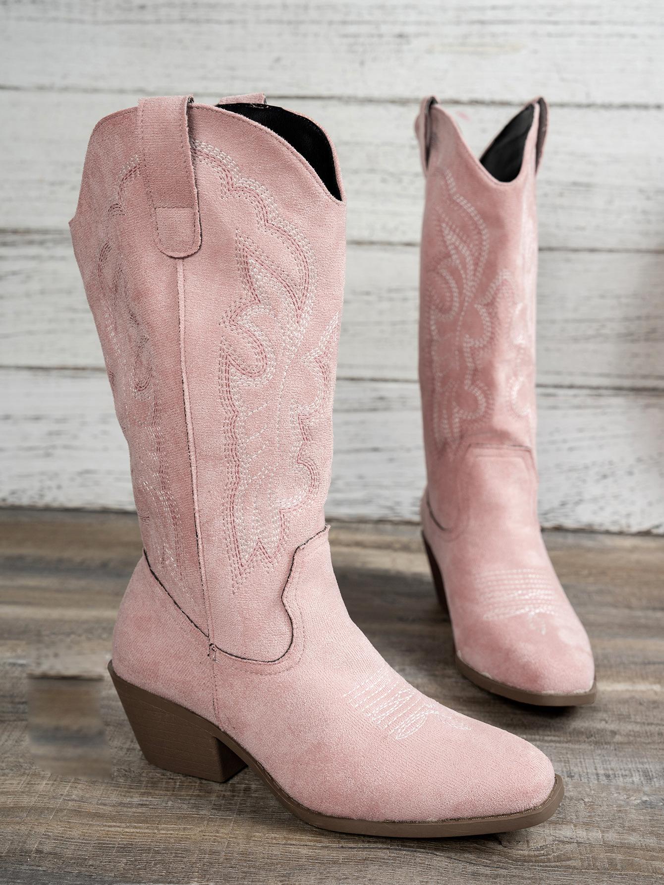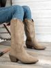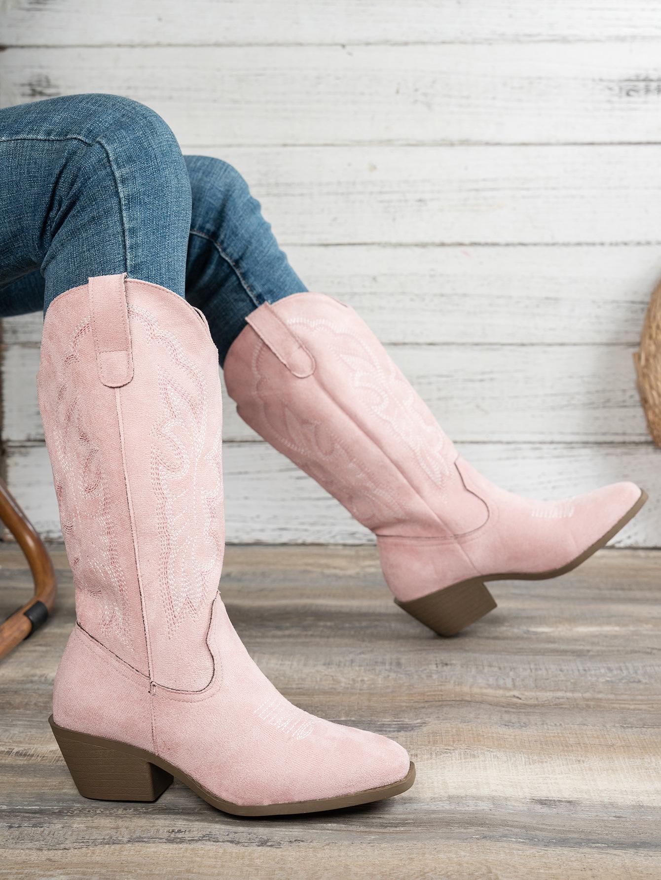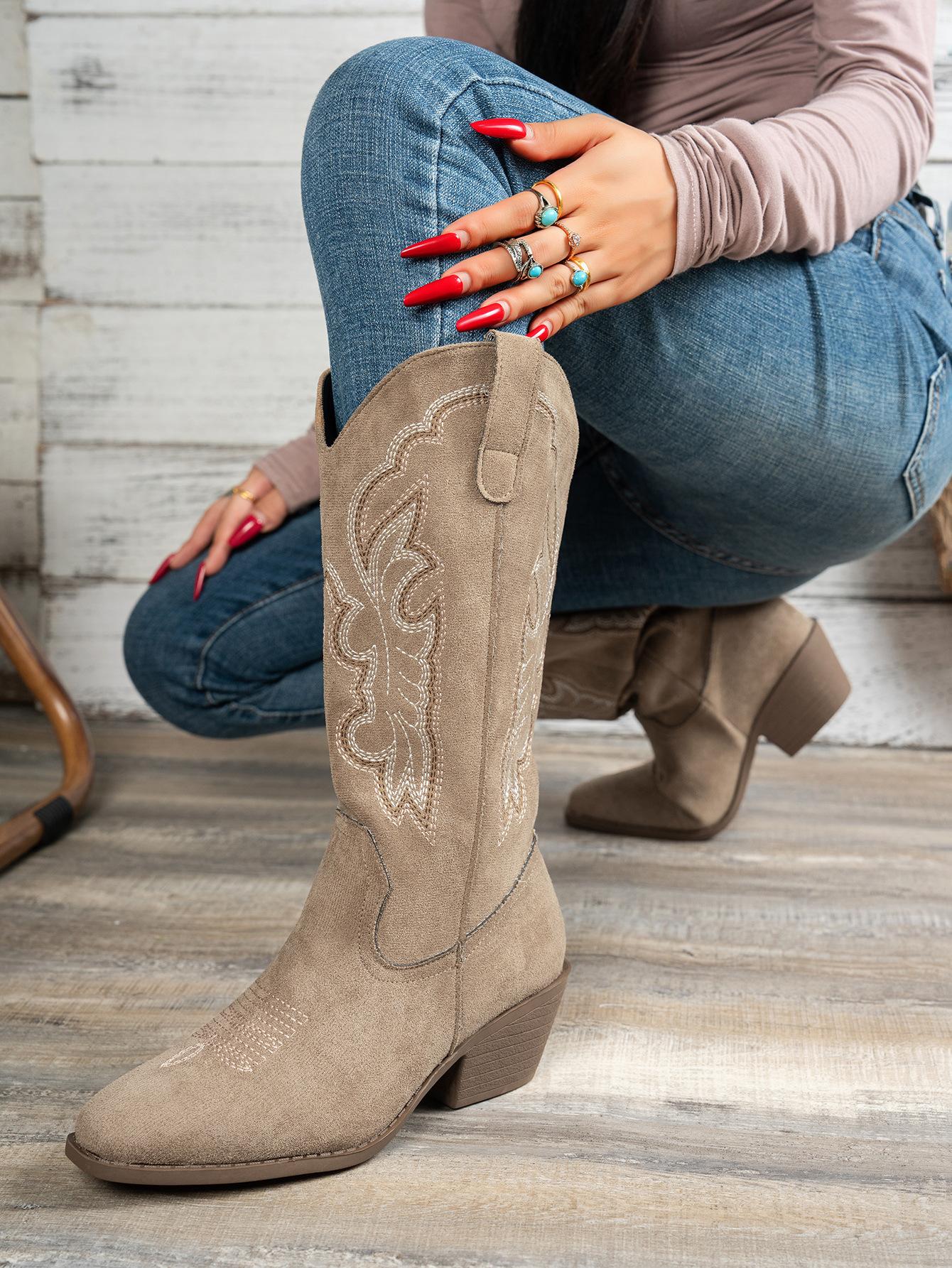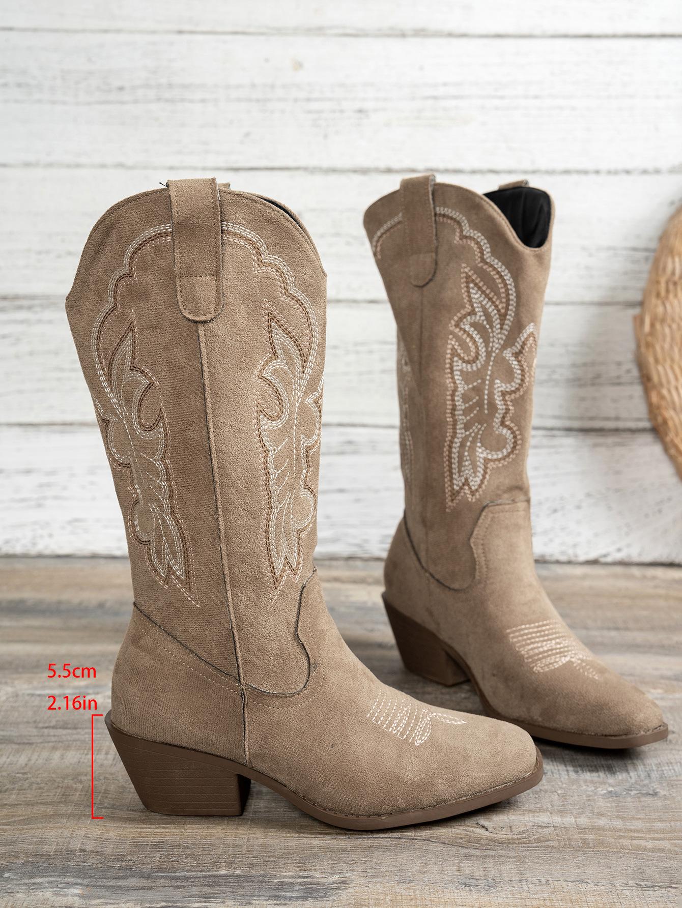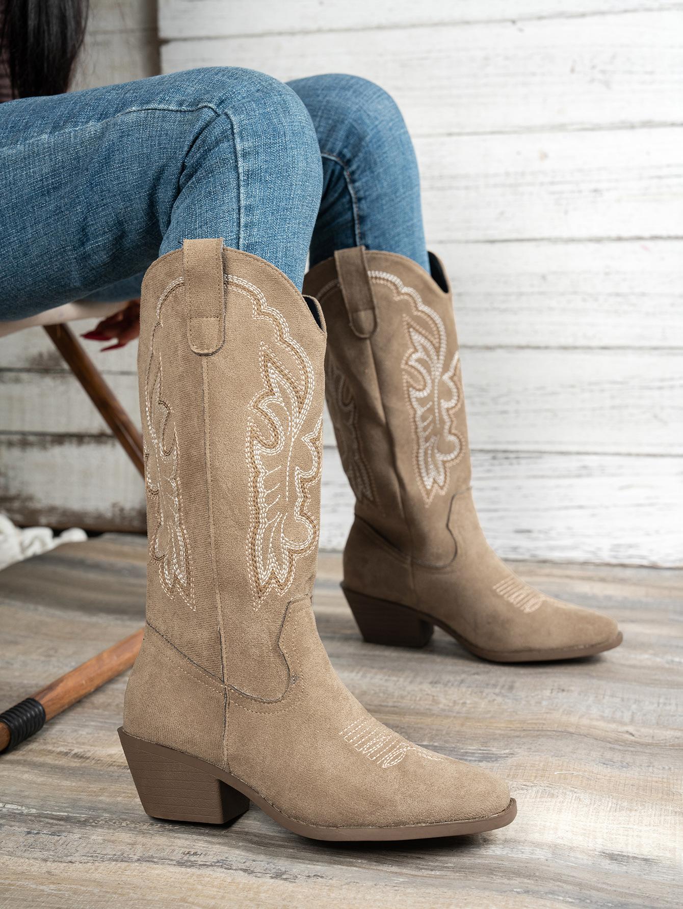 Europeu e Americano Transfronteiriço Ocidental 2025 Botas Femininas Bico Redondo Comércio Exterior Bordado Botas de Couro Pronta Entrega Outono e Inverno Tamanho Grande Atacado Tamanho Grande