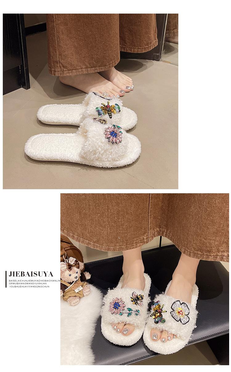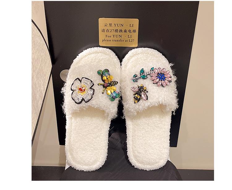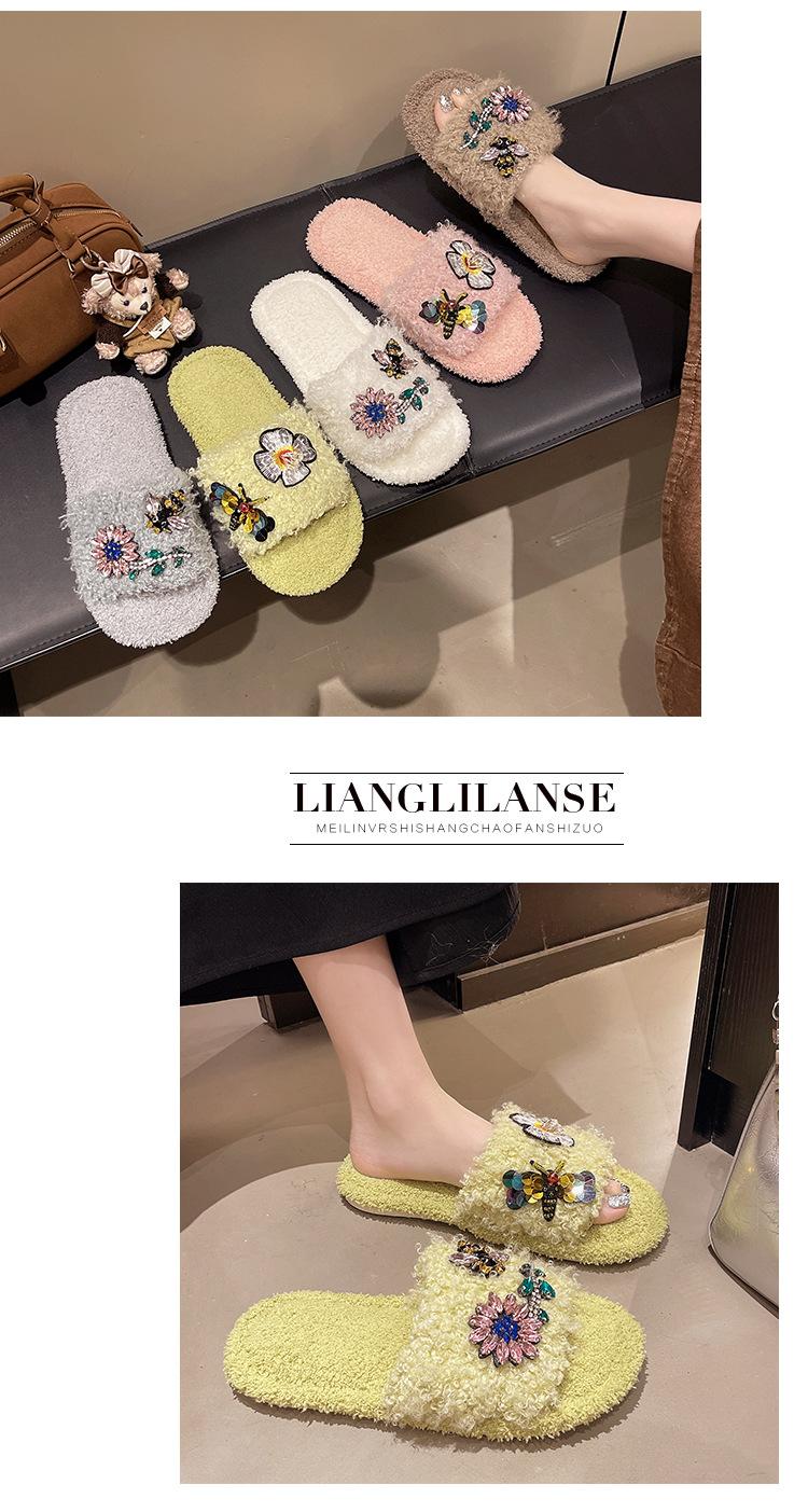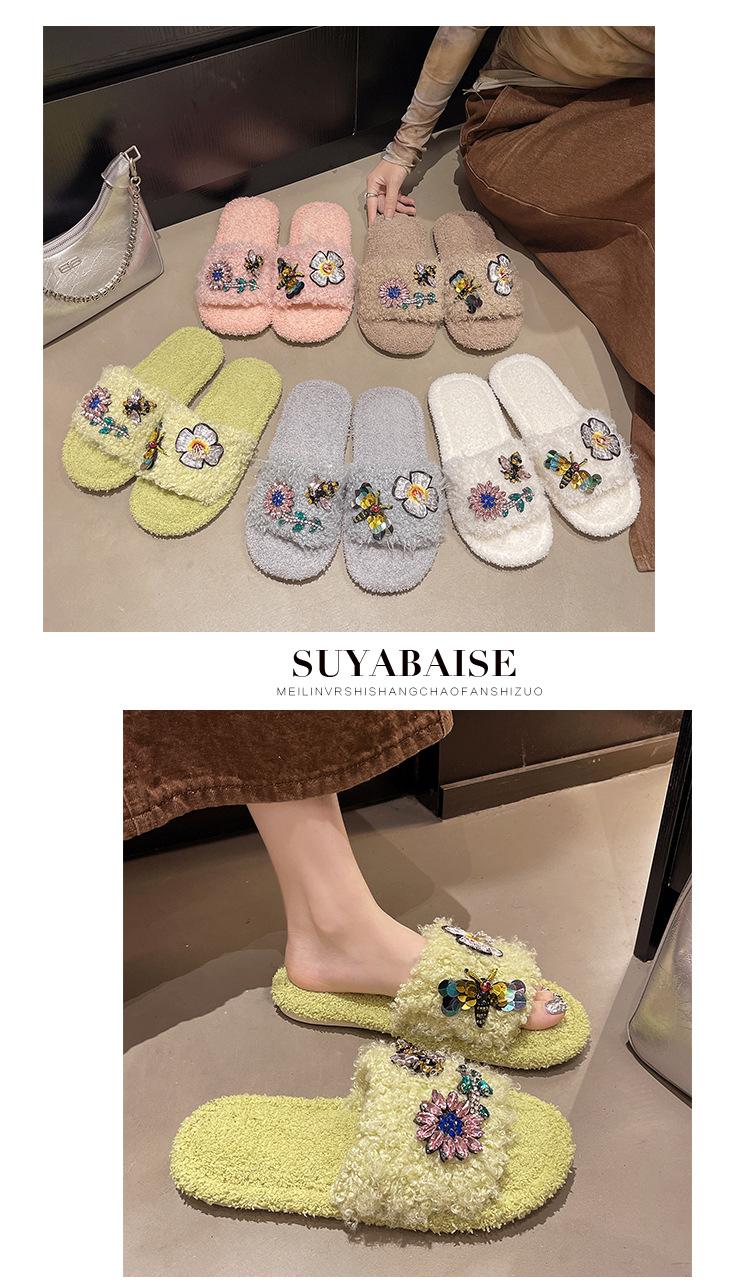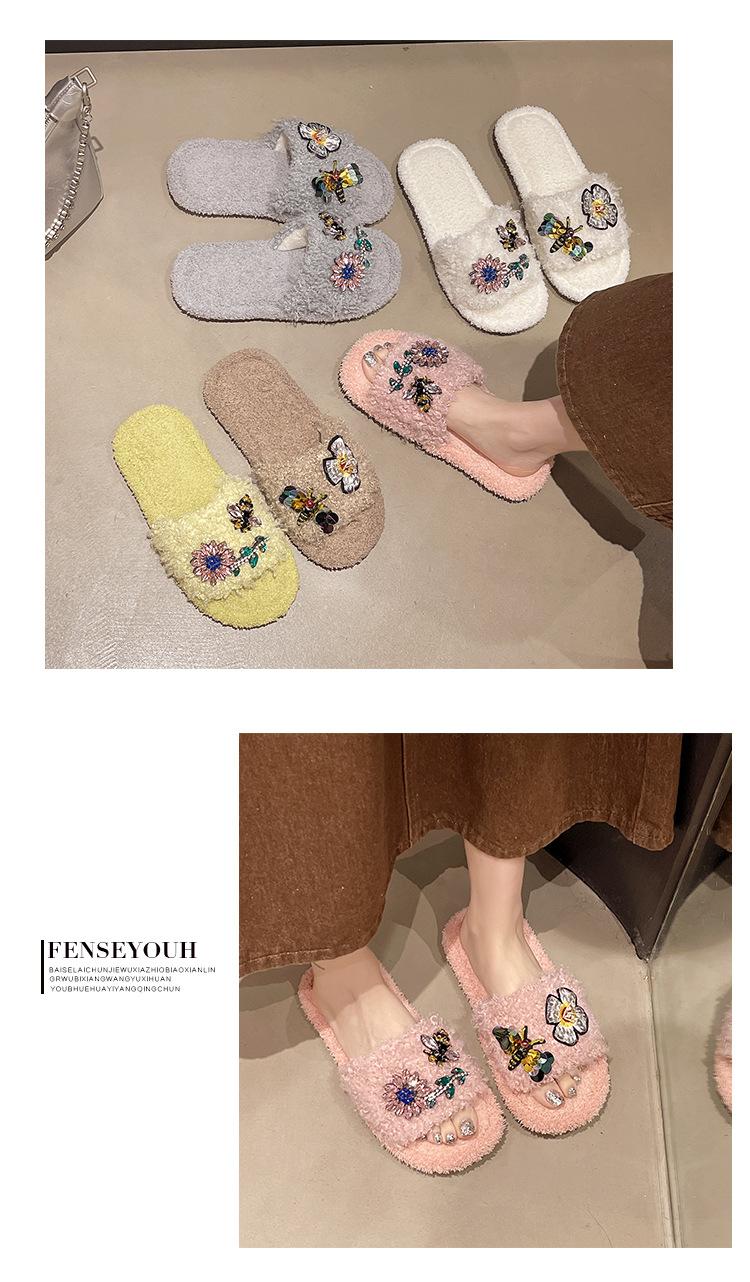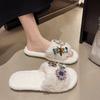 Chinelo Peludo de Inverno Feminino Estilo Coreano Strass Abelha Flor Chinelo de Casa Preguiçoso Sola Macia Chinelos de Dedo Inverno Exterior Antiderrapante Algodão