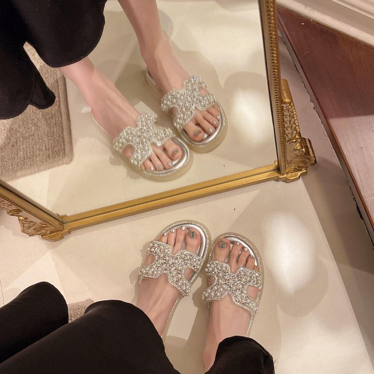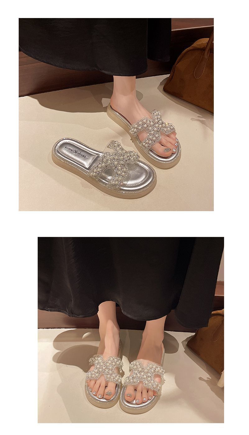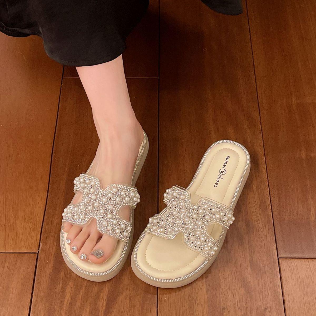 Chinelo Rasteiro Fashion Sola Grossa Pérola 2025 Novo Estilo com Vestido Fada Praia Slides de Uma Tira Uso Externo Mulher Verão